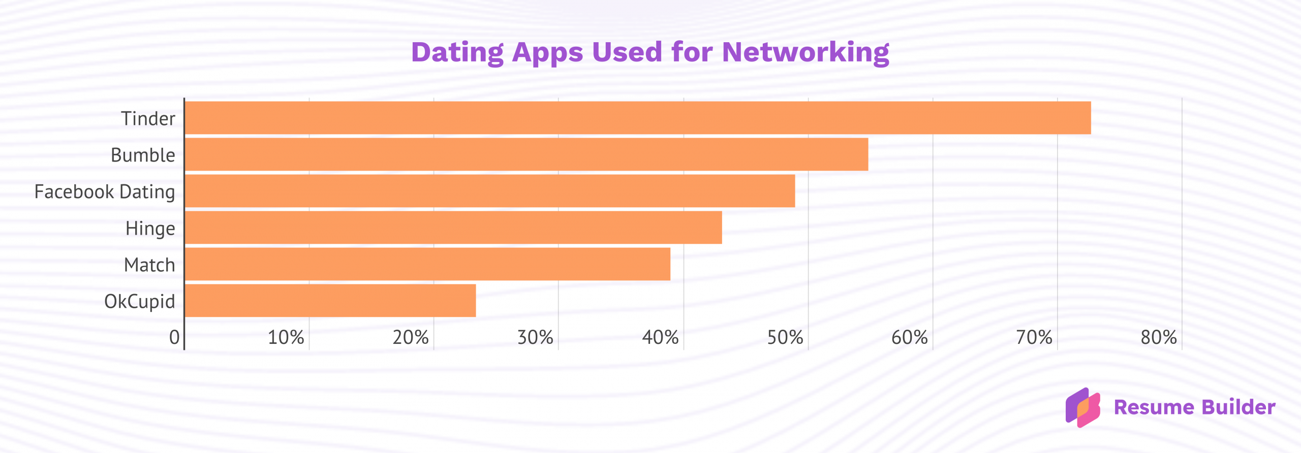 The most common platforms for professional networking are Tinder, Bumble, and Facebook Dating. The trend is consistent across age groups, with 35% of dating app users ages 18 to 28, 34% of those 29 to 44, and 33% of those 45 to 55 reporting that they used dating apps for job-related purposes.