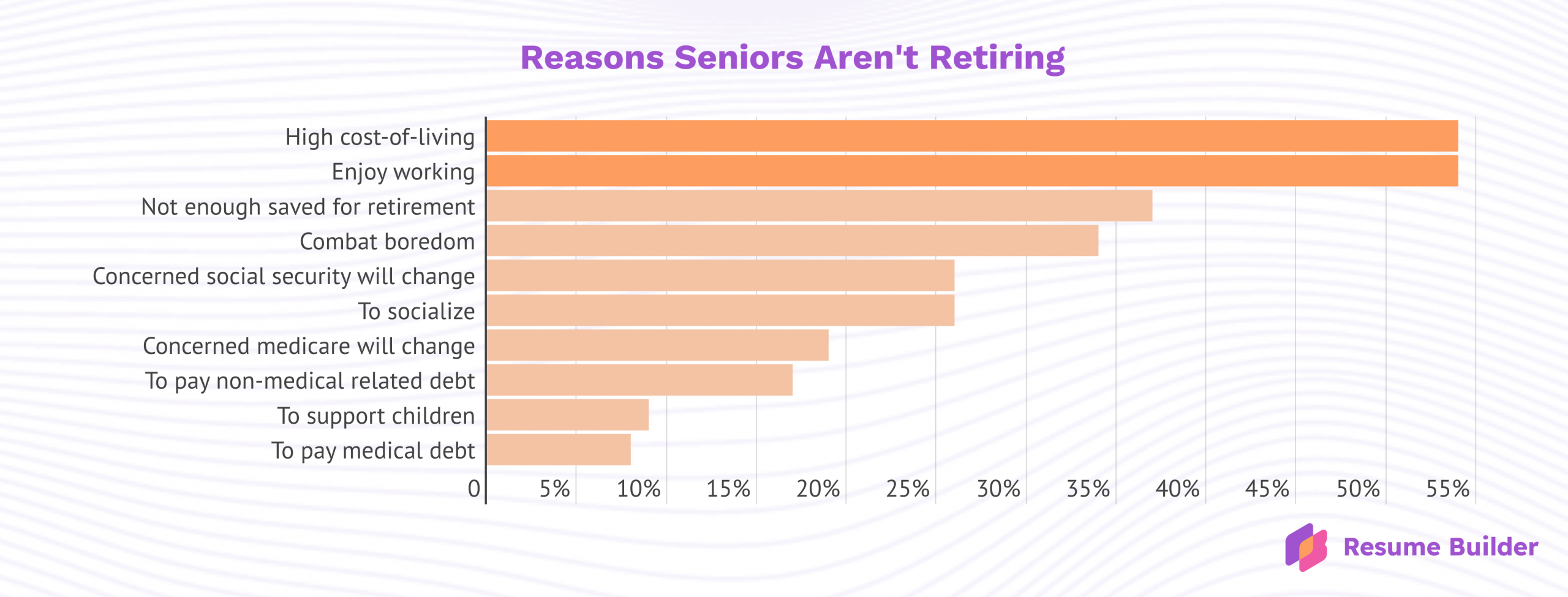 When asked why they are continuing to work or returning to work, seniors most commonly cite enjoying work (54%) and the high cost of living (54%). Financial insecurity also plays a role, with 37% saying they have not saved enough for retirement. Other reasons include combating boredom (34%), concerns about potential changes to Social Security (26%), and worries about changes to Medicare (19%).