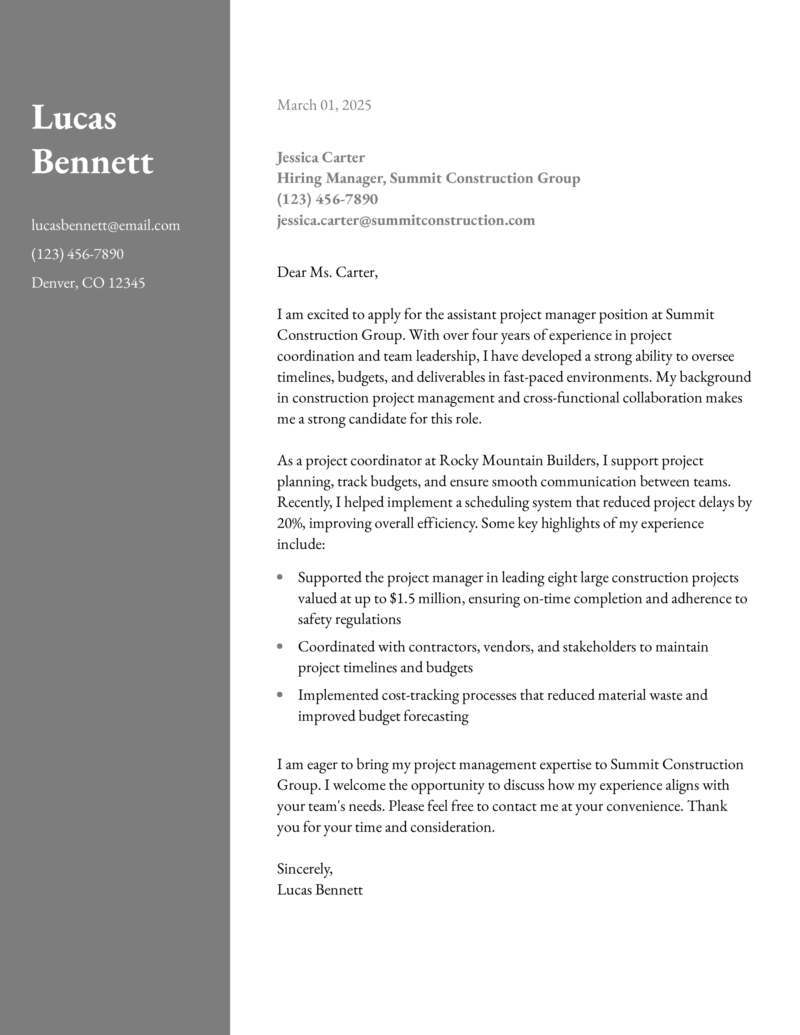 I am excited to apply for the assistant project manager position at Summit Construction Group. With over four years of experience in project coordination and team leadership, I have developed a strong ability to oversee timelines, budgets, and deliverables in fast-paced environments. My background in construction project management and cross-functional collaboration makes me a strong candidate for this role.