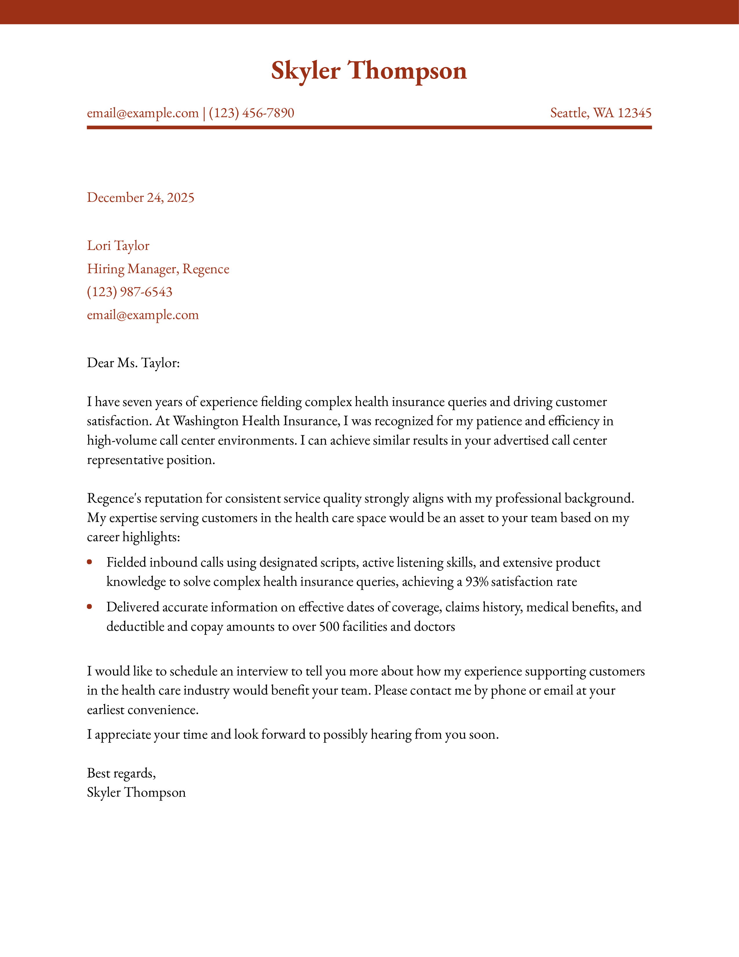 As you can see from my resume, I have seven years of experience fielding complex health insurance queries and driving customer satisfaction. During my time with Washington Health Insurance, I achieved recognition for my professionalism, patience, and efficiency in high-volume call center environments. I can reach similar results for your company in the call center representative position.
