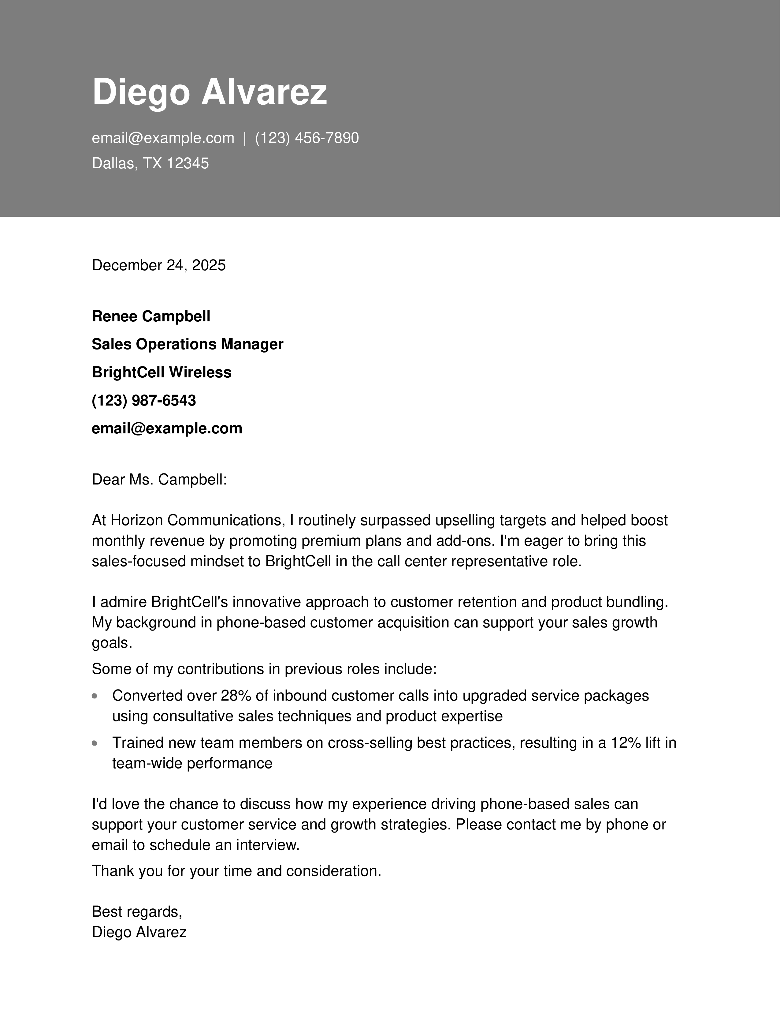 Sales-Focused Call Center Representative Cover Letter