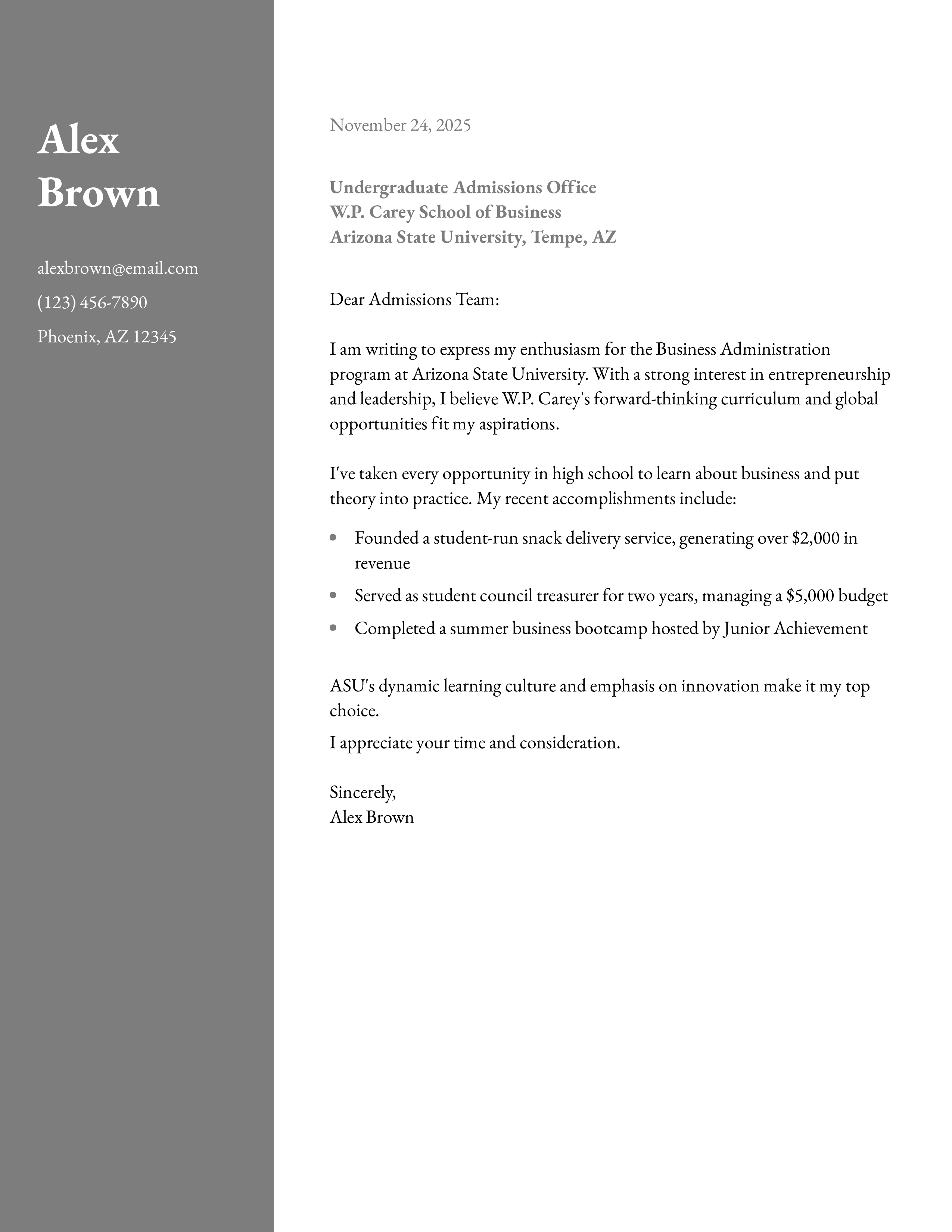 Finally, request an interview for the position. Consider briefly restating your core skills to carry the letter’s focus through the last paragraph. If you’re still in college, you can also use this section to provide any requested details on your course schedule and availability. To end your cover letter, use a simple closing like “Sincerely” or “Best regards” and then your name.