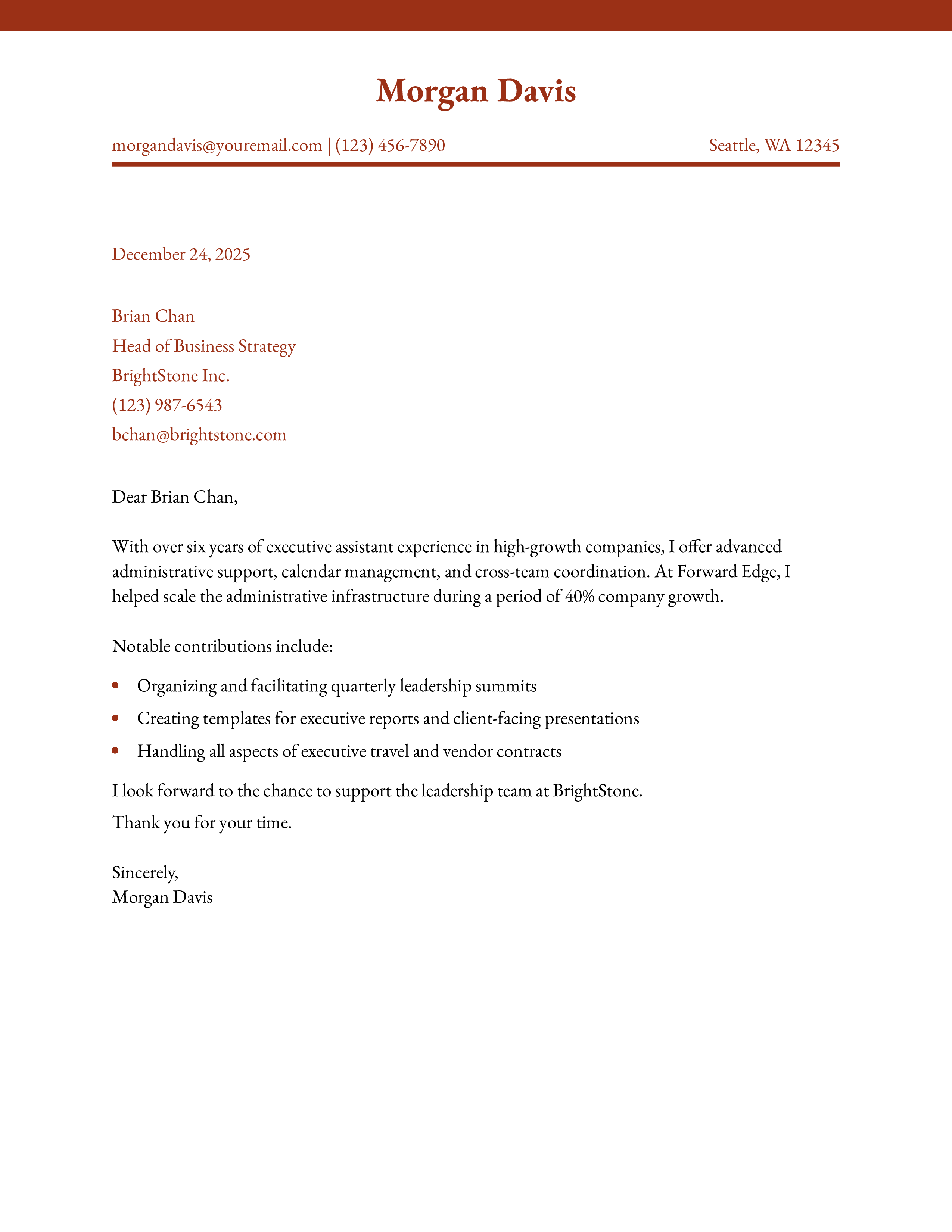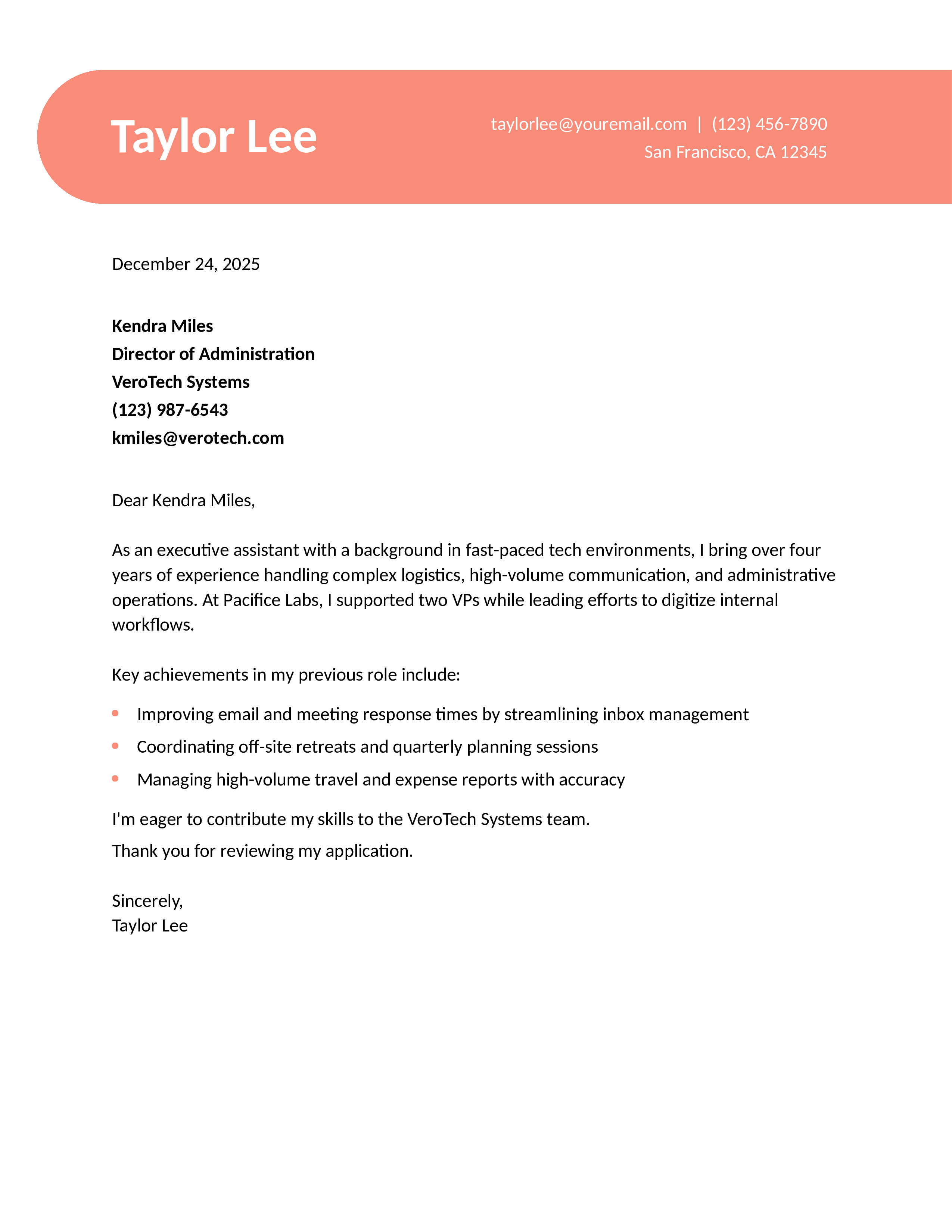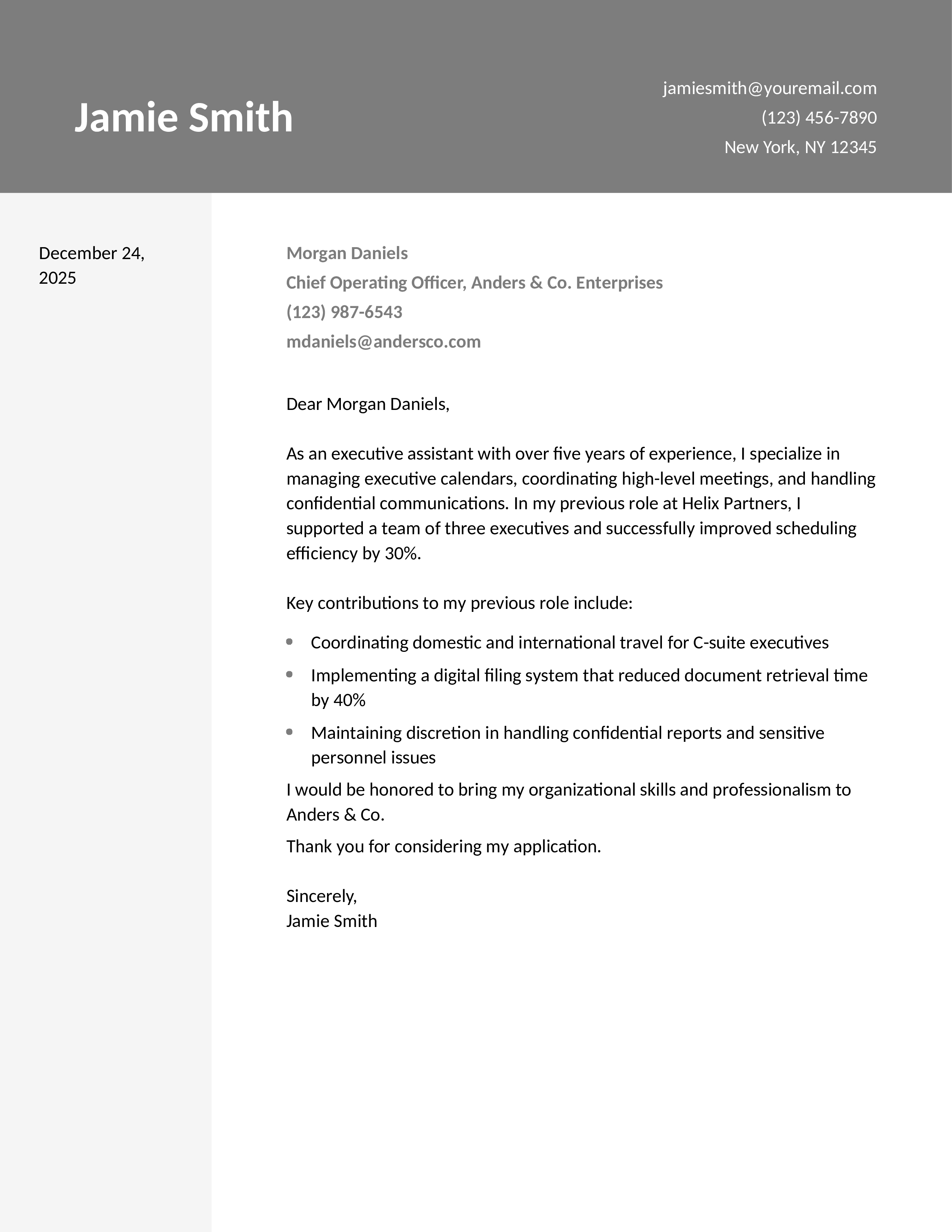 Start your letter strong with an example of your making executives’ workday easier. What’s a key way you’ve helped leaders stay focused and organized at one of your past employers? Choose a highlight you can quantify in terms of a clear number, percentage, or dollar amount. Then, connect this to your main strengths and overall candidacy for the role.