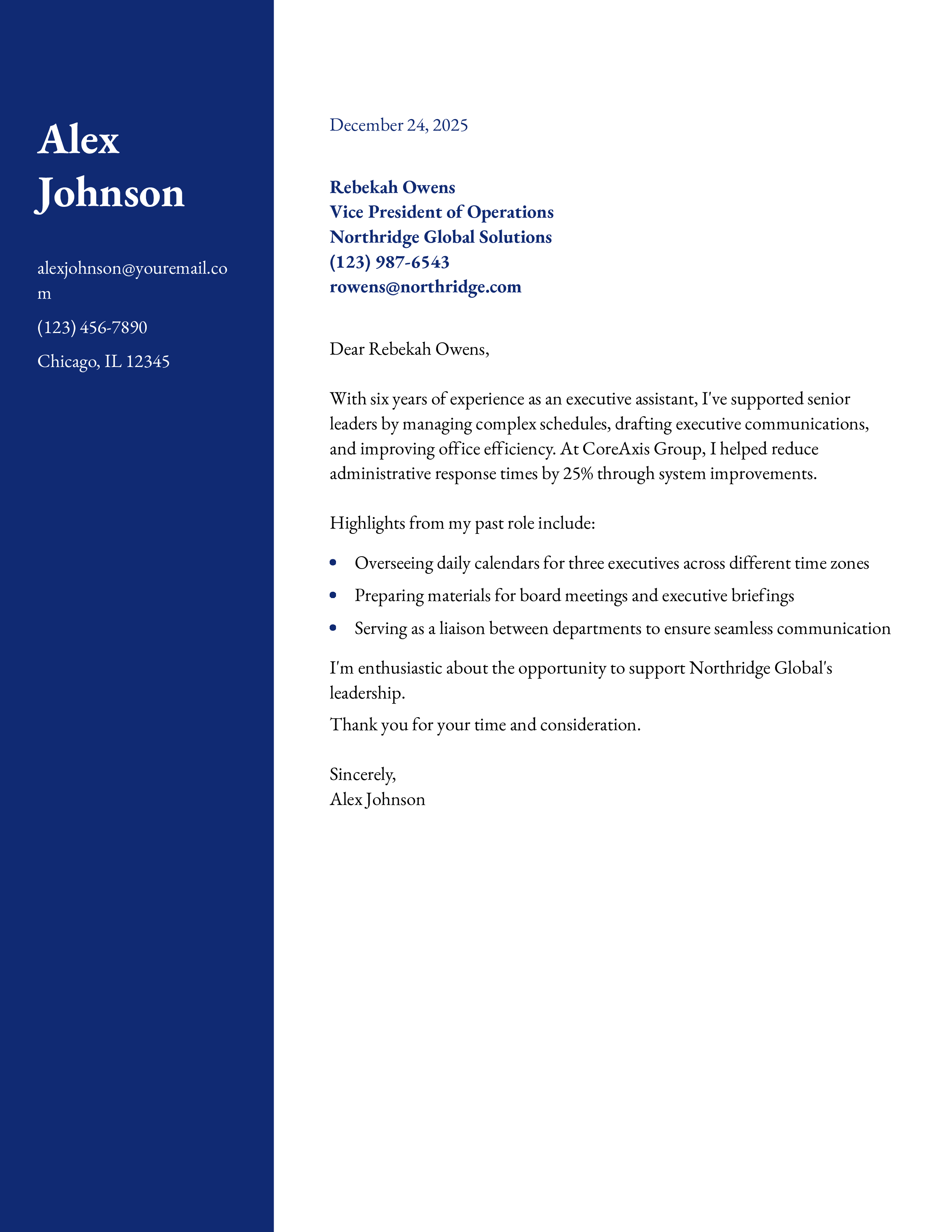 As part of your letter’s body text, add a short list of bullet points to show how you’ve helped streamline or enhance office operations. For instance, maybe you created an internal communications system that lets department leaders share data more quickly. Or perhaps you found cheaper or better options for booking air travel and event venues.