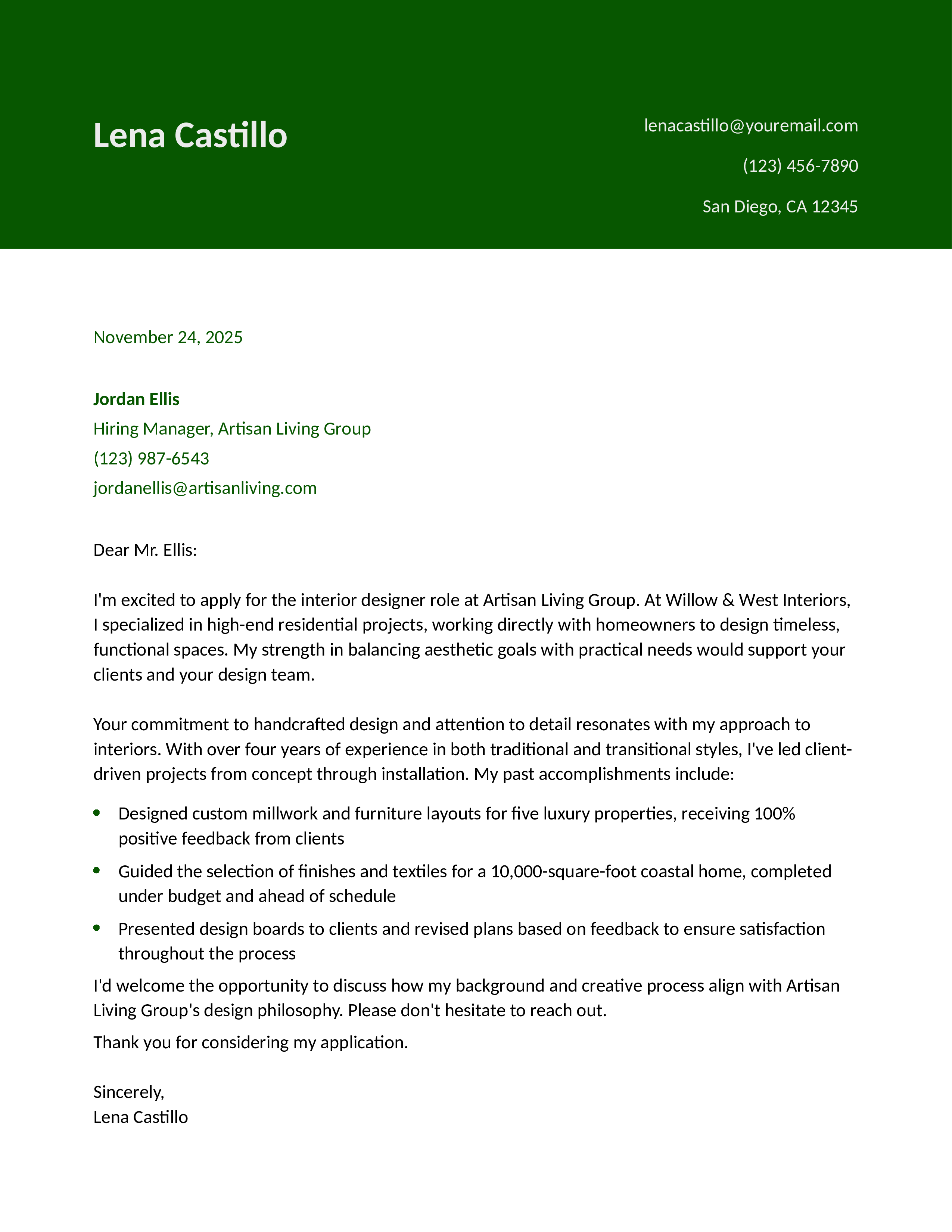 High-End Residential Interior Designer Cover Letter