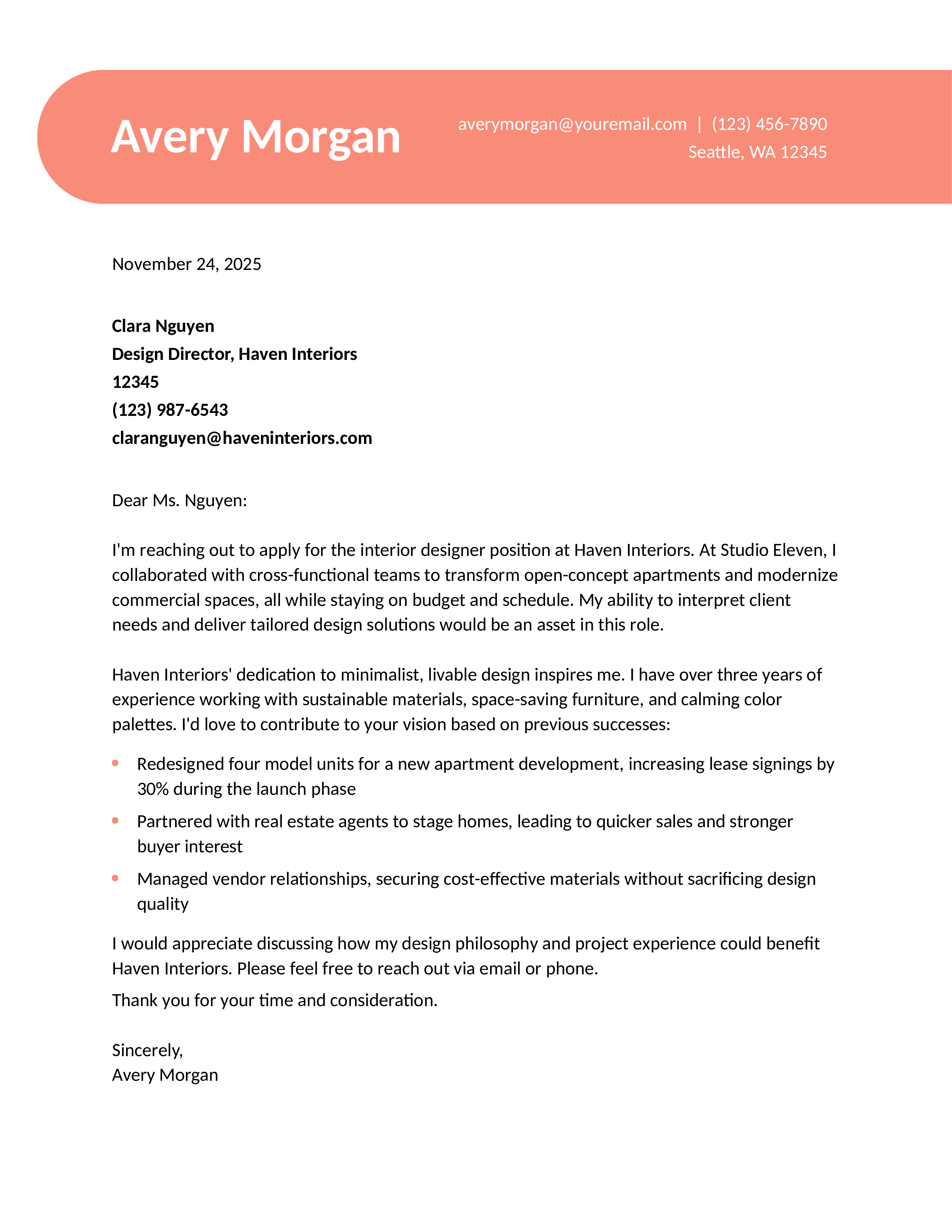 Feature all essential contact information in the header of your interior design cover letter, including your name, phone number, email, and LinkedIn URL. Be sure to address the hiring manager by name — Mr. or Ms. [Last Name]. If you can’t find the hiring manager’s name, use a variation of “Dear Hiring Manager.” It’s best to avoid salutations like “To Whom It May Concern,” as your greeting should be direct and personal.