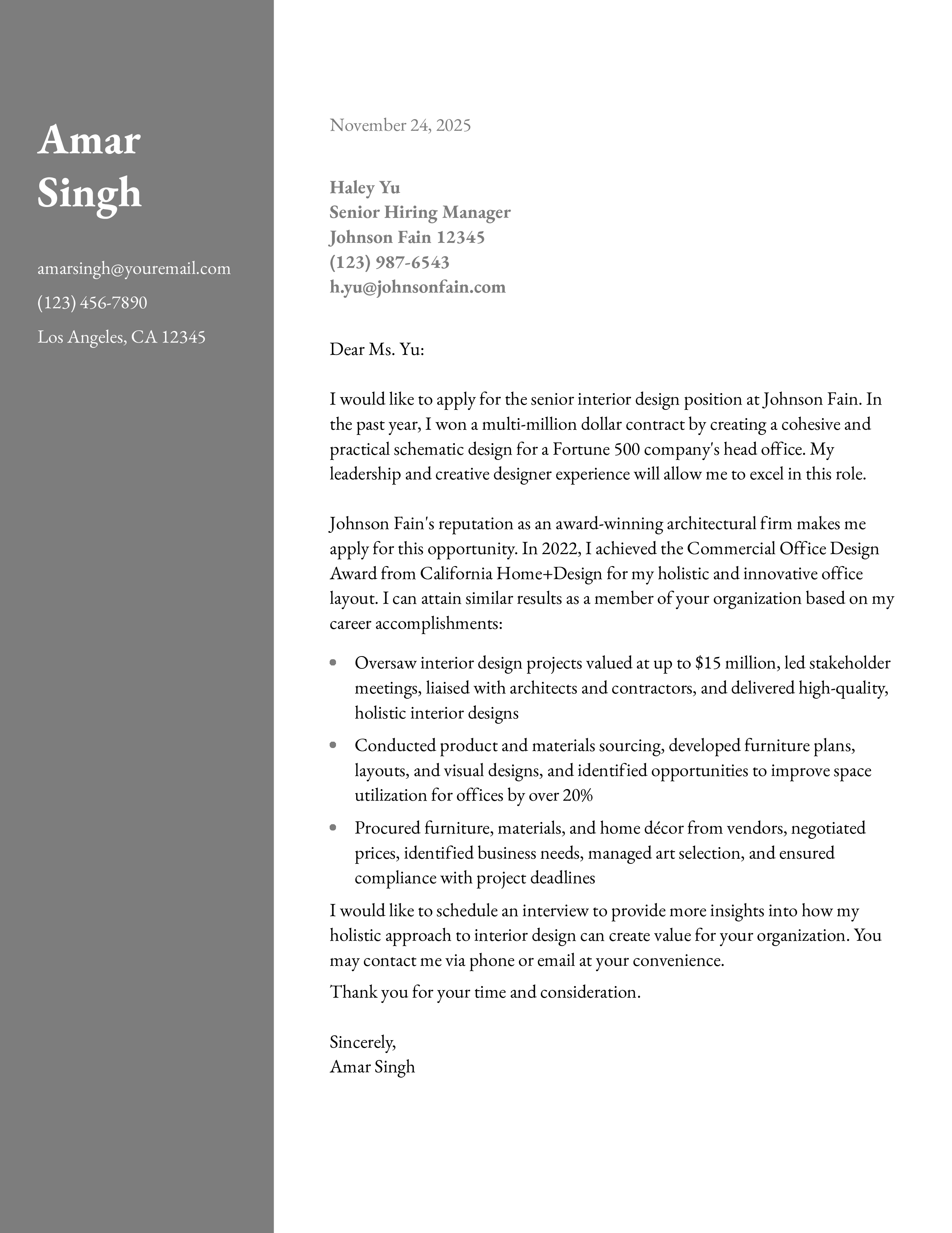 In the example below, the candidate notes a prestigious award they received. This shows their unique ability to innovate, which is highly attractive to potential employers. They also provide hard numbers and metrics to paint a clearer picture of their interior design projects. By following a similar approach, you can maximize the impact of your interior design cover letter.