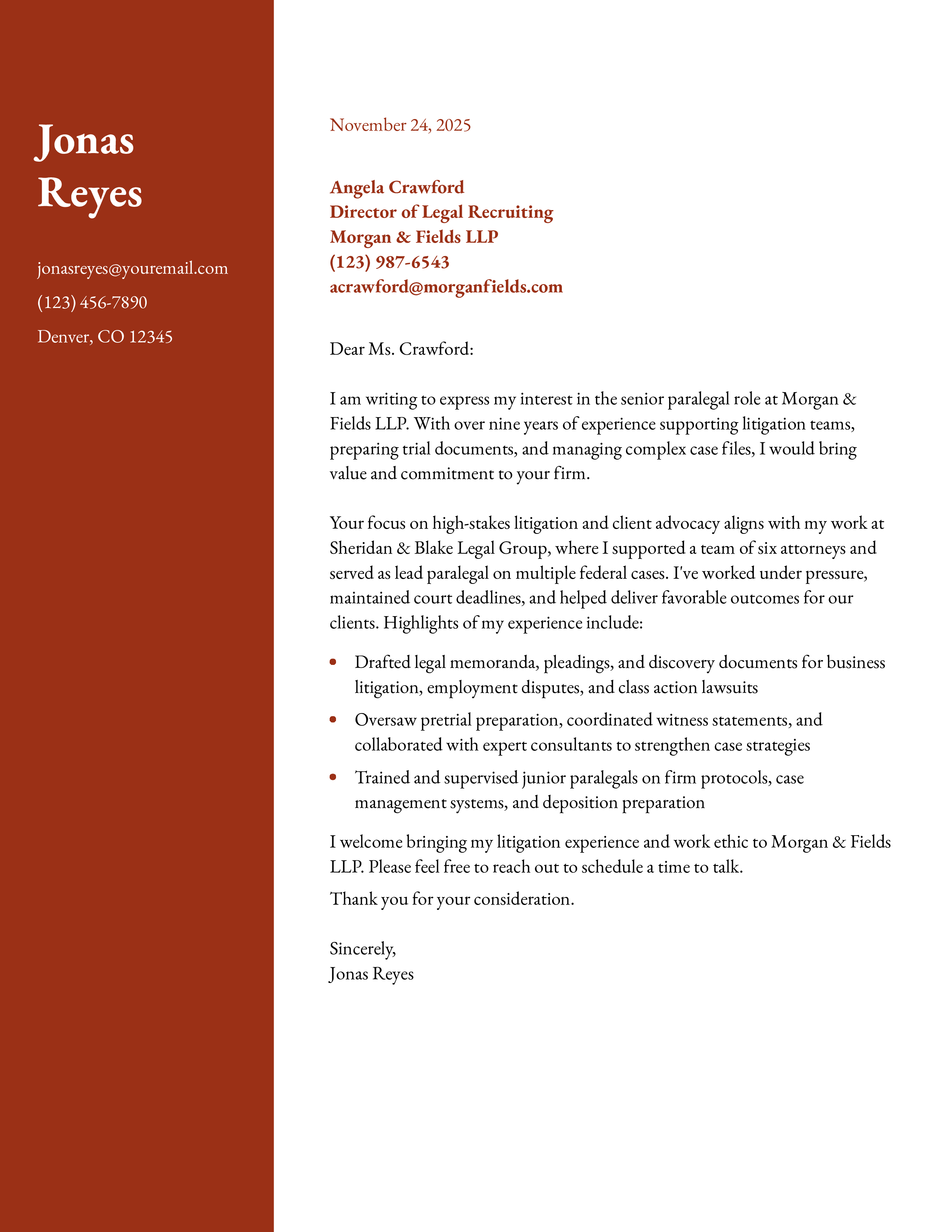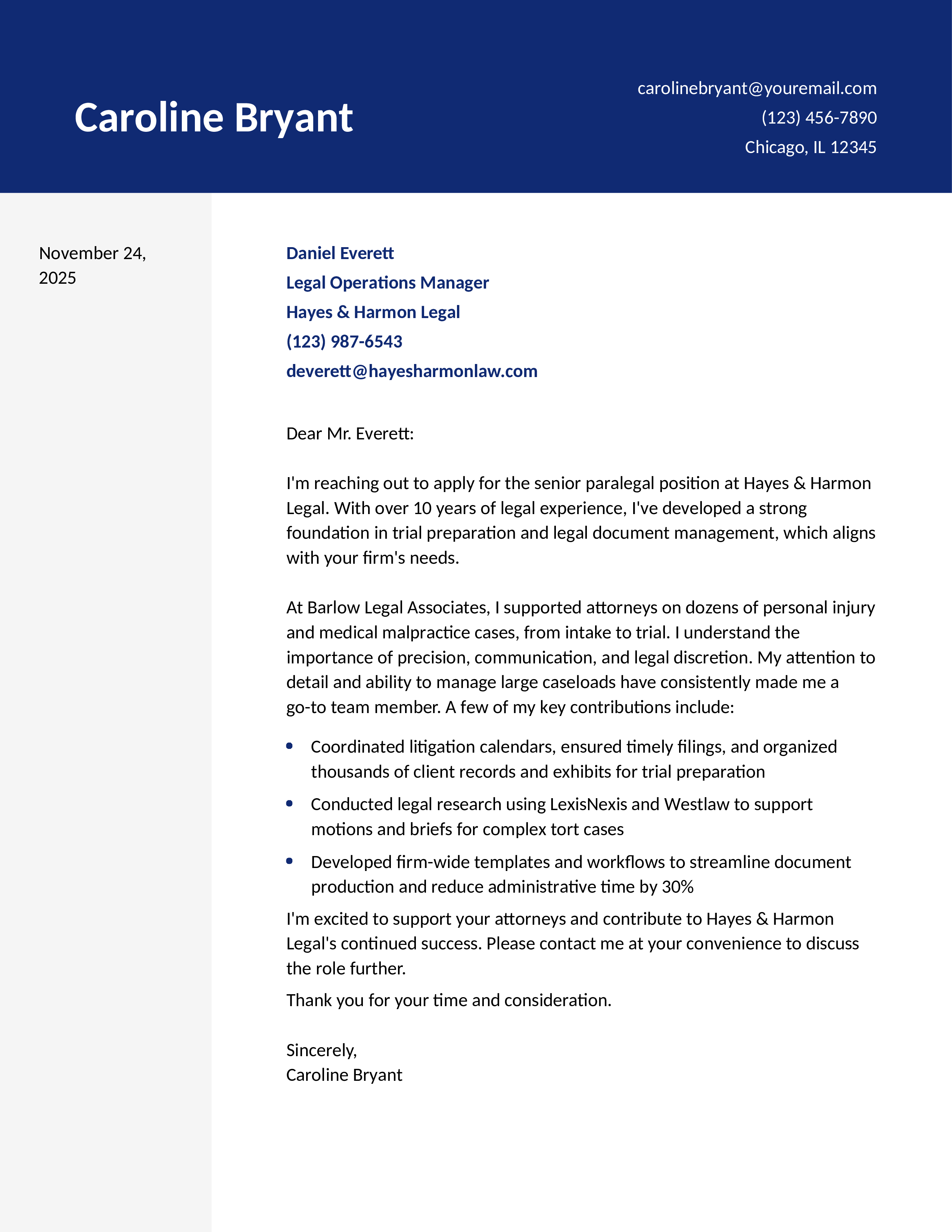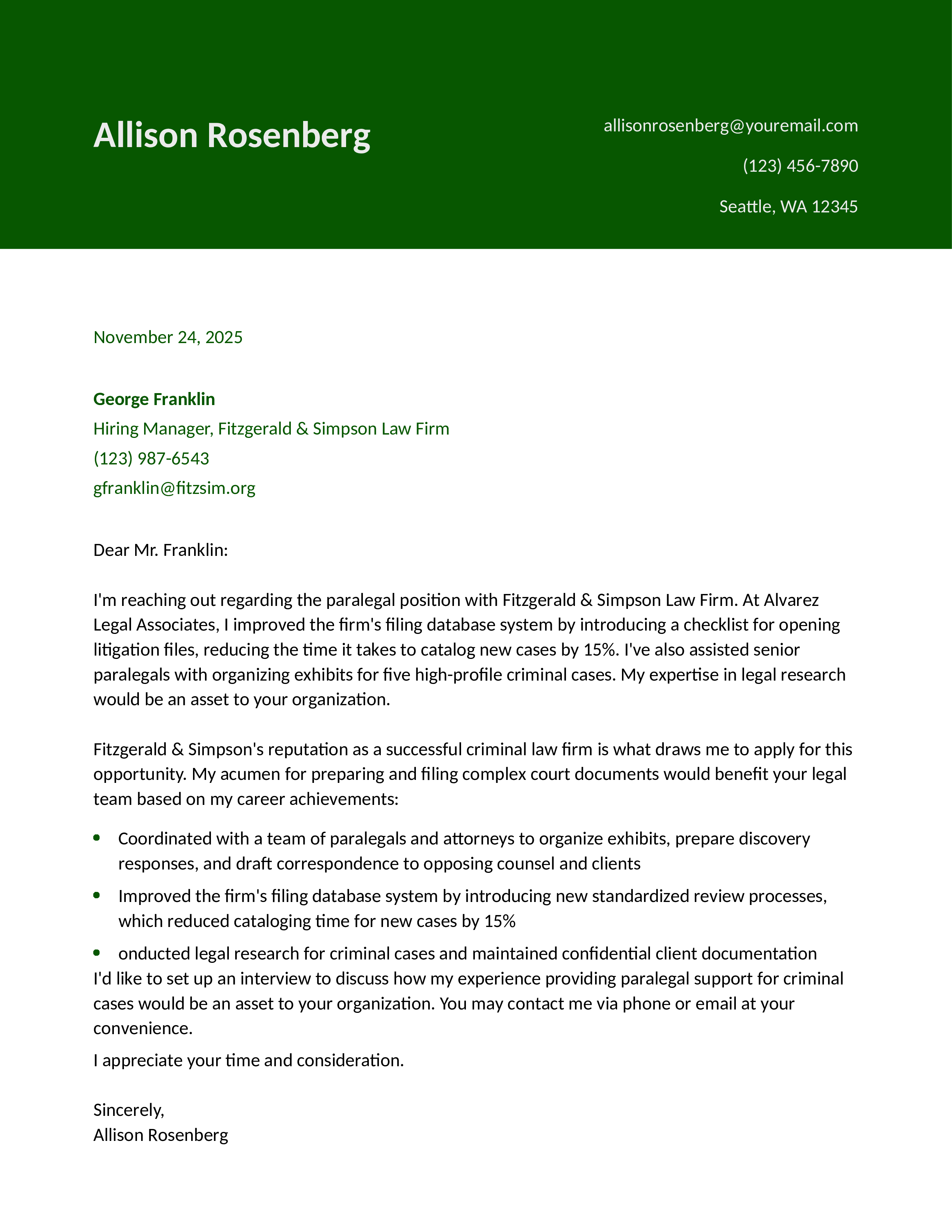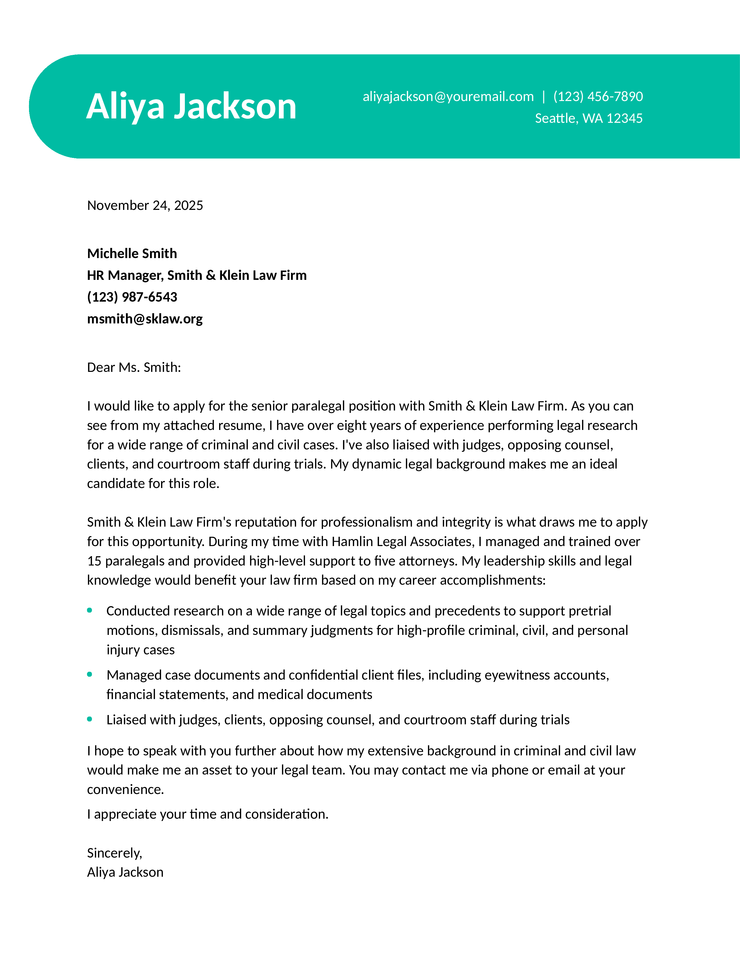 To write a great paralegal cover letter, focus on telling your unique story within the legal field. What types of cases have you supported throughout your career? How have you positively impacted your previous law firms? Use this opportunity to show potential employers how your expertise in legal research and administration can help drive favorable verdicts for their clients. Below, we’ll walk you through each step of building an eye-catching paralegal cover letter: