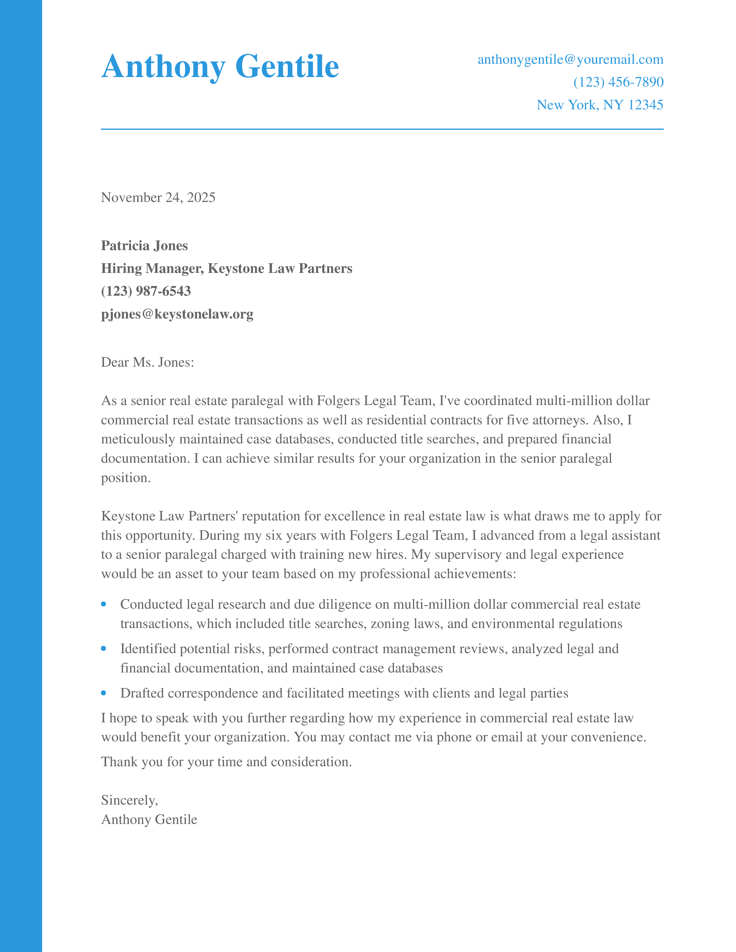 In the example below, the paralegal highlights their experience conducting critical research for multi-million dollar transactions within the real estate industry. These details show the nuances of the candidate’s legal background, which can help make a lasting impression on the hiring manager.