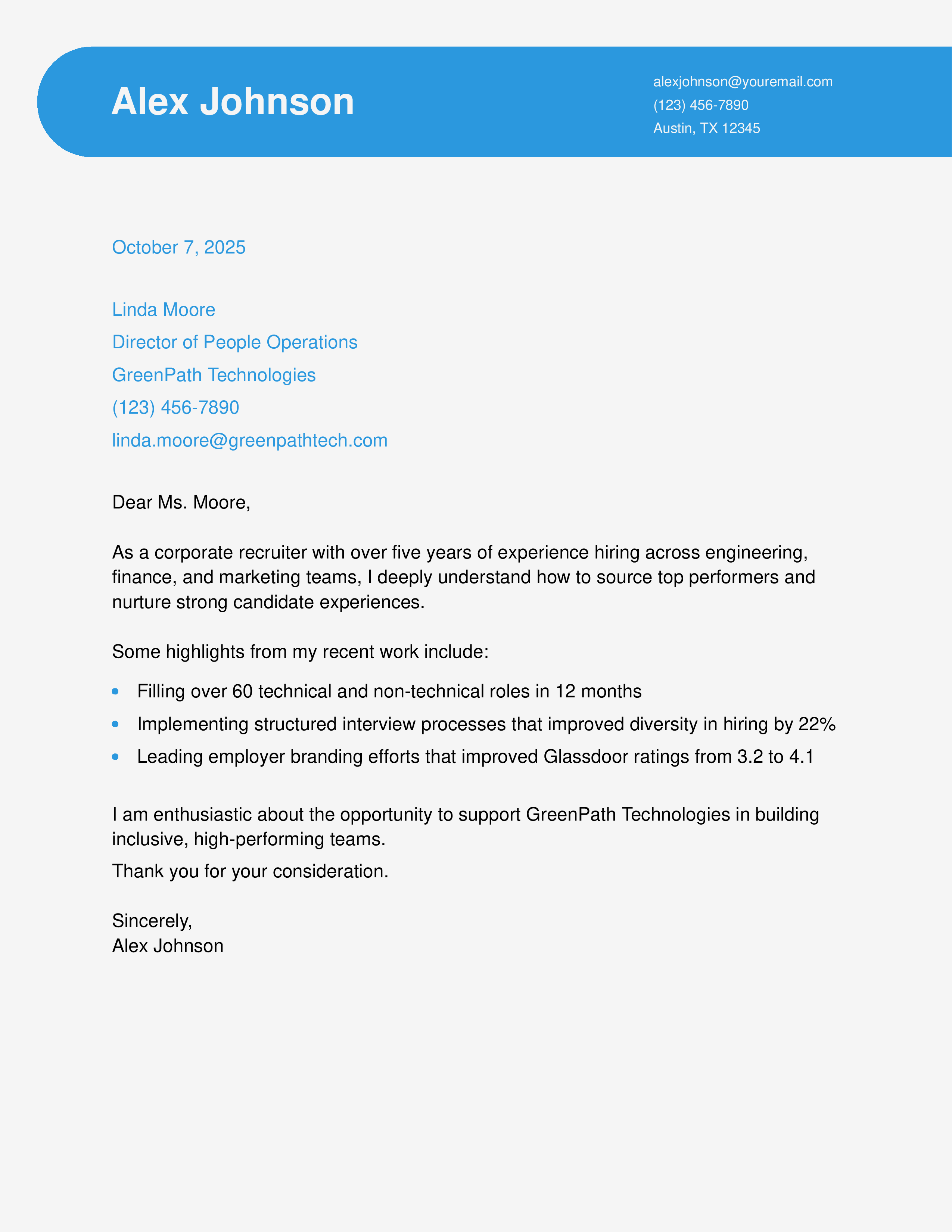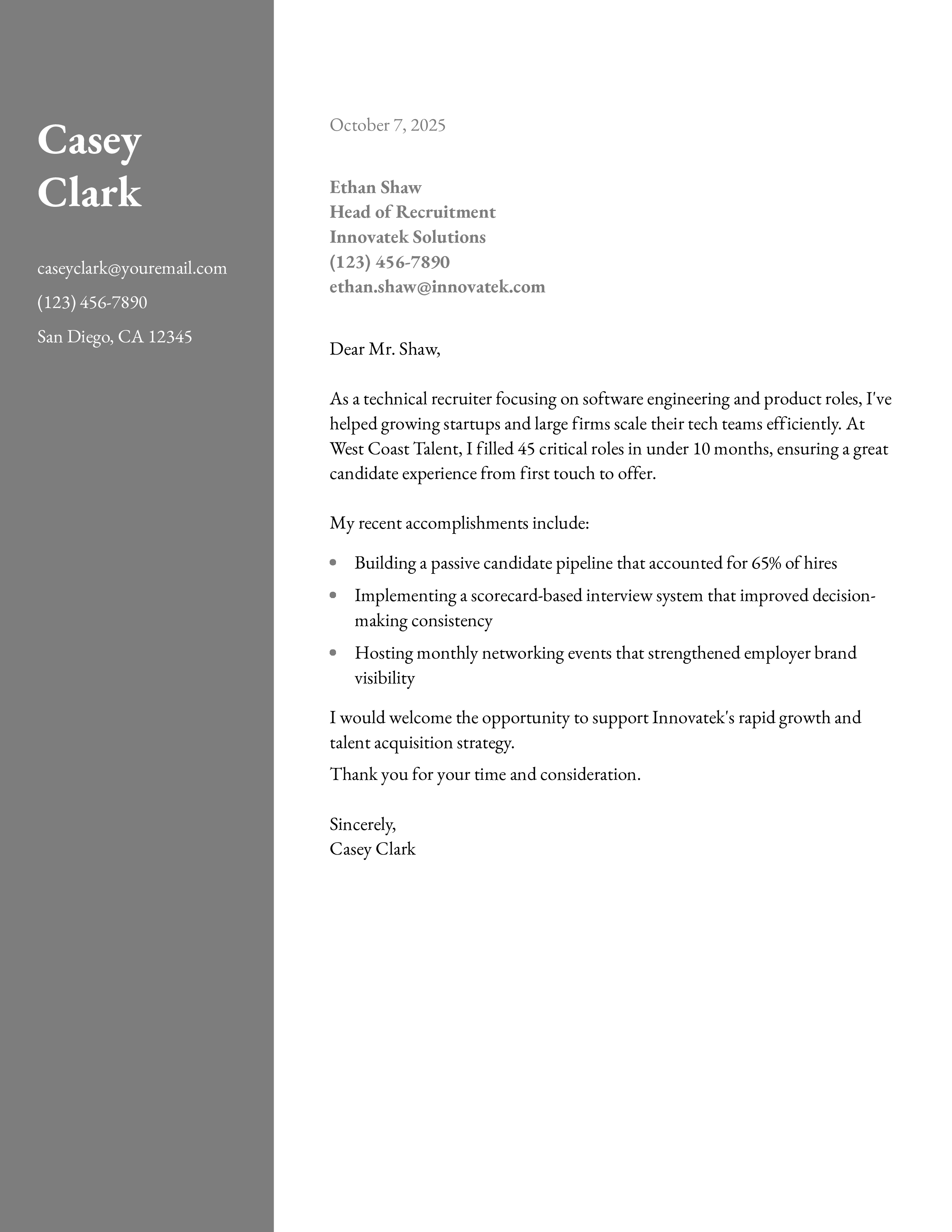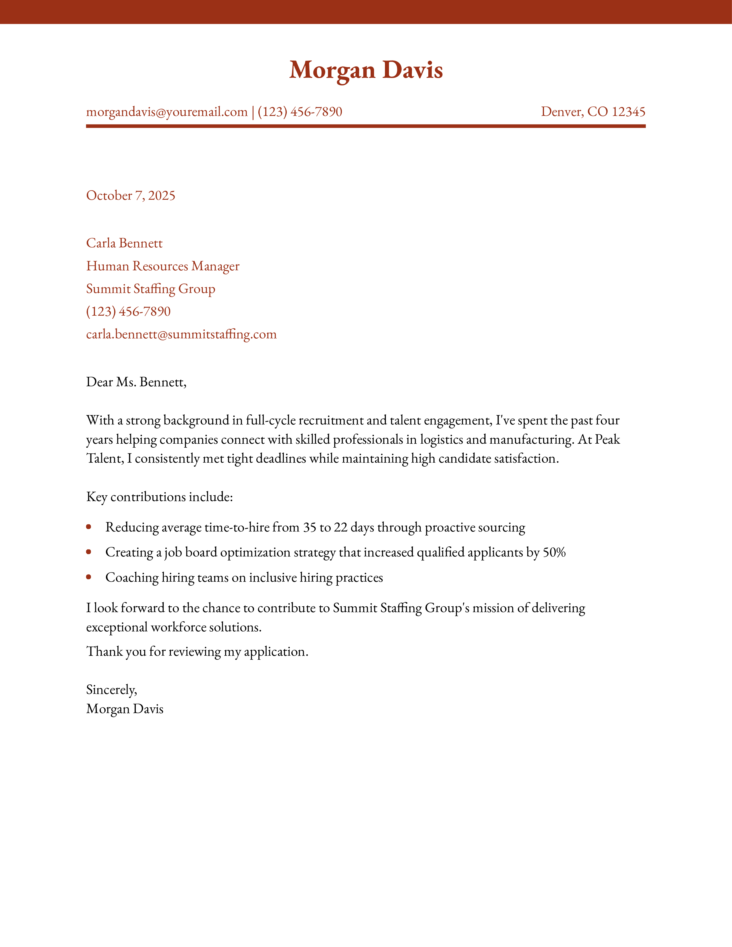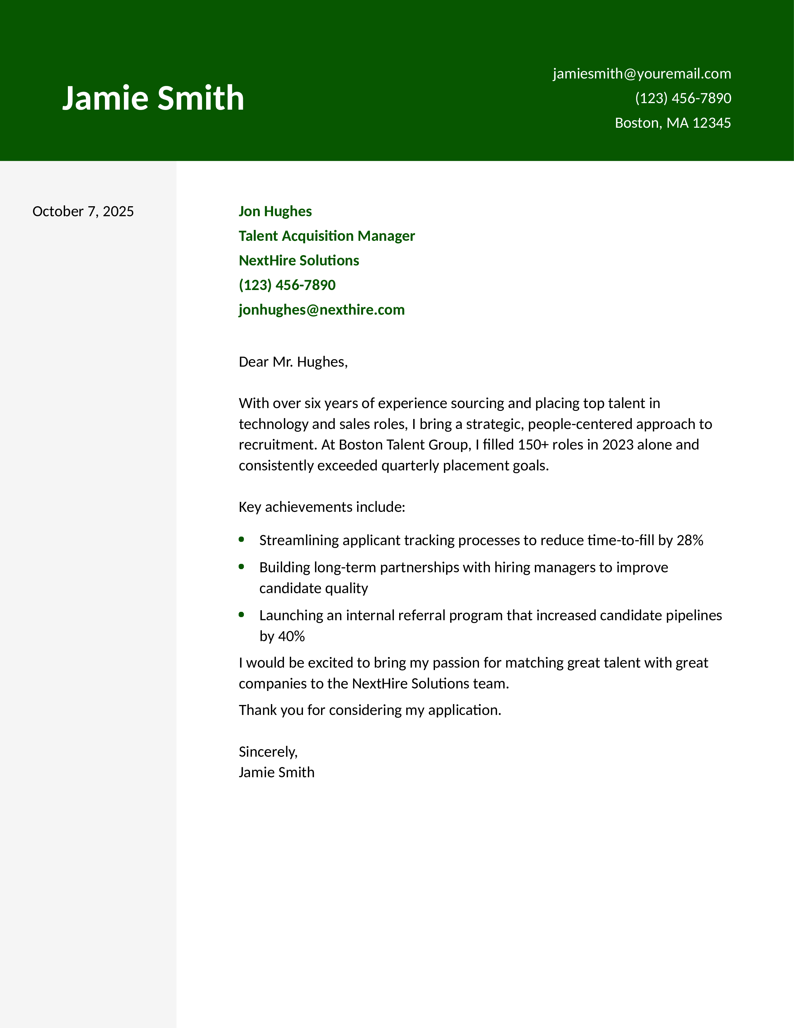 A great recruiter cover letter usually has five sections, outlined below. When possible, connect each section back to your defining human resources (HR) skills and the employer’s hiring needs. The following advice and examples show what to include in your cover letter so it’s optimized for each job application.