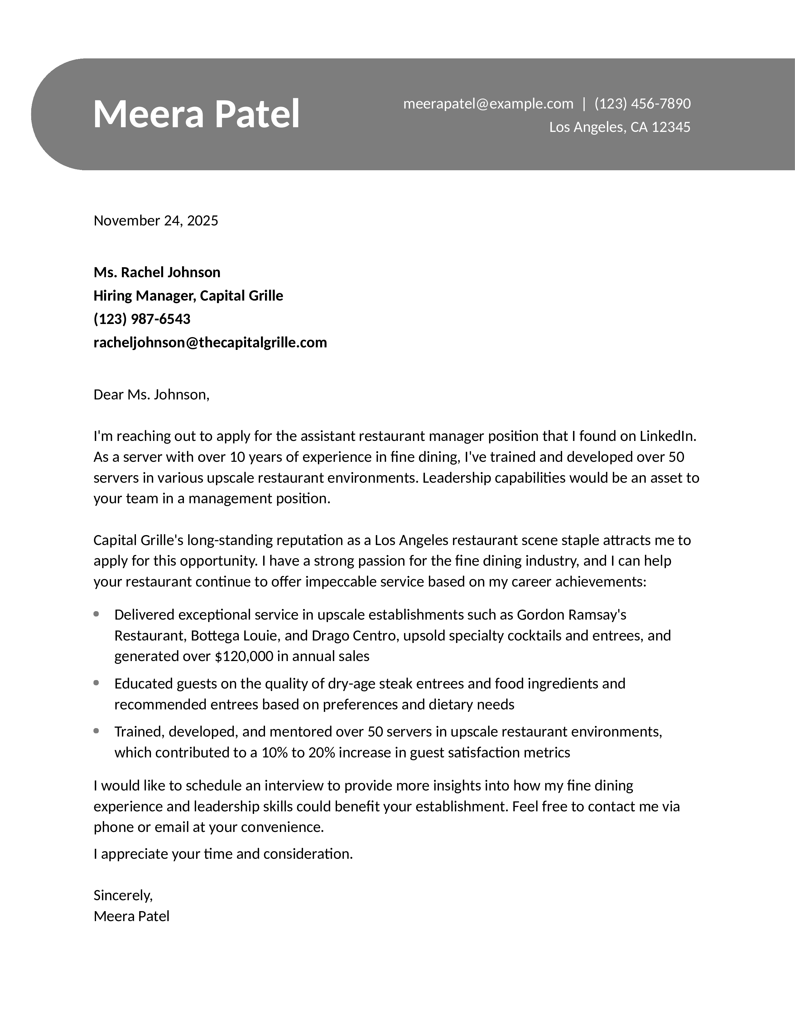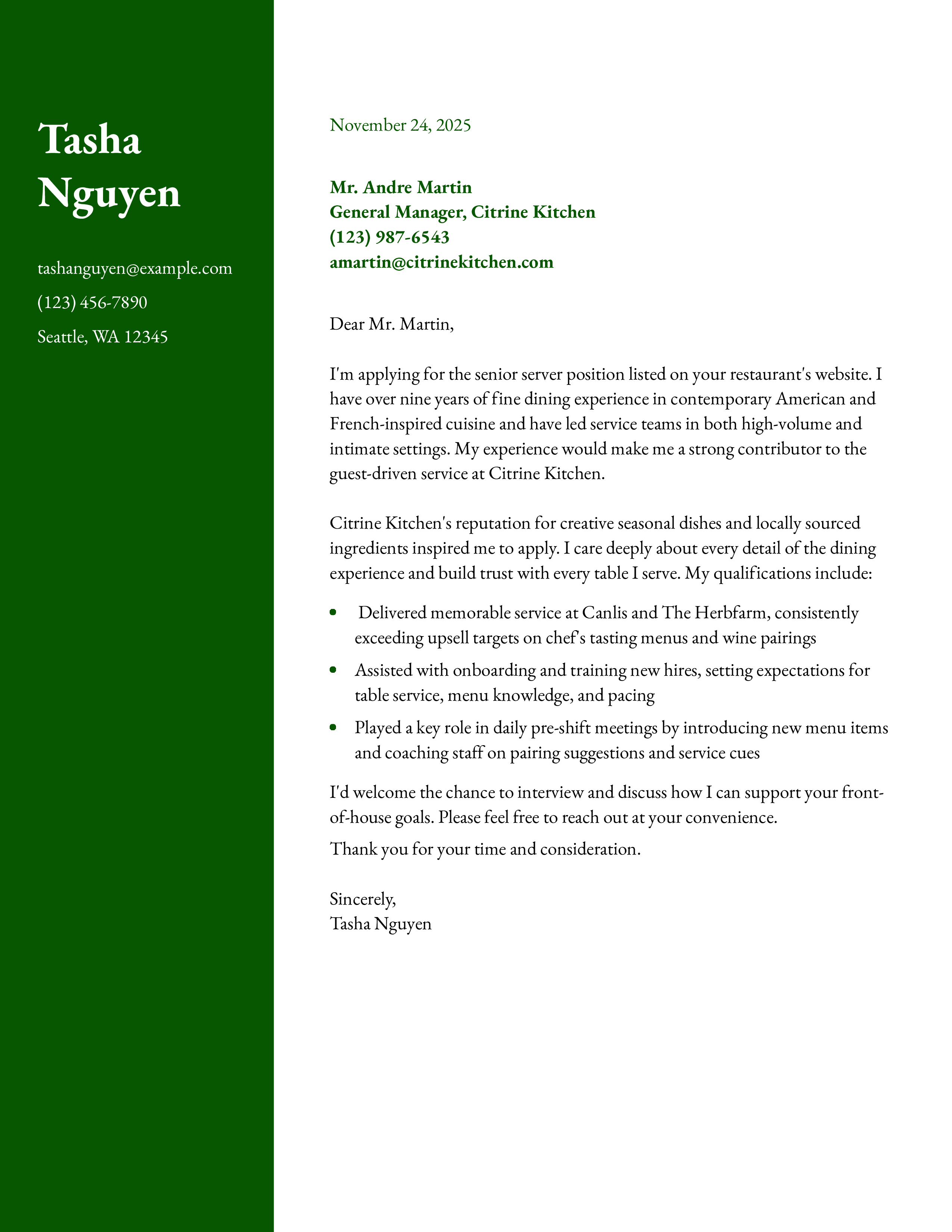 In the example below, the candidate immediately shows their appreciation for the restaurant’s authentic cuisine. They follow up by highlighting the positive impact they’ve had on other fine dining establishments in the past, such as achieving high guest satisfaction scores and exceeding monthly sales goals. Showcasing unique aspects of your hospitality experience in your server cover letter is the best way to maximize your odds of landing the interview.
