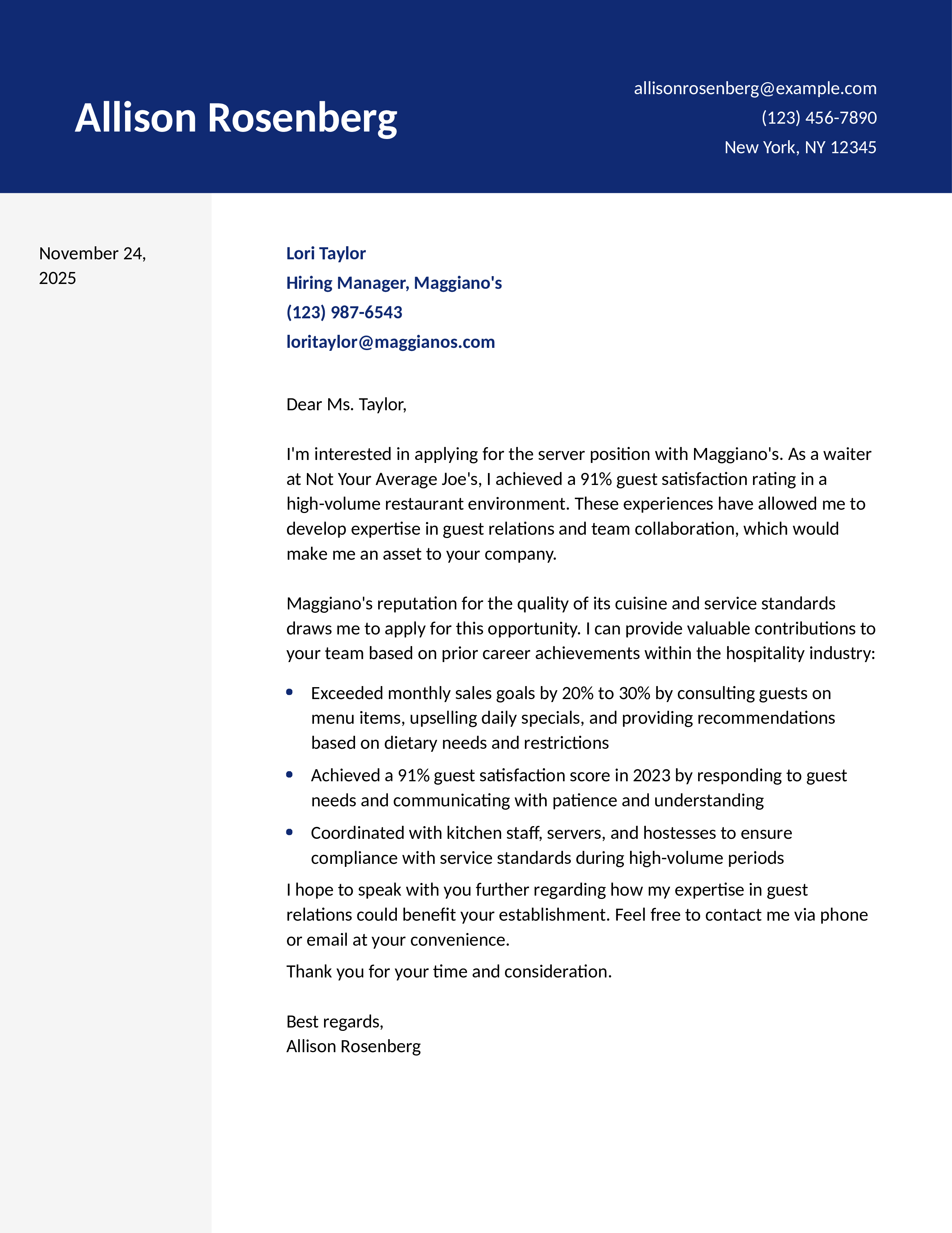 Although cover letters are not usually required for server positions, taking the time to include one speaks volumes about who you are as a professional. It also allows you to convey your genuine interest in the position by mentioning specific details about the restaurant you’re applying to.