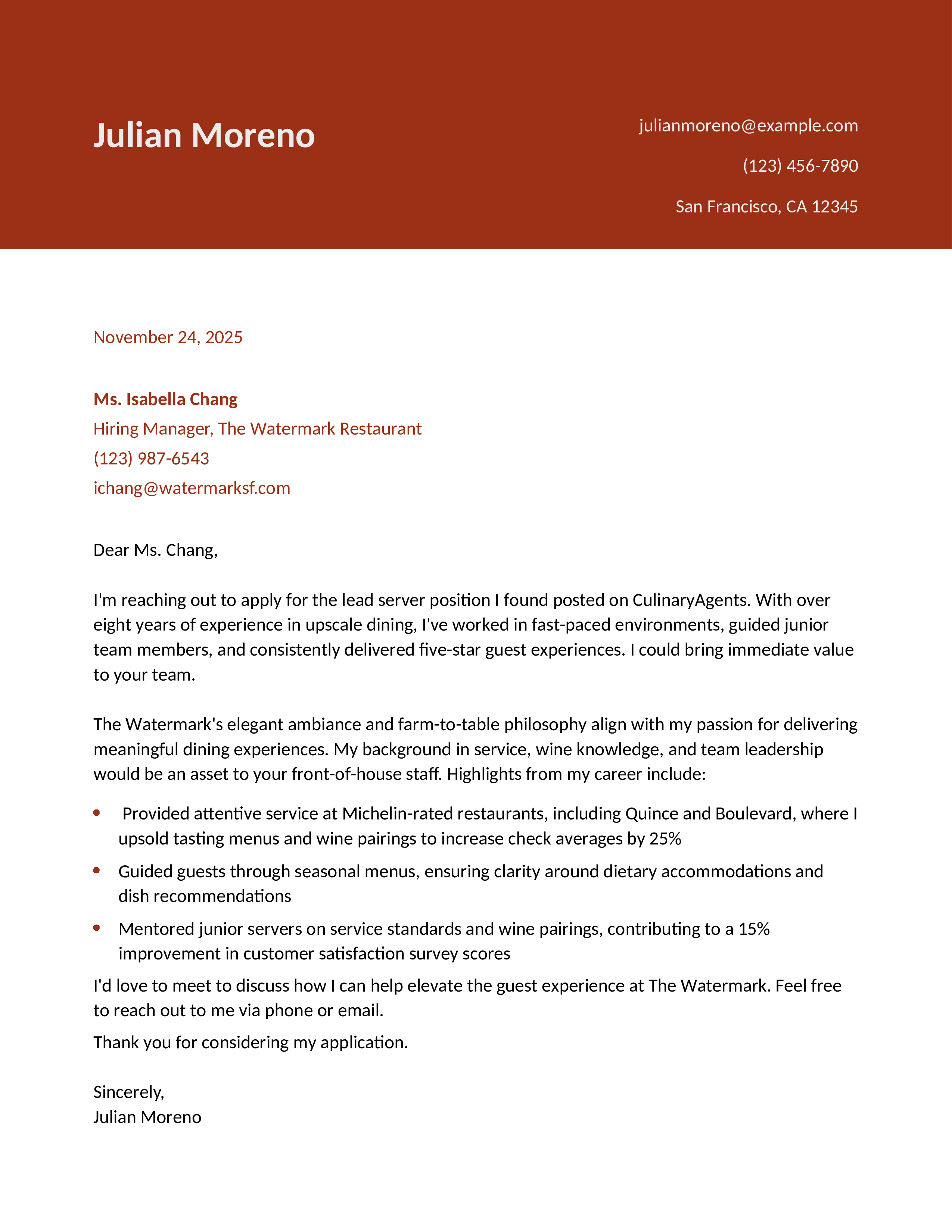 A great server cover letter can help you differentiate from the competition during your job search, especially when applying at upscale restaurants. The key is to emphasize your expertise in guest relations, fine dining, and hospitality by conveying your most notable achievements. This guide provides cover letter examples and expert tips to help you translate your experience within the restaurant industry into a powerful marketing document.