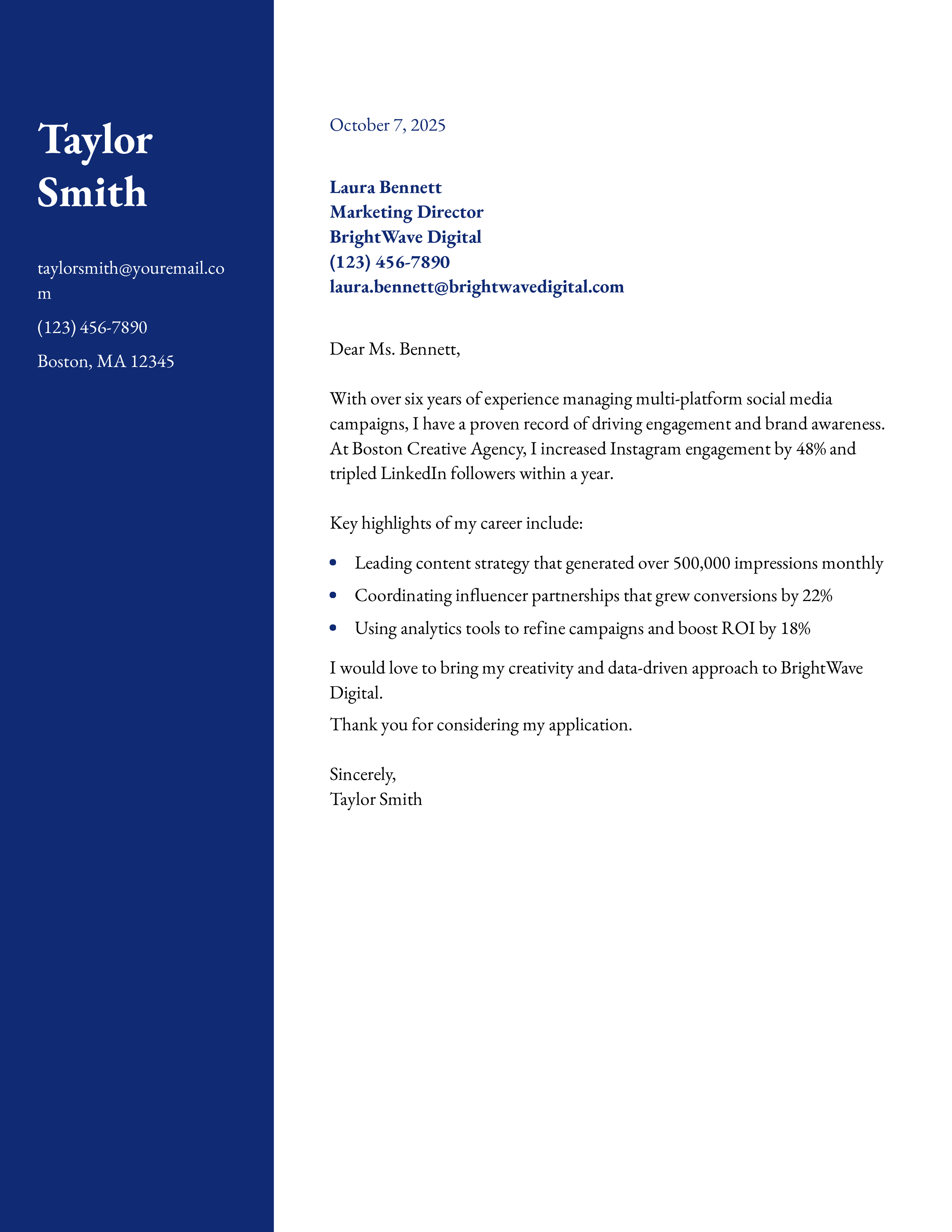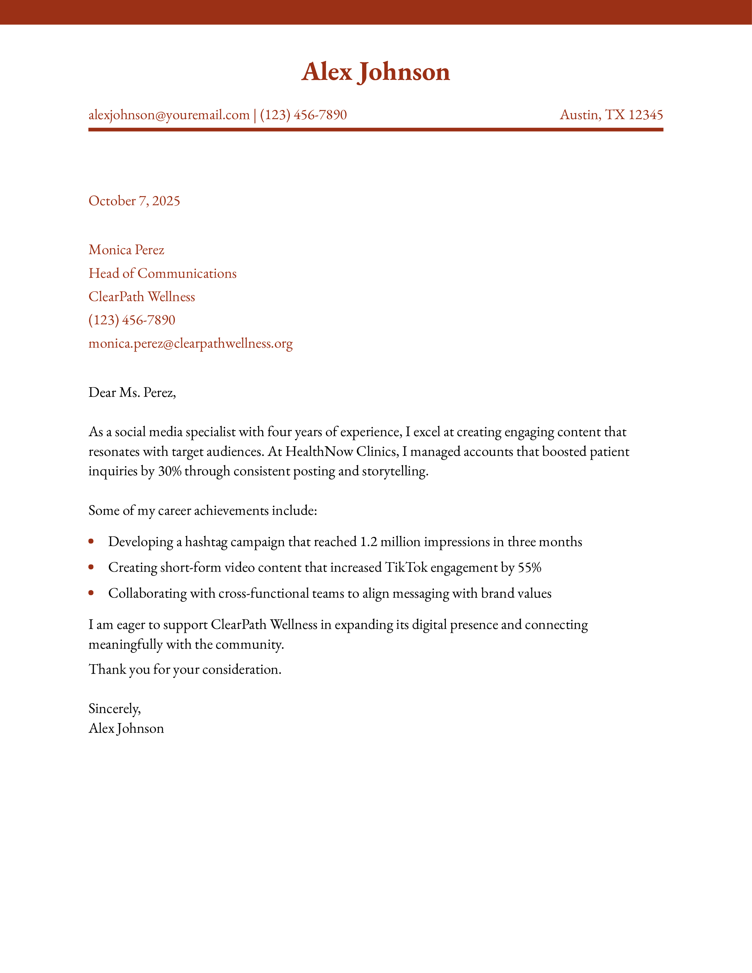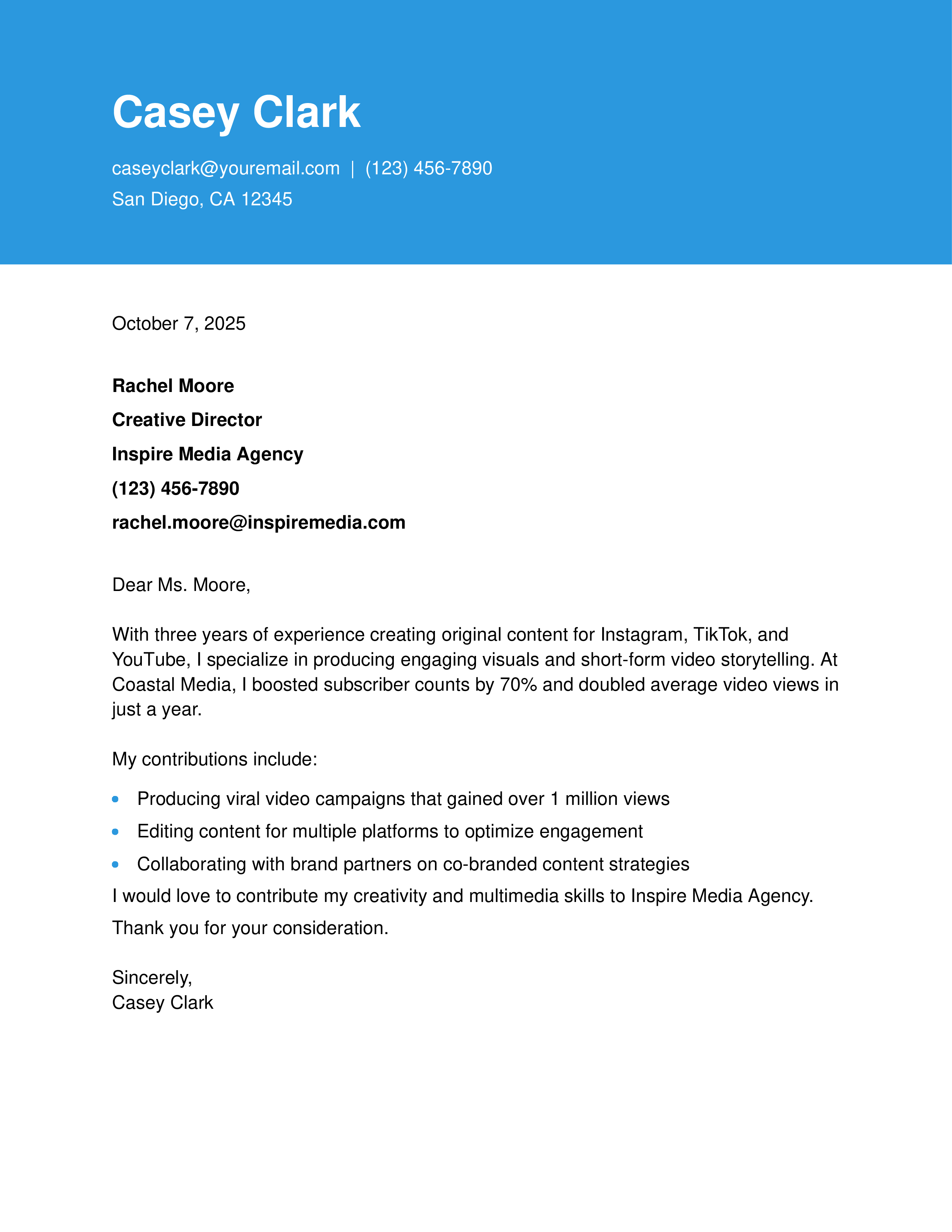 To write a great social media cover letter, the key is to focus on your passion and creativity as a marketing professional. Emphasize your ability to create innovative, high-impact content that truly resonates with target audiences. Highlight your proven track record of increasing followership, web traffic, and engagement throughout your career. Below, we’ll provide additional tips to help you build each section of your social media cover letter:
