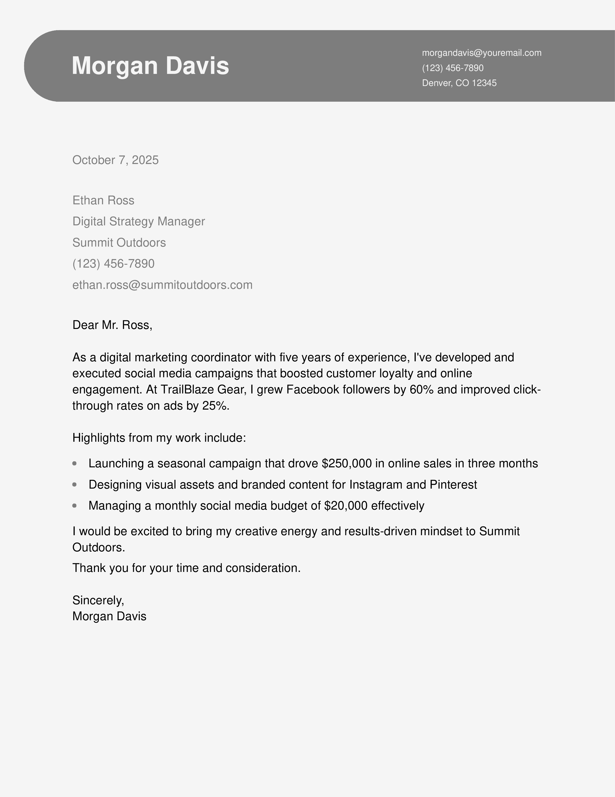 List all essential contact information at the top of your social media cover letter, including your name, phone number, email, and LinkedIn URL. Greet the hiring manager by name — Mr. or Ms. [Last Name]. If you can’t find the hiring manager’s name, use a variation of “Dear Hiring Manager.” This shows you’ve researched the company before applying and demonstrates your genuine enthusiasm for the opportunity.