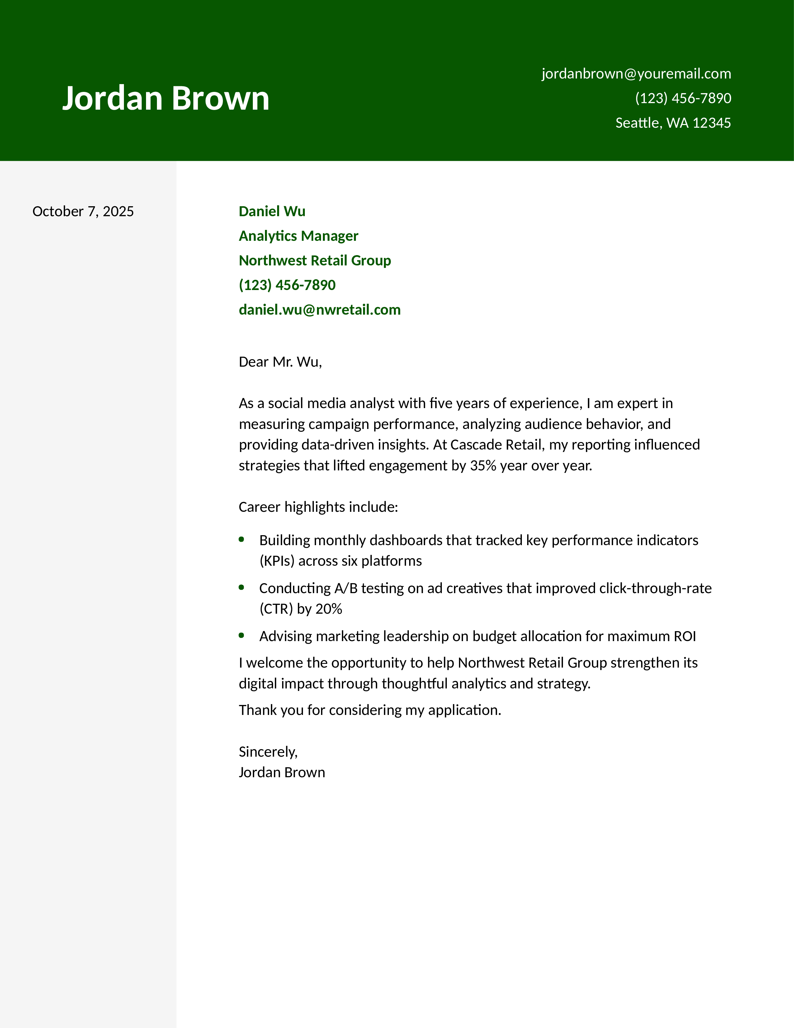 Notice how, in the example below, the candidate establishes crucial context for their social media marketing efforts. By highlighting the size of the company, the increases in both followership and revenue become all the more impressive. Showcasing the results of your accomplishments bolsters the appeal of your social media cover letter.