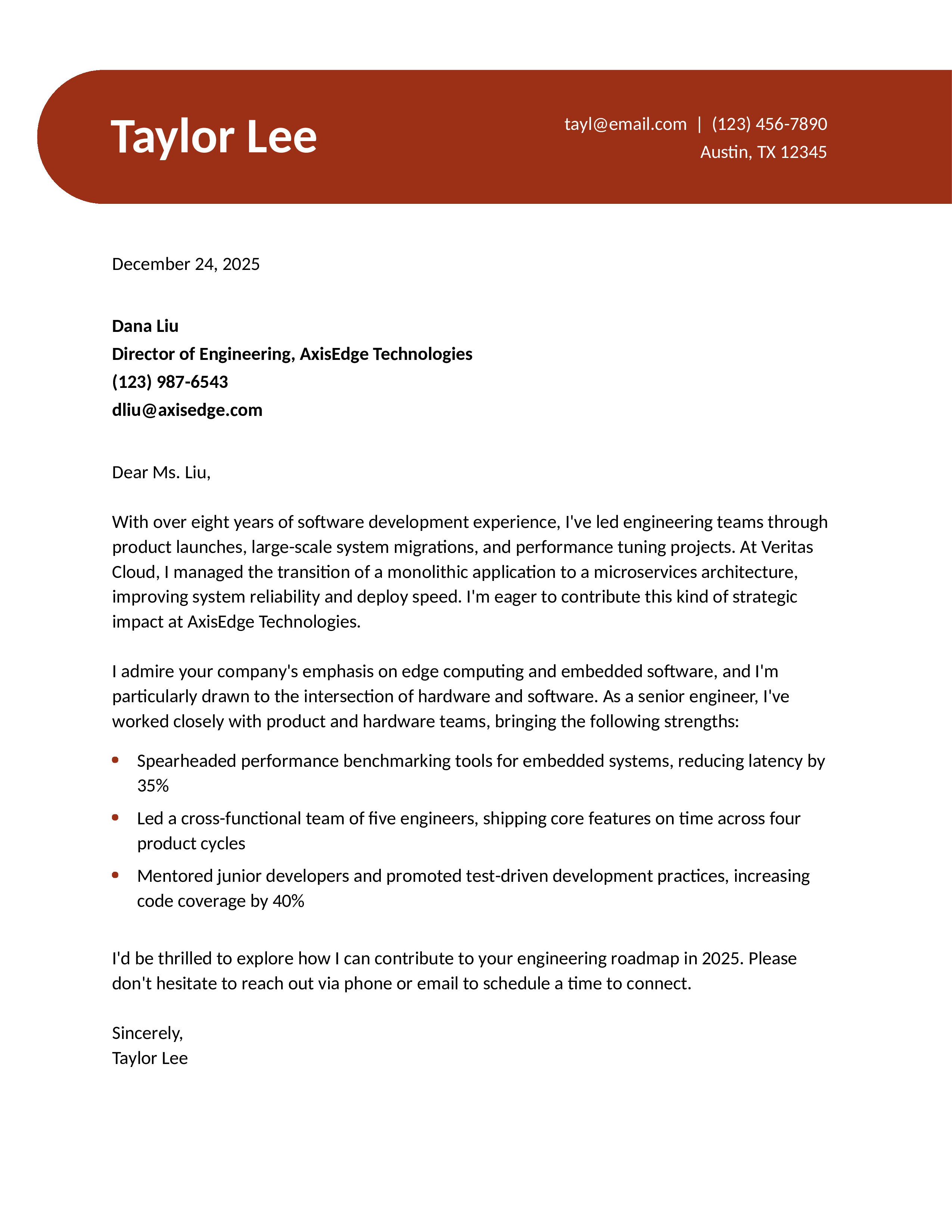 At the top of the page, include your resume contact header, the date, and any basic contact details you have about your recipient. To set a clear focus, add the title Software Engineer to your contact header. You can then modify your title to align with each job posting. For instance, you could use the title Senior Software Engineer if that’s closer to the role you’re after and still accurate to your experience.