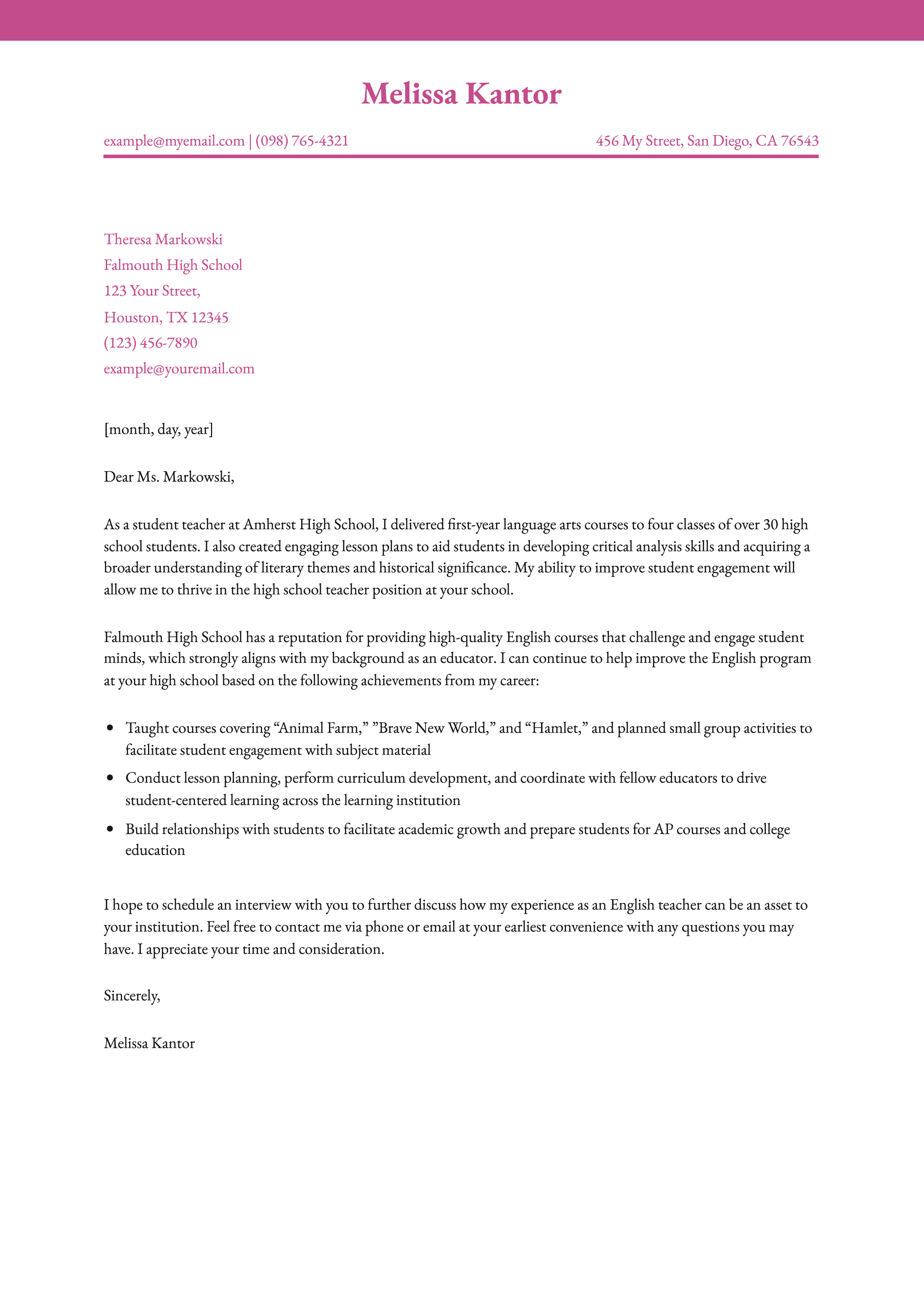A generic cover letter rarely generates the results you’re looking for during the job search. Before applying for a position, research the organization you’re targeting and demonstrate how your background and values align with the school. In the example below, the applicant mentions specific aspects of the high school’s English program and explains how they can engage and challenge students to excel: