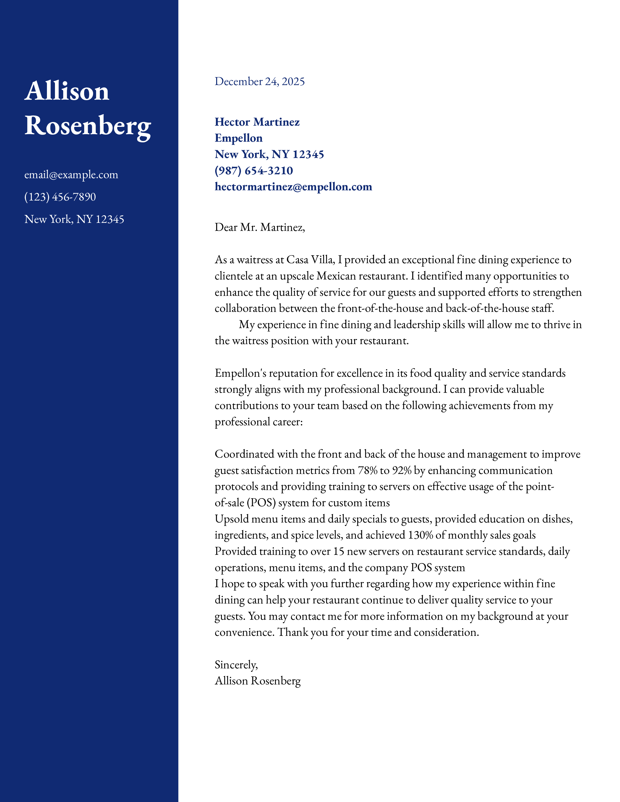 Notice how this candidate personalizes their application by showing their familiarity with the establishment’s cuisine. They also establish how their experience working in high-volume chain restaurants will allow them to transition into fine dining. Telling your unique story is a great way to help your waiter/waitress cover letter stand out in today’s job market.