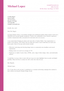 In the body of your web design cover letter, include two paragraphs describing your most impressive qualifications and web design projects. Mention something specific about the company’s reputation, products, or culture and how this aligns with your professional background. Highlight accomplishments that demonstrate your creativity as a digital designer and your technical acumen. This shows potential employers you’re a versatile, well-rounded candidate.