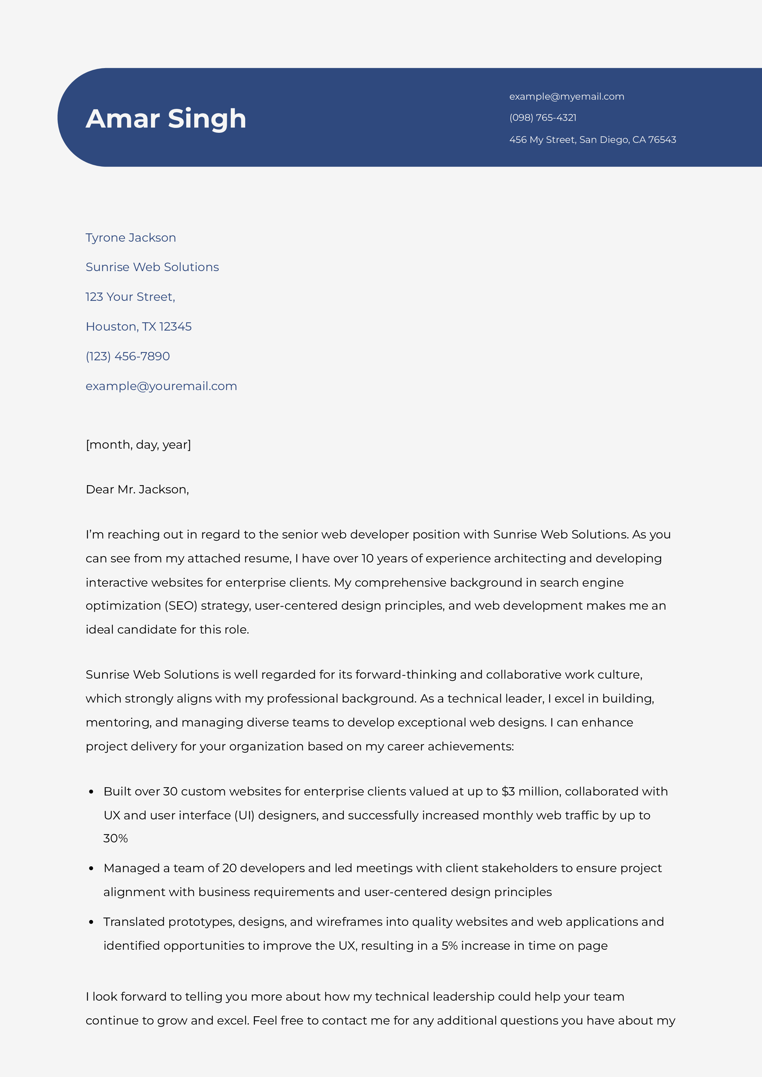 The best way to demonstrate the results of your web development efforts is by incorporating compelling data points, revenue numbers, and metrics into your cover letter. This establishes a sense of scope for the reader and helps paint a clearer picture of your background as a developer. In the example below, the candidate draws attention to increases in both monthly traffic and time on the page, which conveys the success of their projects: