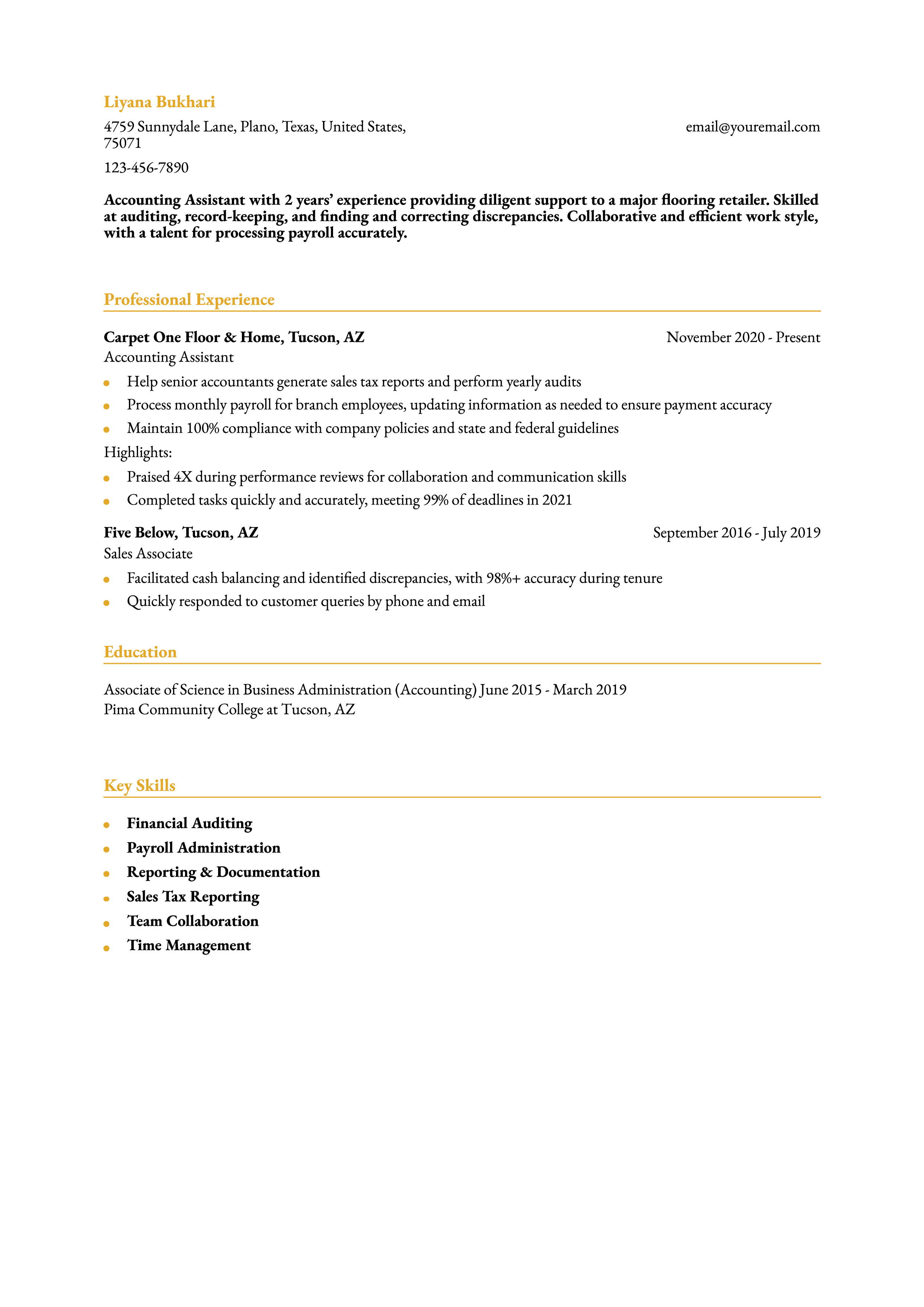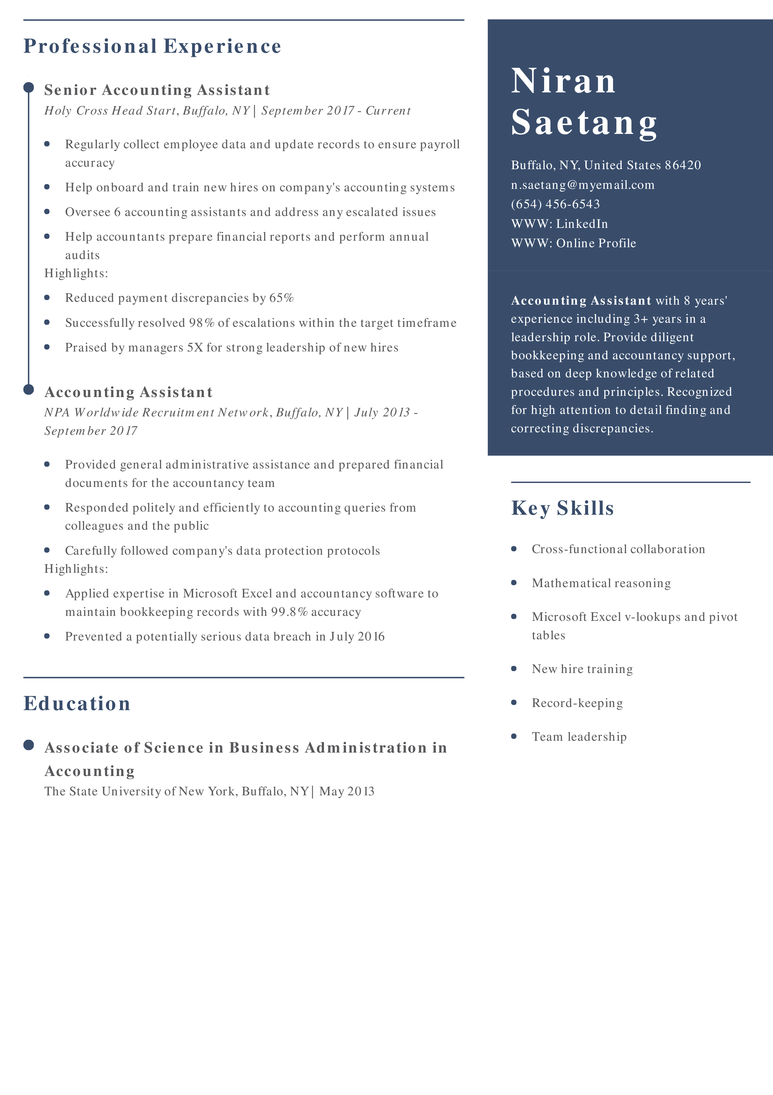 As with most vocations, accounting assistants should use a resume template that’s clear and straightforward. Opt for a layout that lets the hiring manager quickly review your best career details. Select a traditional resume font, and avoid any template with a colorful or elaborate design. Also, ensure the template complies with ATS used by employers to screen resumes.