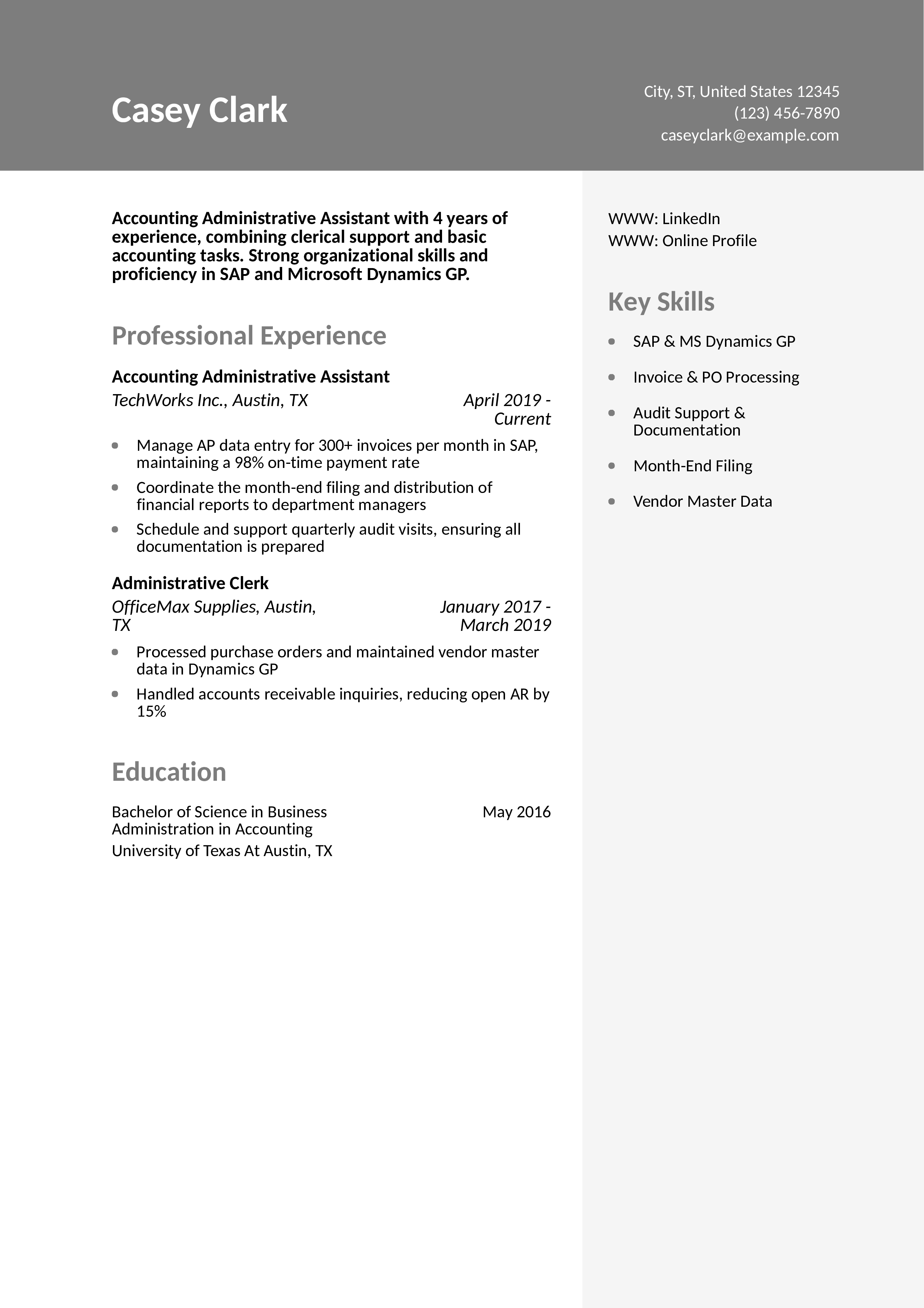 For this reason, add a keyword-rich “Skills” or “Expertise” section to your resume. With this section, you can show the breadth of your skill set and boost the chance your application gets noticed. Below are common keywords for an accounting assistant: