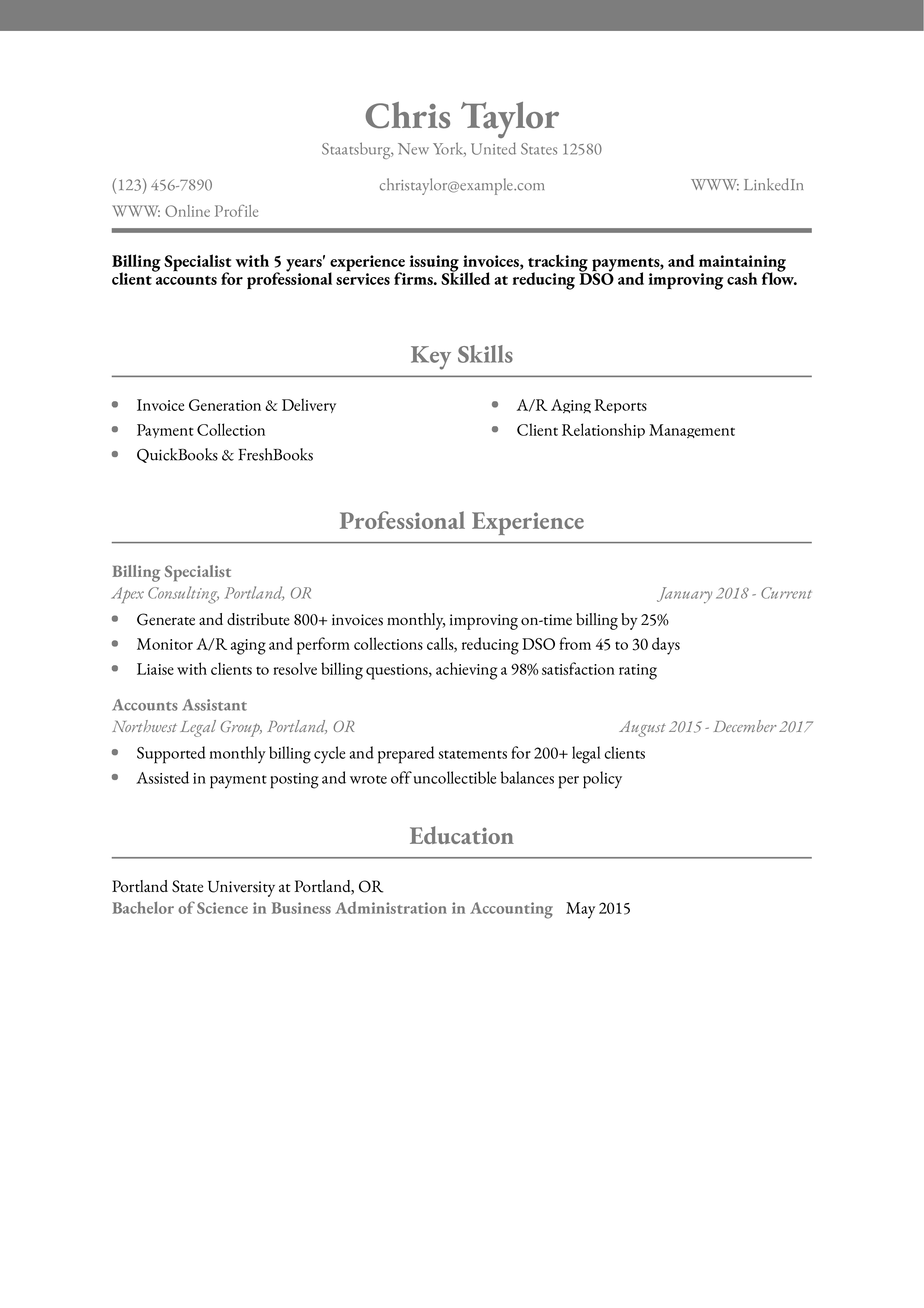 Use metrics like “reduced DSO by 15%” to showcase impact. For more tips on structuring your results, see resume summary examples.