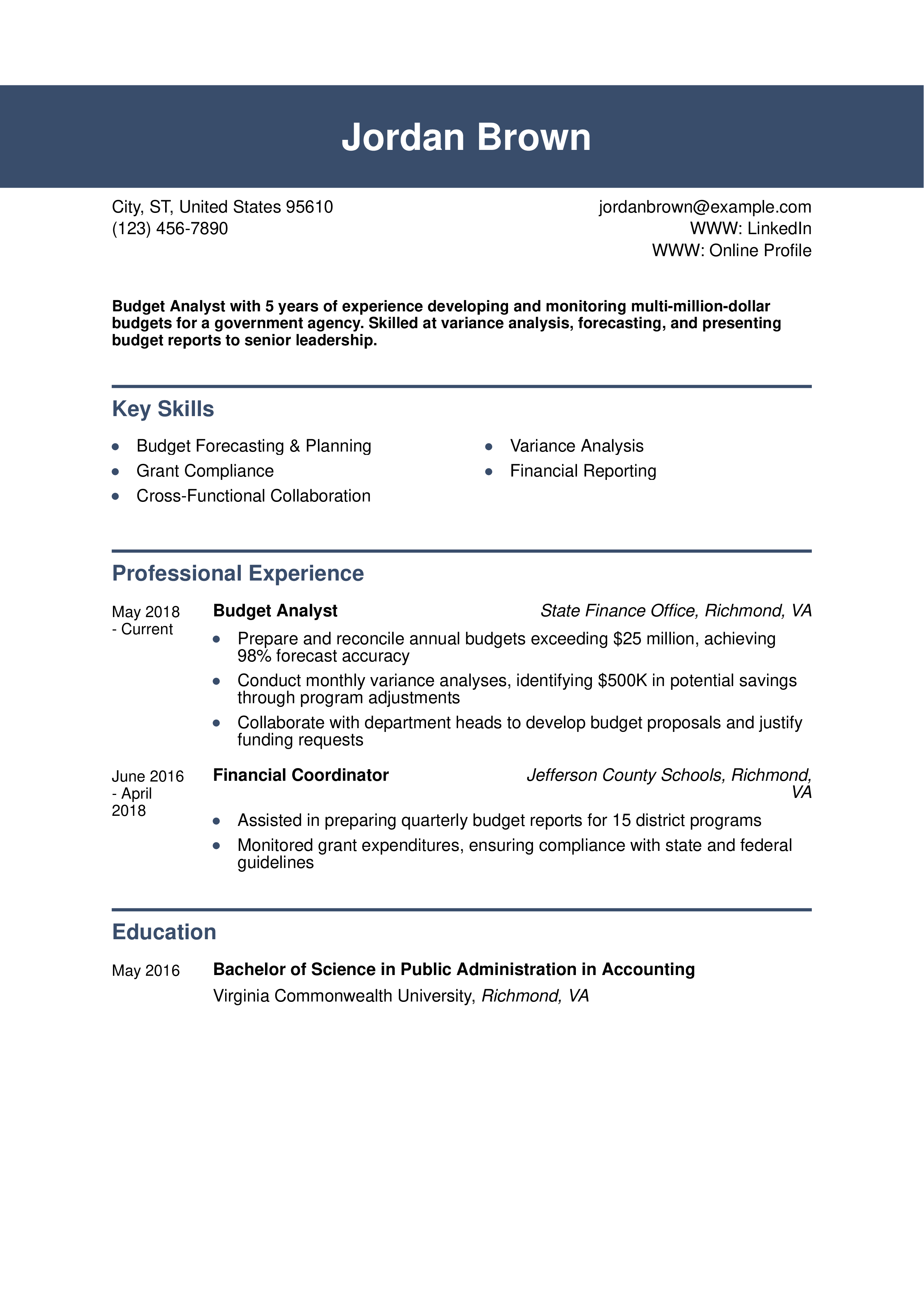 Jordan’s resume highlights a 98% forecast accuracy and $500K in savings, demonstrating both technical precision and business impact. The clear, concise format makes it easy for hiring managers to assess their budgeting expertise.