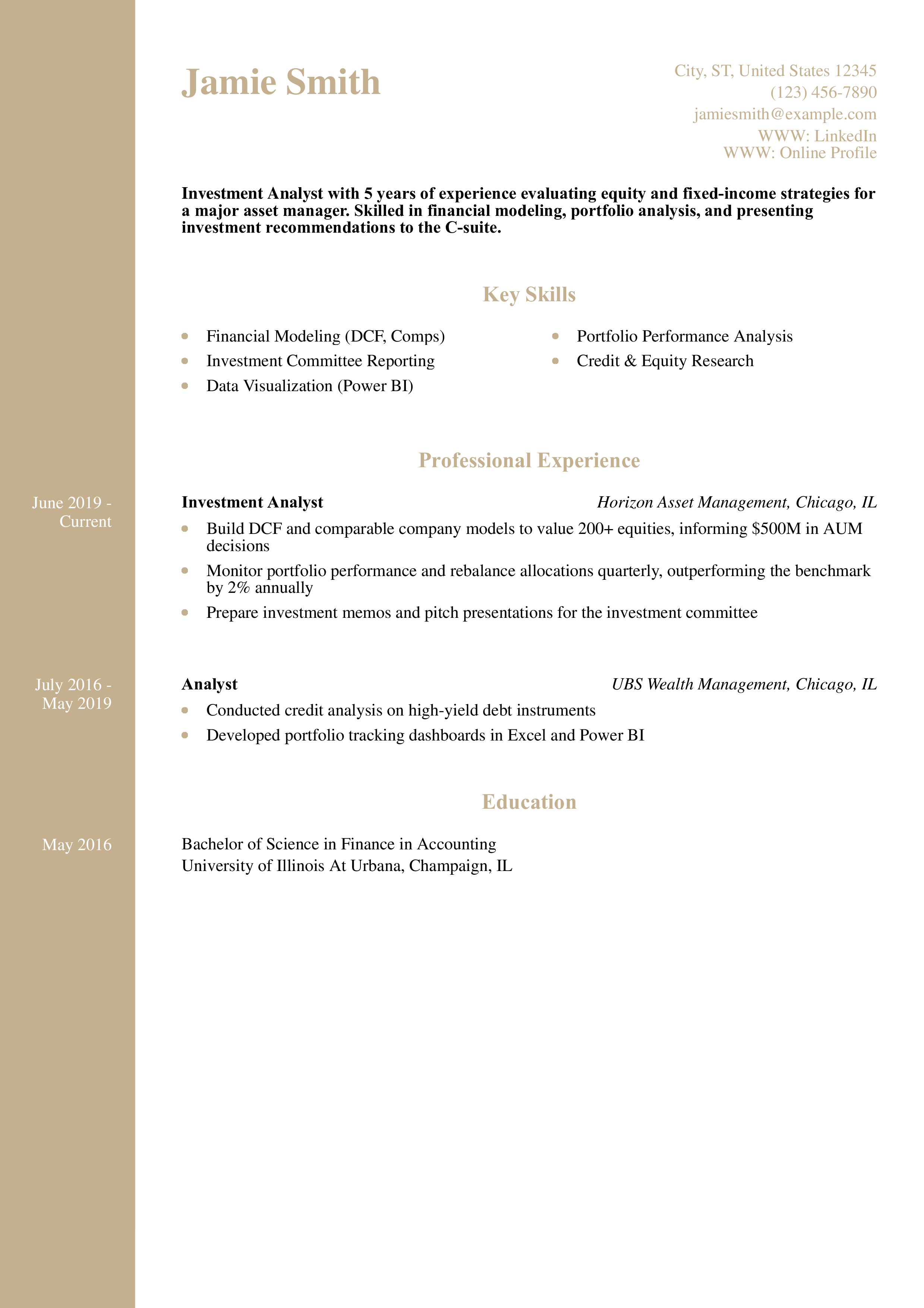Jamie’s resume quantifies outperformance (2% over benchmark) and $500M in AUM, which is strong proof of investment acumen. The inclusion of both modeling and presentation skills shows a well-rounded analyst.