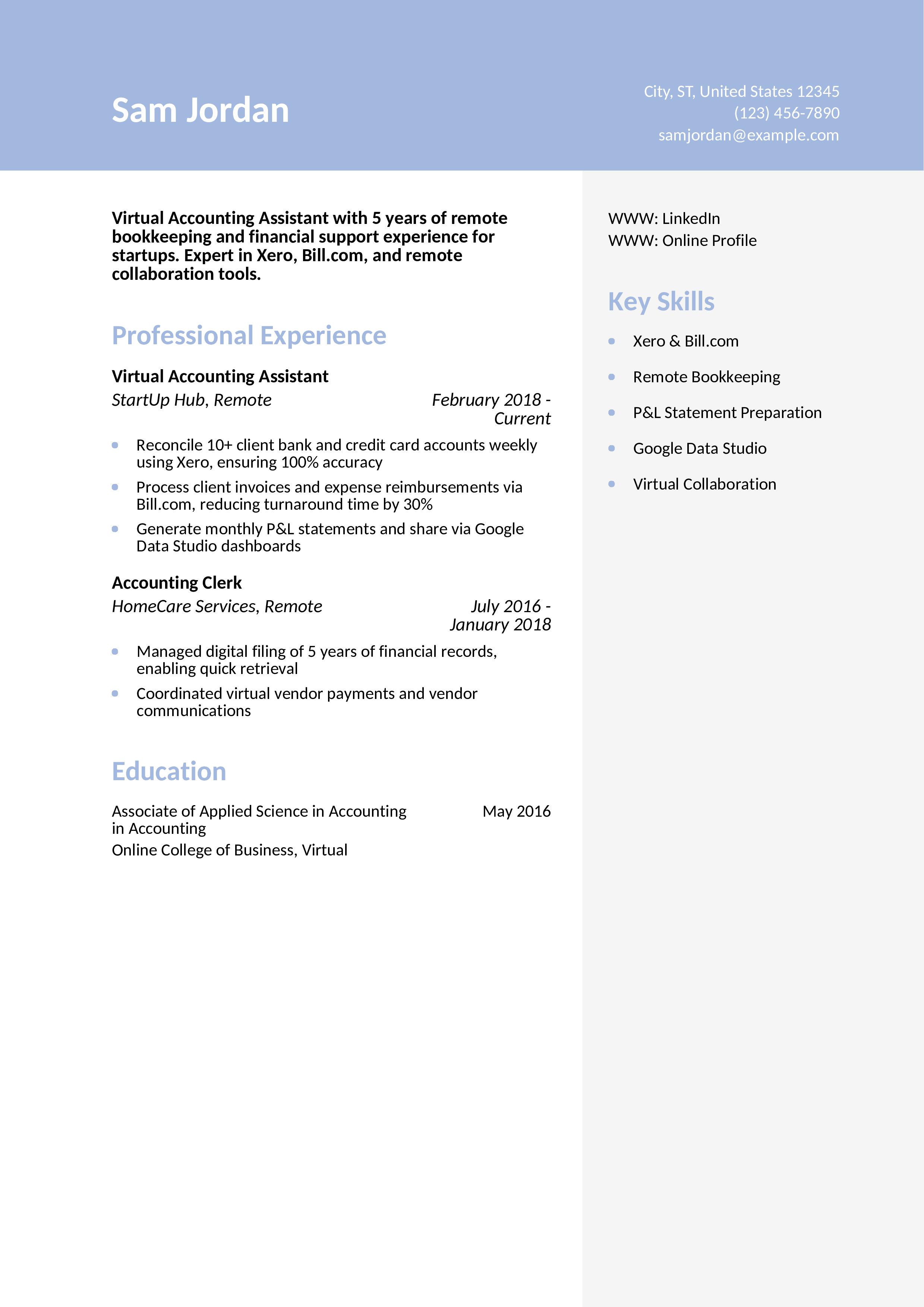 Sam’s resume ties a 30 % faster expense process and 100 % reconciliation accuracy to virtual tools, proving remote bookkeeping effectiveness. The clear tool list reassures hiring managers of technical readiness.
