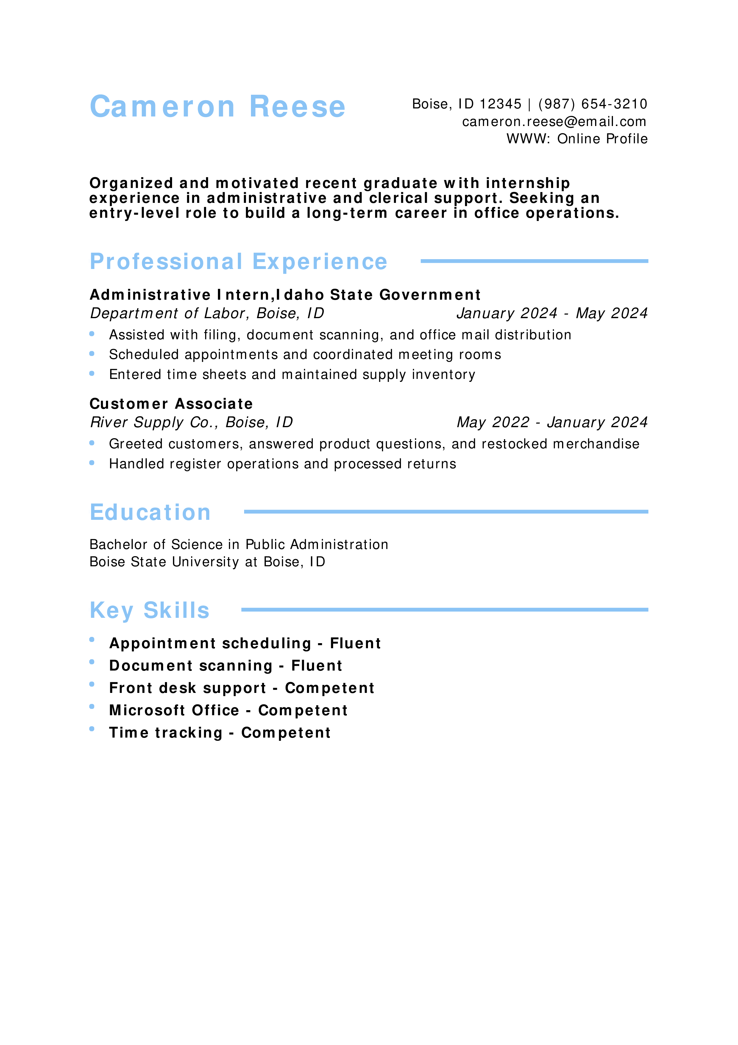 This resume is ideal for internship or entry-level roles. It connects part-time experience with relevant administrative tasks. For guidance on academic timelines, check out how to put the expected graduation date on a resume.