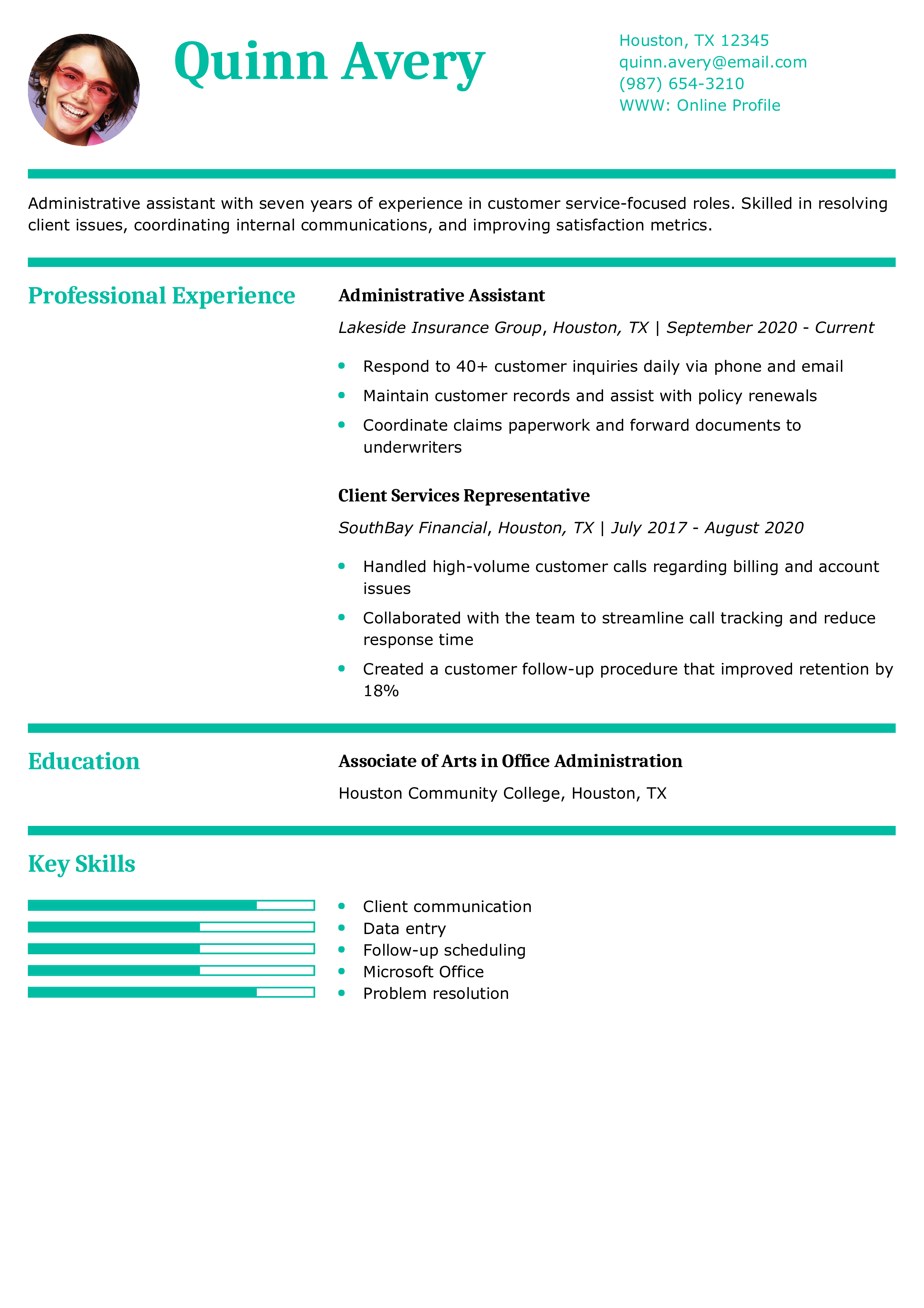 This resume demonstrates a well-rounded administrative skill set, including customer service, data entry, and bookkeeping. The experience in a busy college admissions office shows the ability to manage multiple tasks in a fast-paced setting. Learn more about what to put on a resume to make your qualifications stand out.