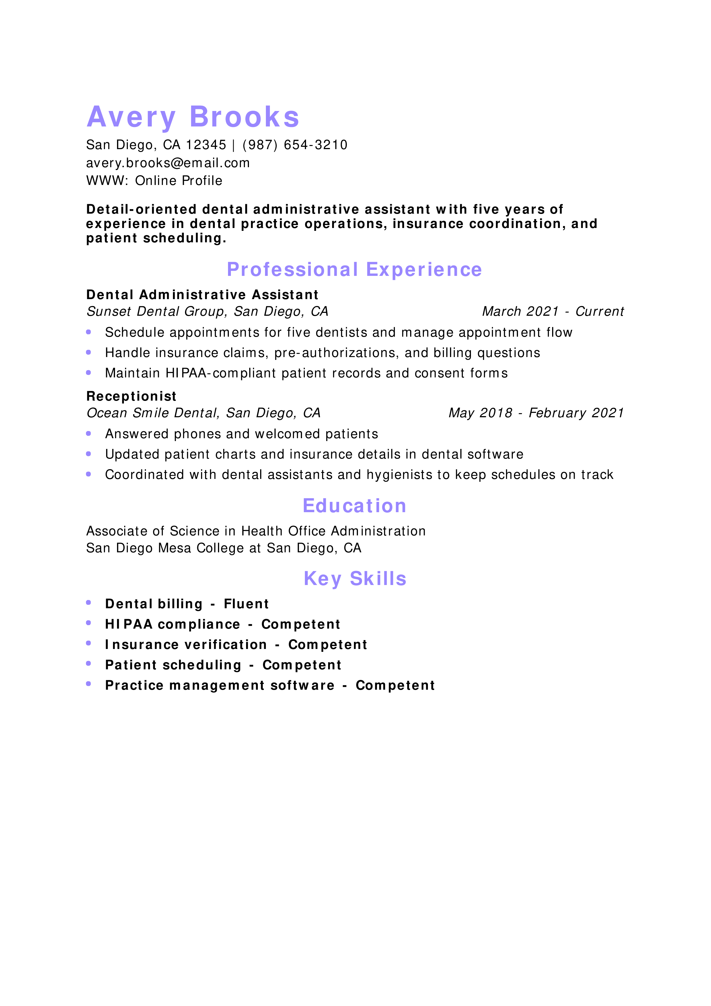 This resume highlights experience in dental-specific software, billing, and patient relations. It speaks directly to what hiring managers look for in dental offices. For help listing certifications or licenses, read how to list certifications on a resume.