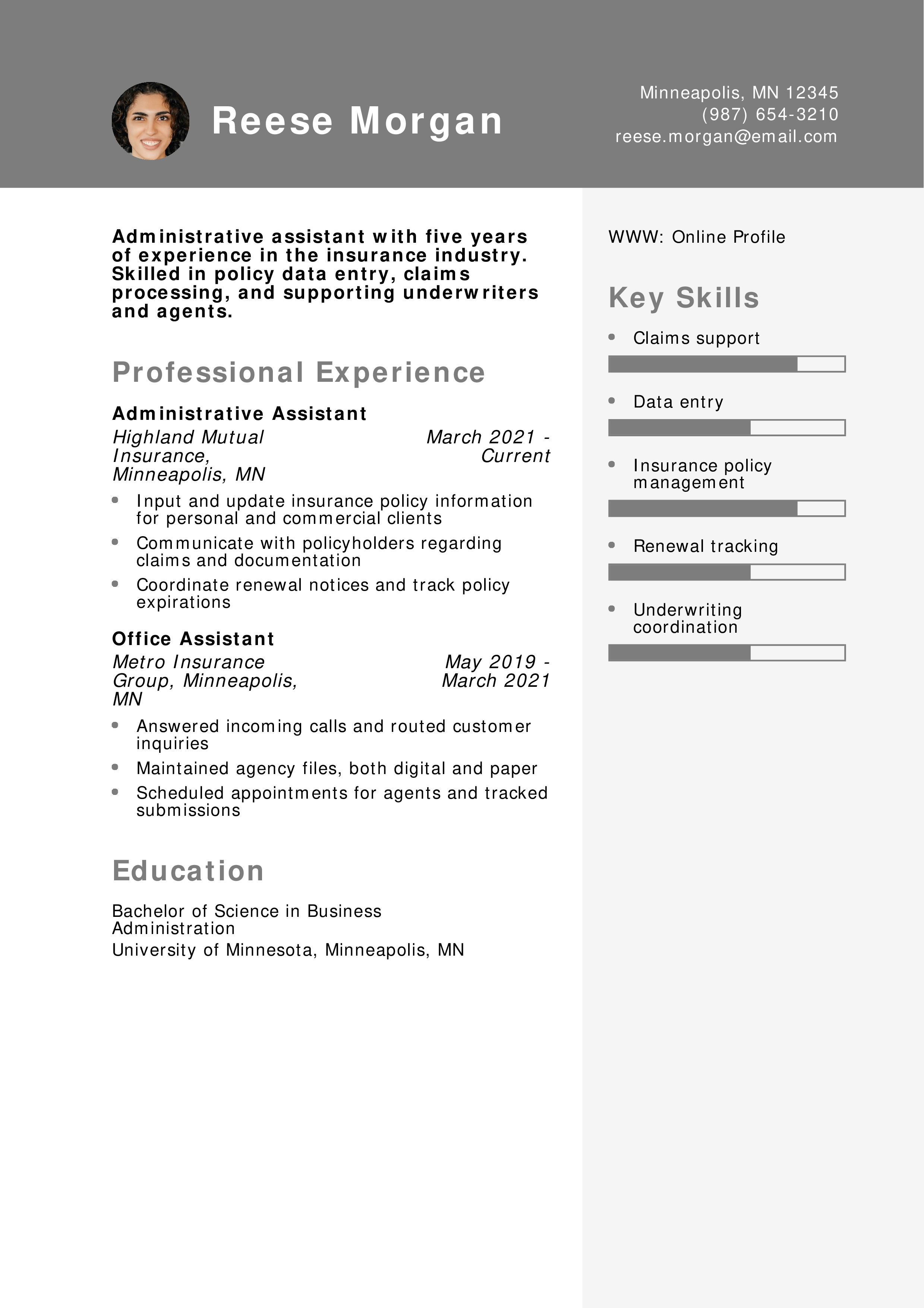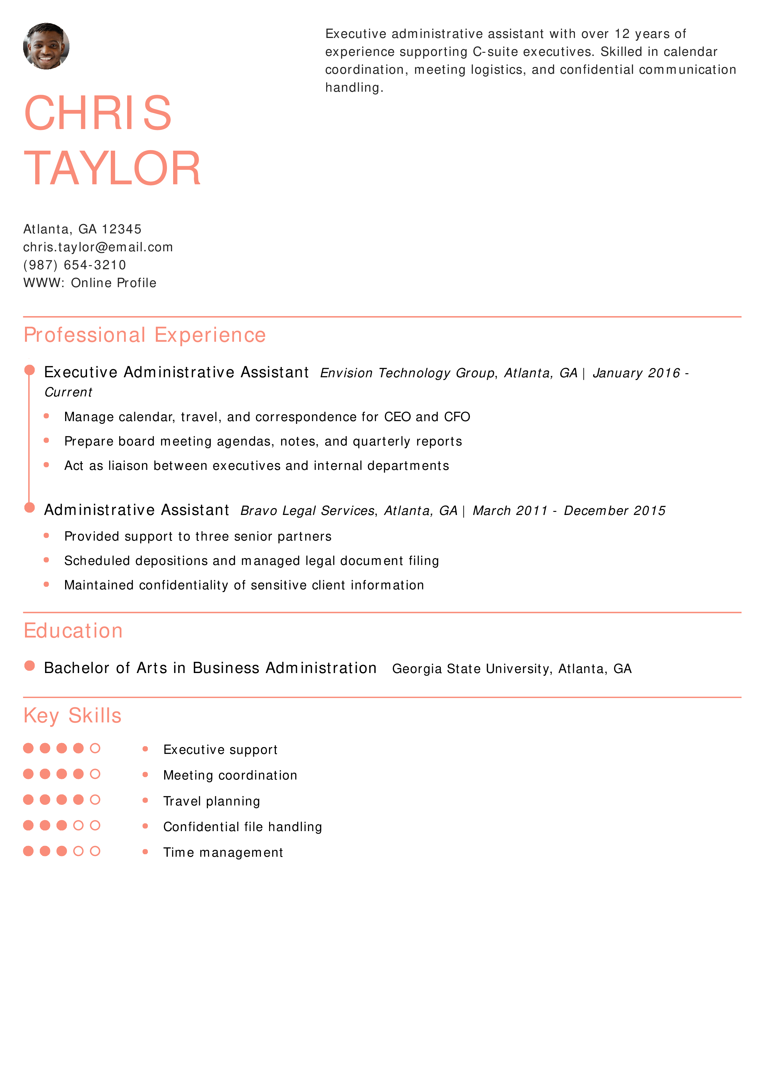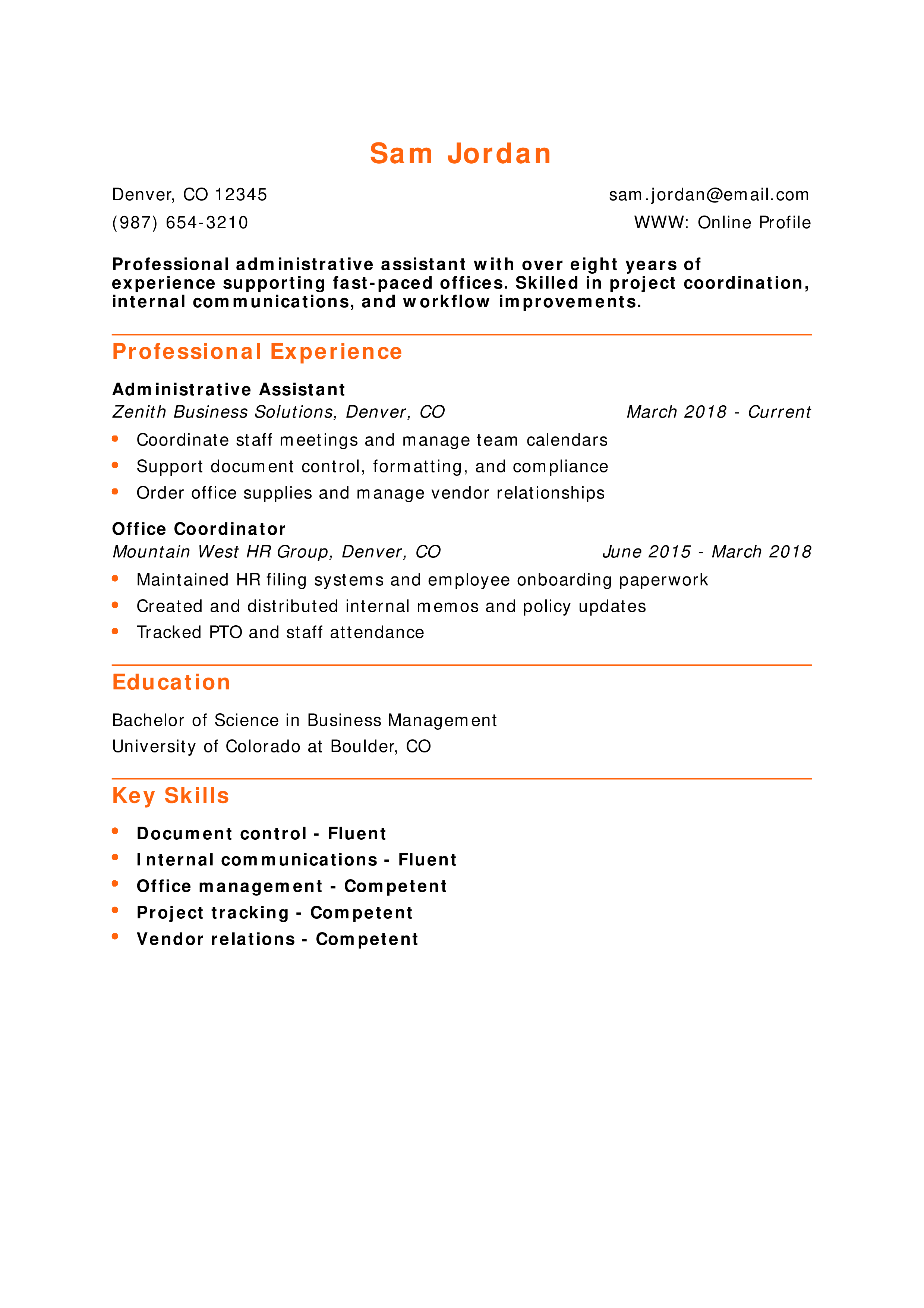 The best administrative assistant resume template focuses on your work experience and has room to list your technical and professional skills. Text should be in a clean and easy-to-read format, with headers and bullet points that allow quick scanning. Hiring managers only spend a few seconds on average per resume, so you need to catch their attention. In most cases, use separate sections for your Profile, Experience, Education, and Key Skills relevant to the job opening.