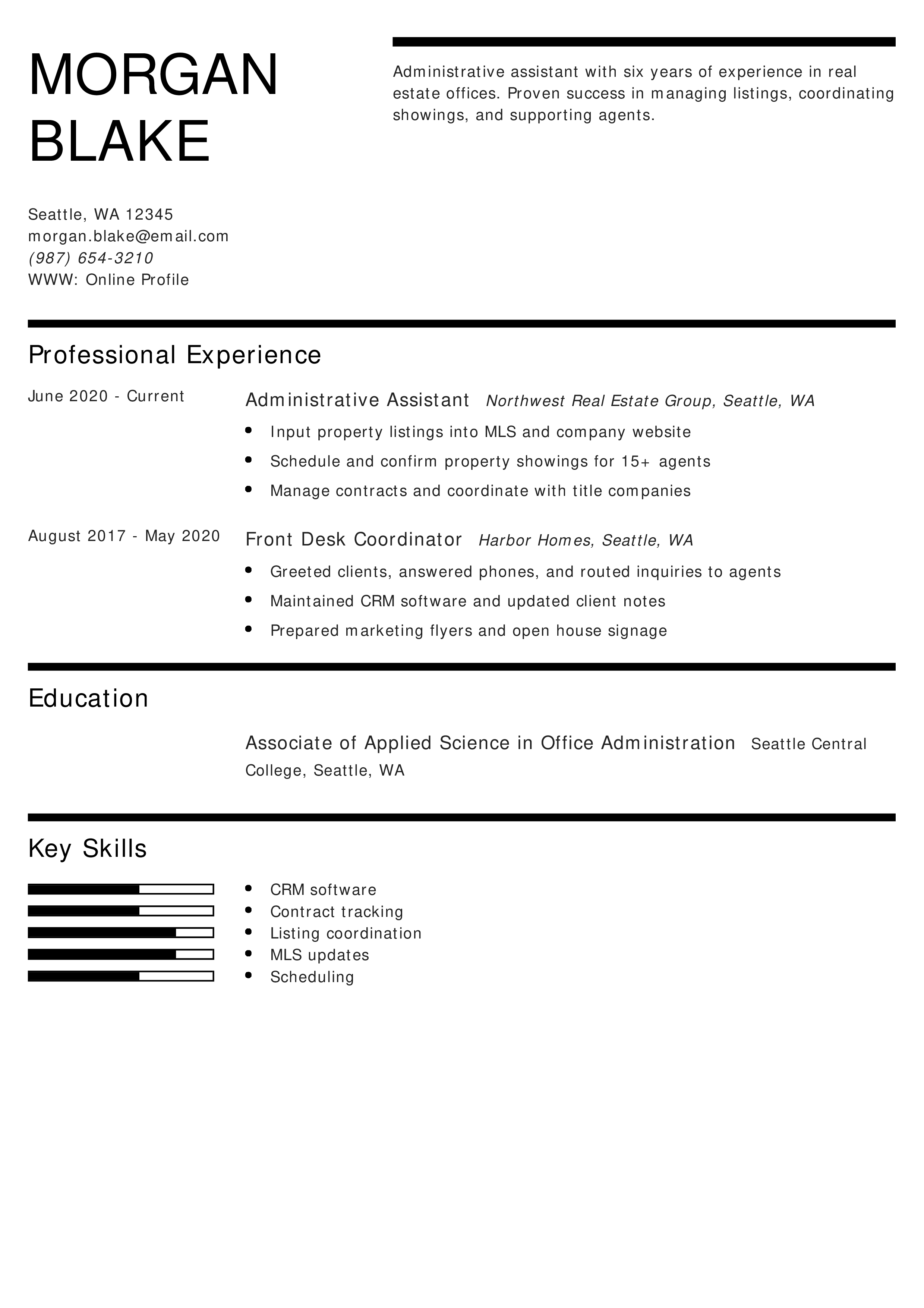 This resume speaks directly to real estate office functions, highlighting listing management and support for multiple agents. For help formatting your resume to fit all details on one page, read should a resume be one page.