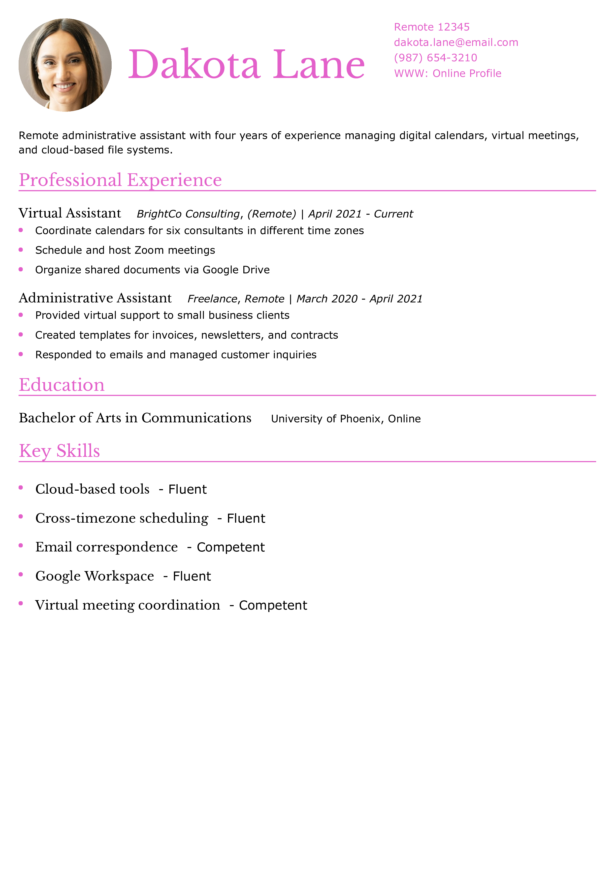 This resume highlights remote work capabilities and cloud-based tools essential for virtual administrative roles. For advice on digital communication and collaboration, check out how to email a resume.