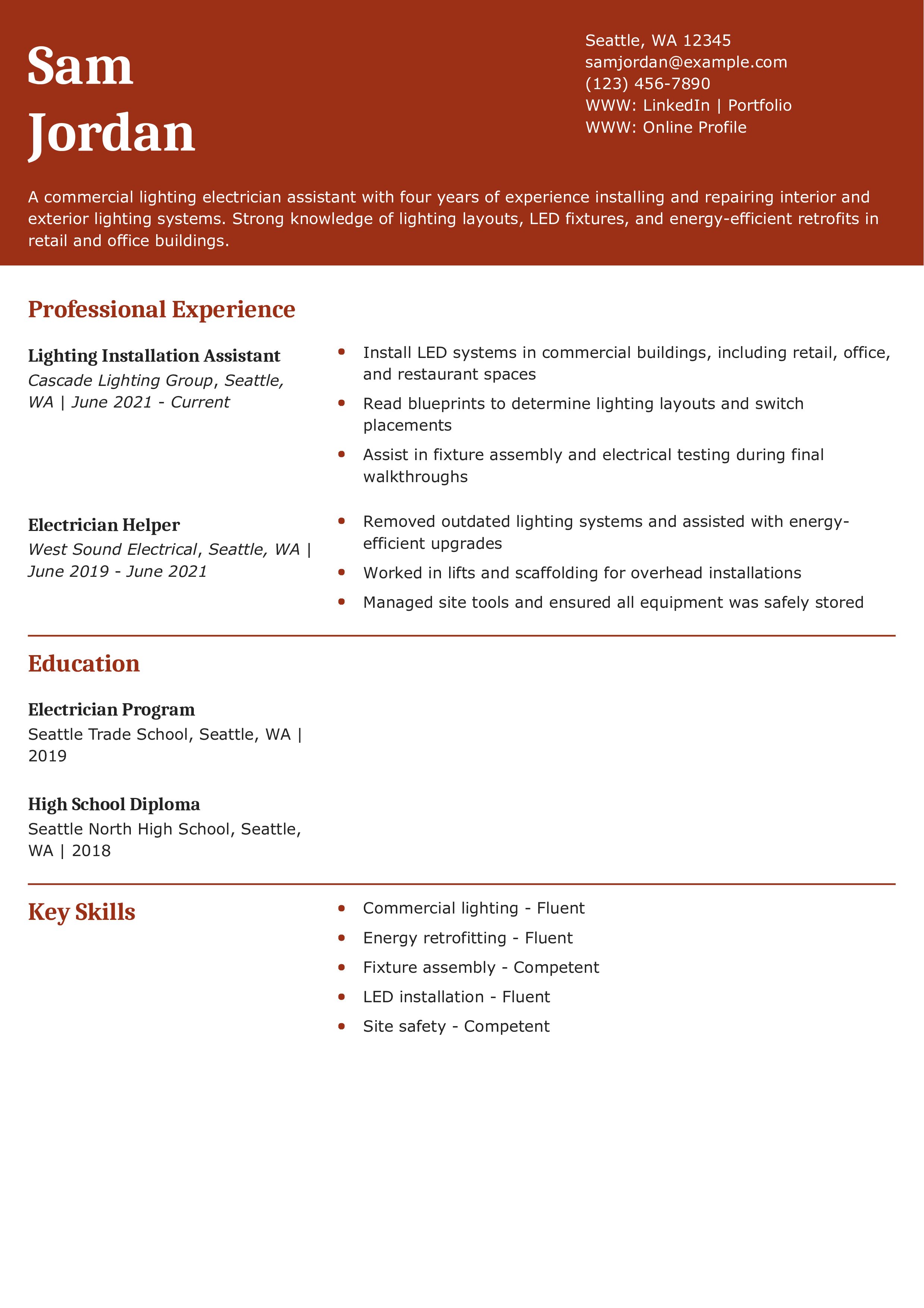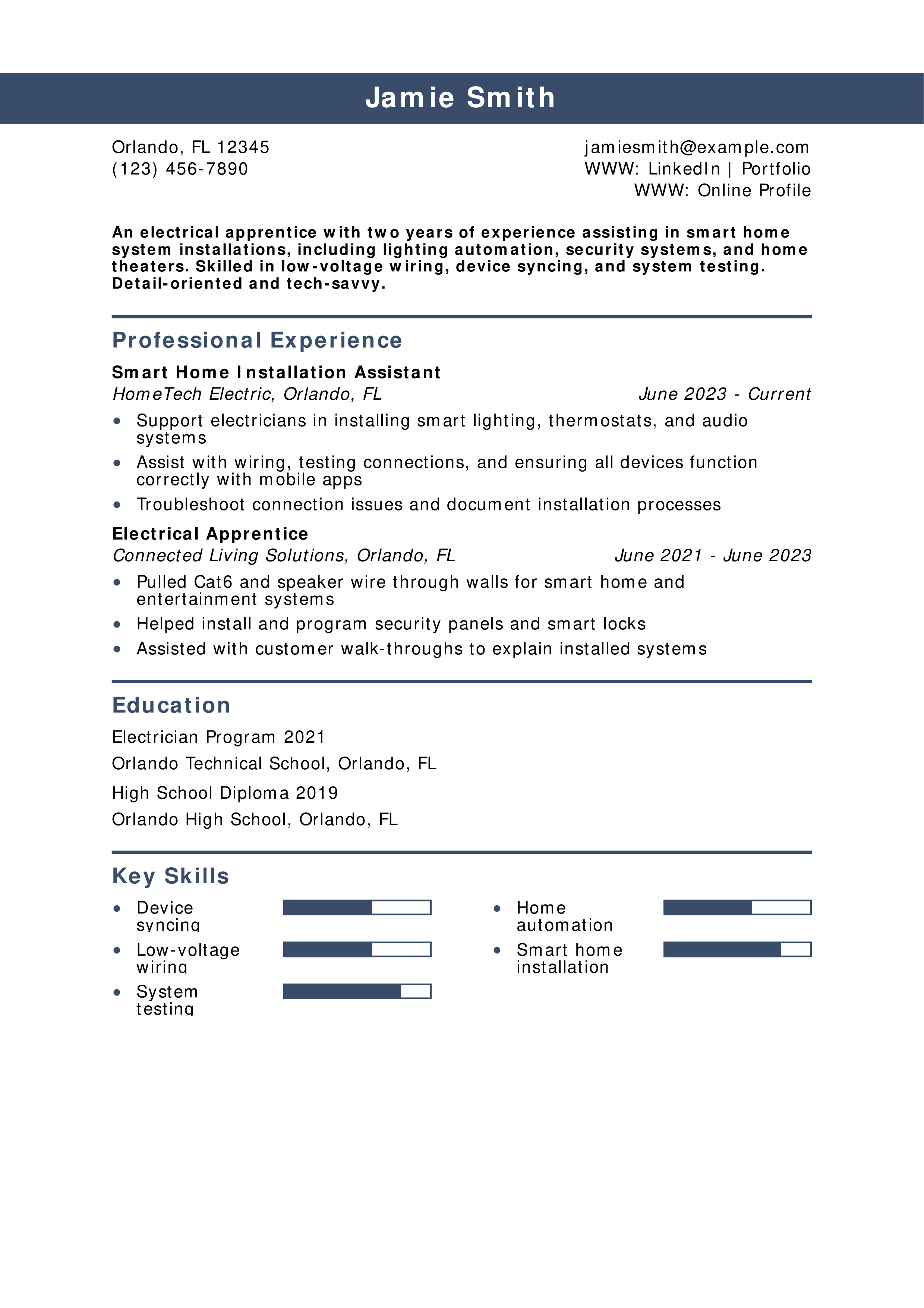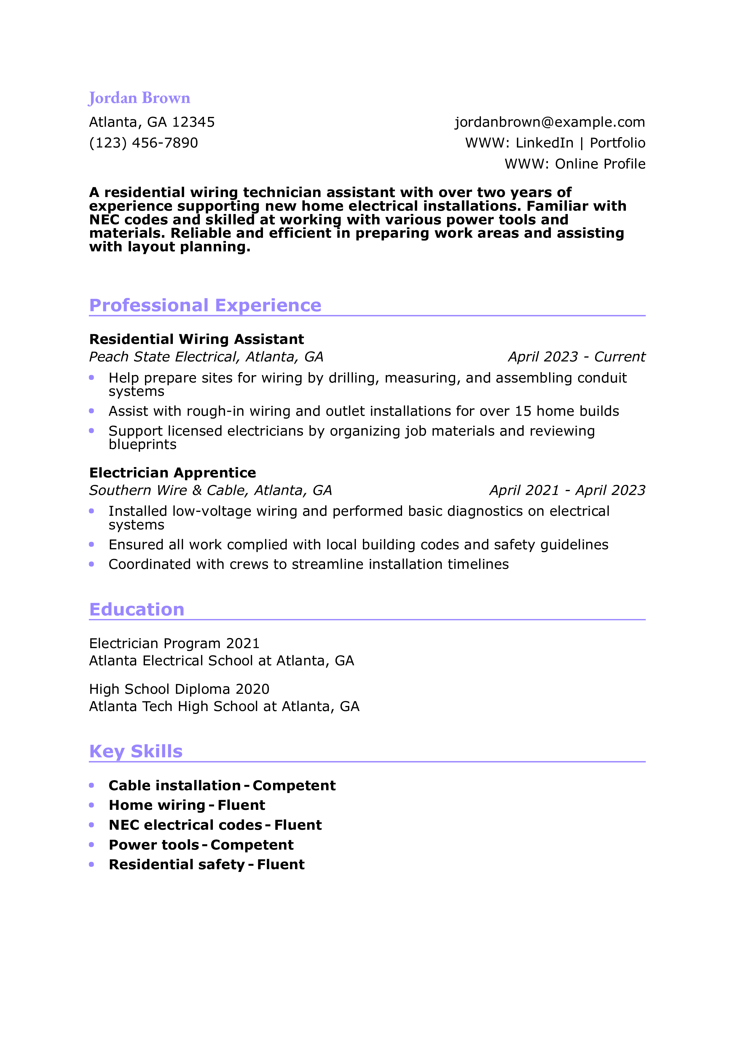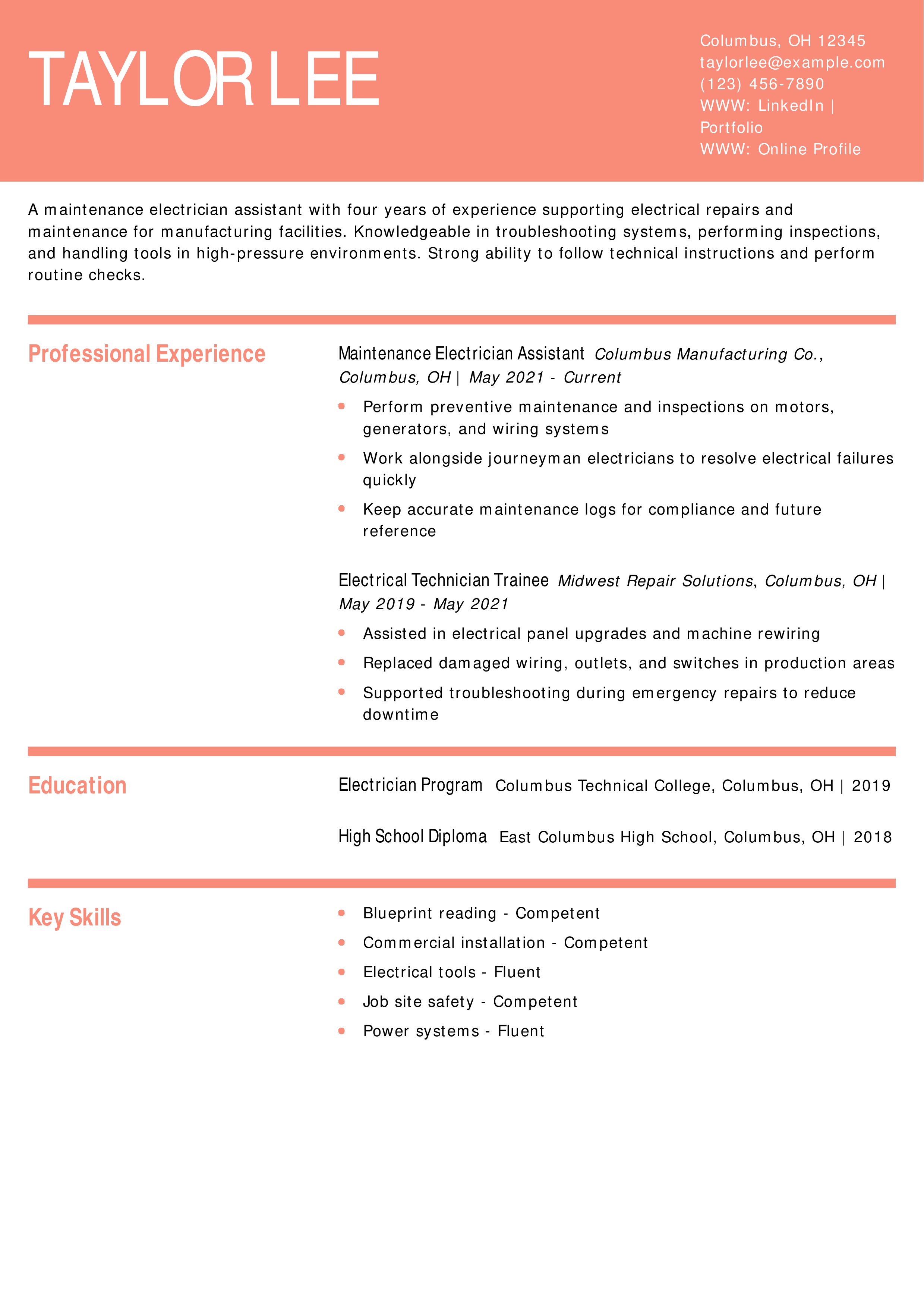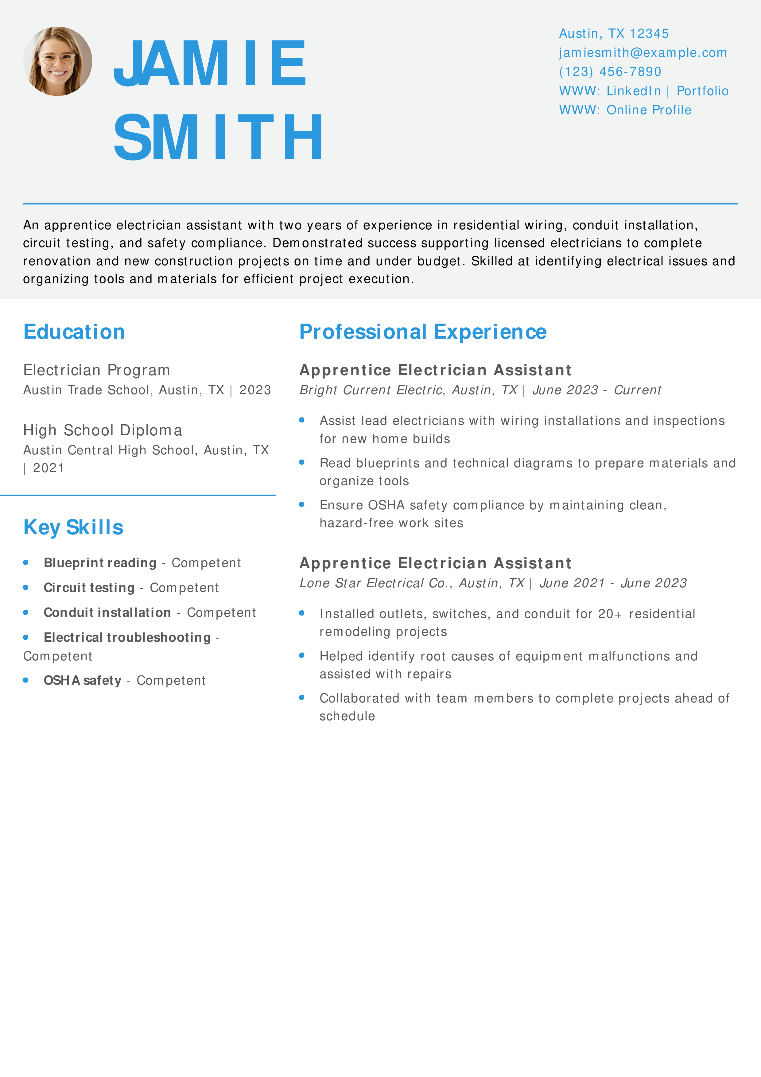 As an electrician assistant apprentice, opt for a reverse chronological format in most instances. This ensures that your most recent and relevant experience is featured toward the top of the document. It’s best to avoid functional resumes even at the entry level, as this type of approach is considered outdated by most hiring managers and recruiters due to a lack of detailed bullet points and accomplishments.