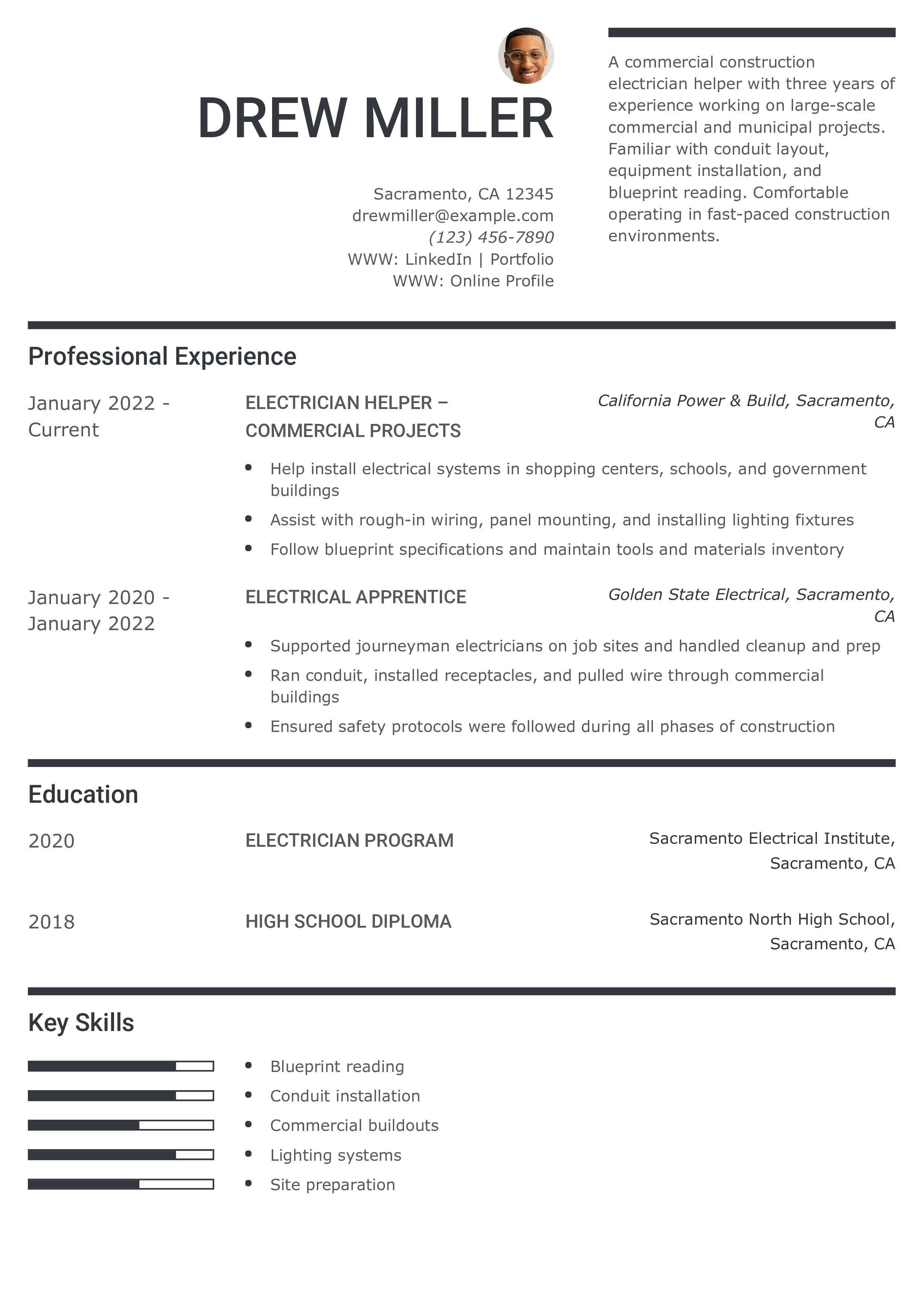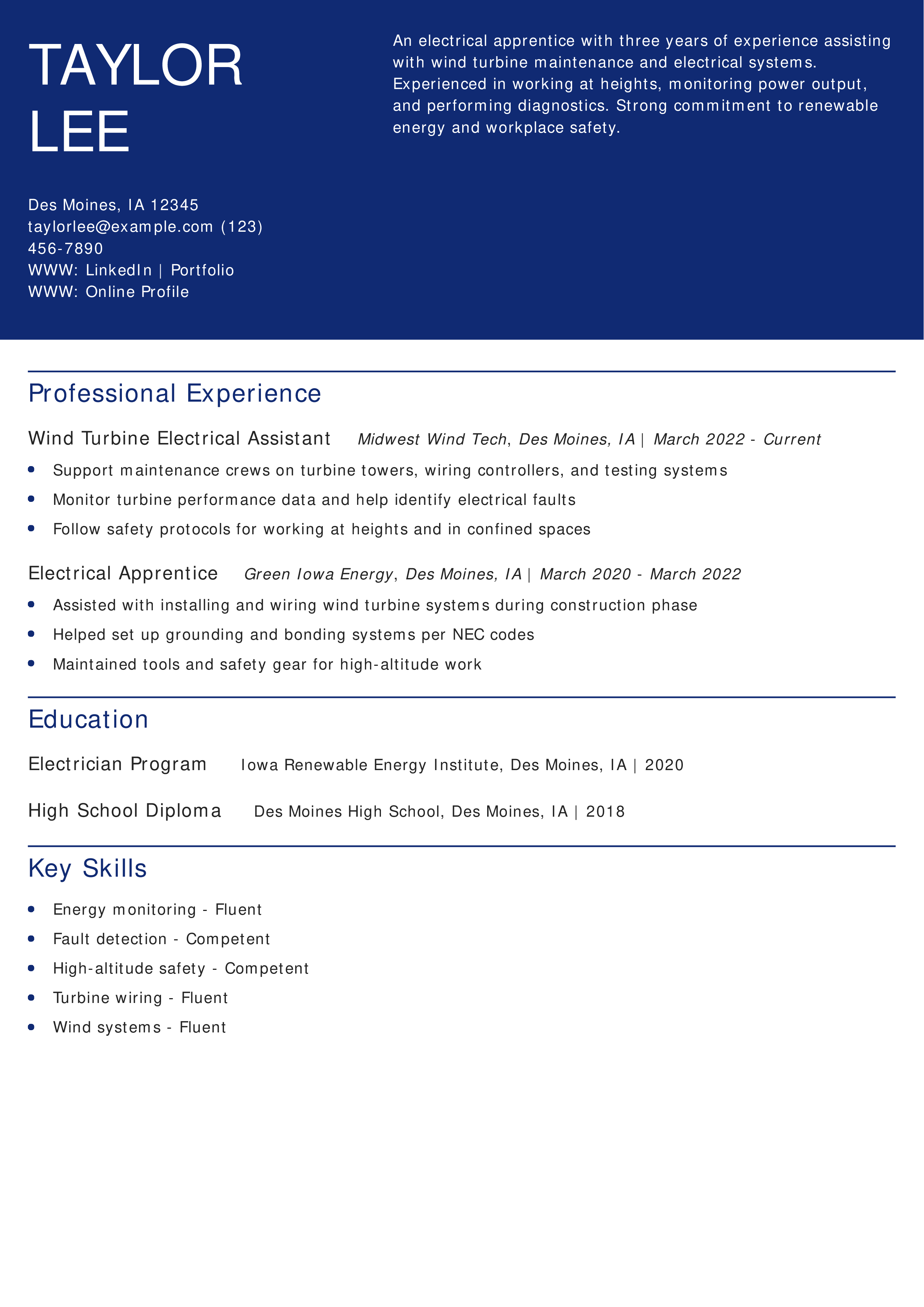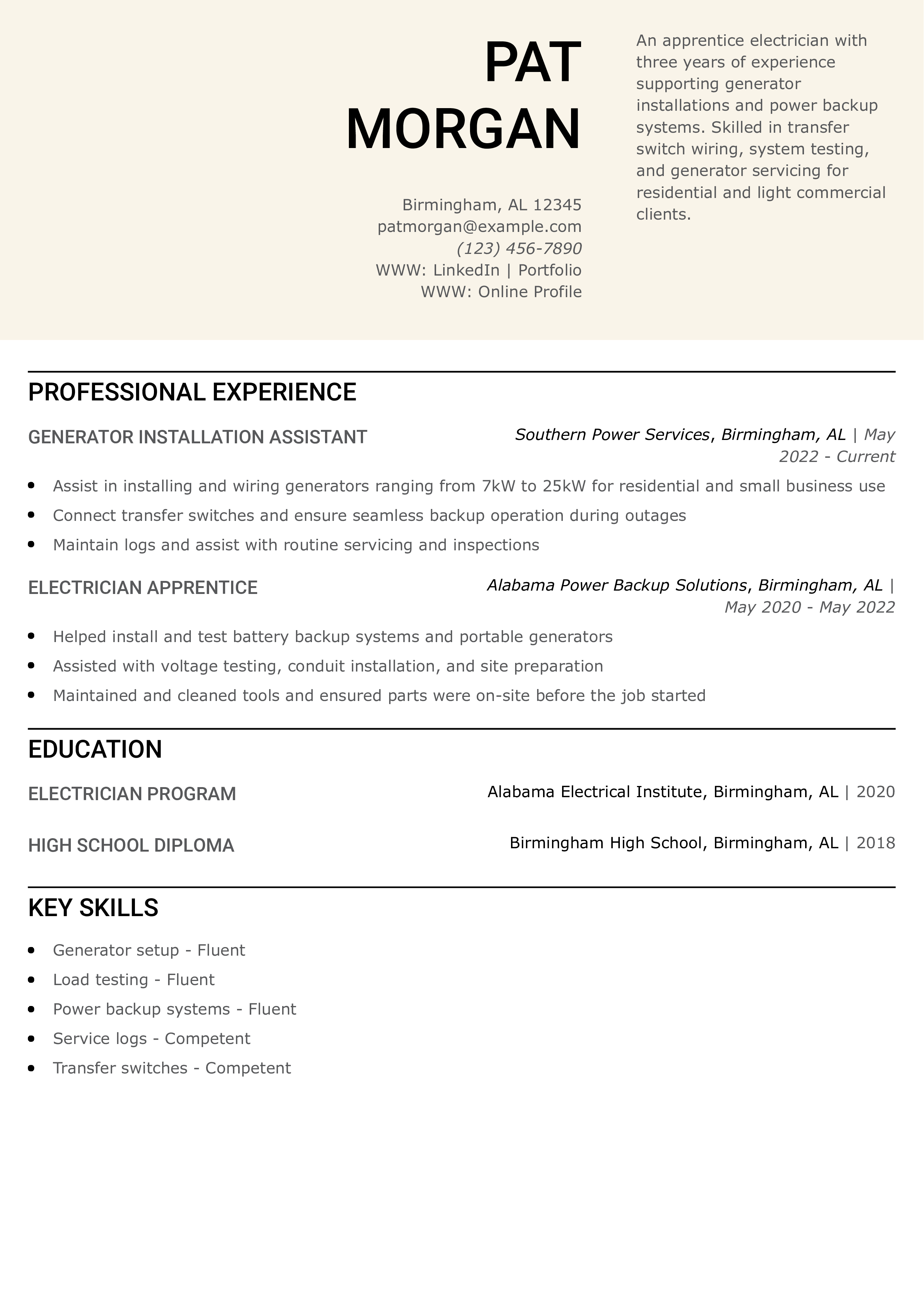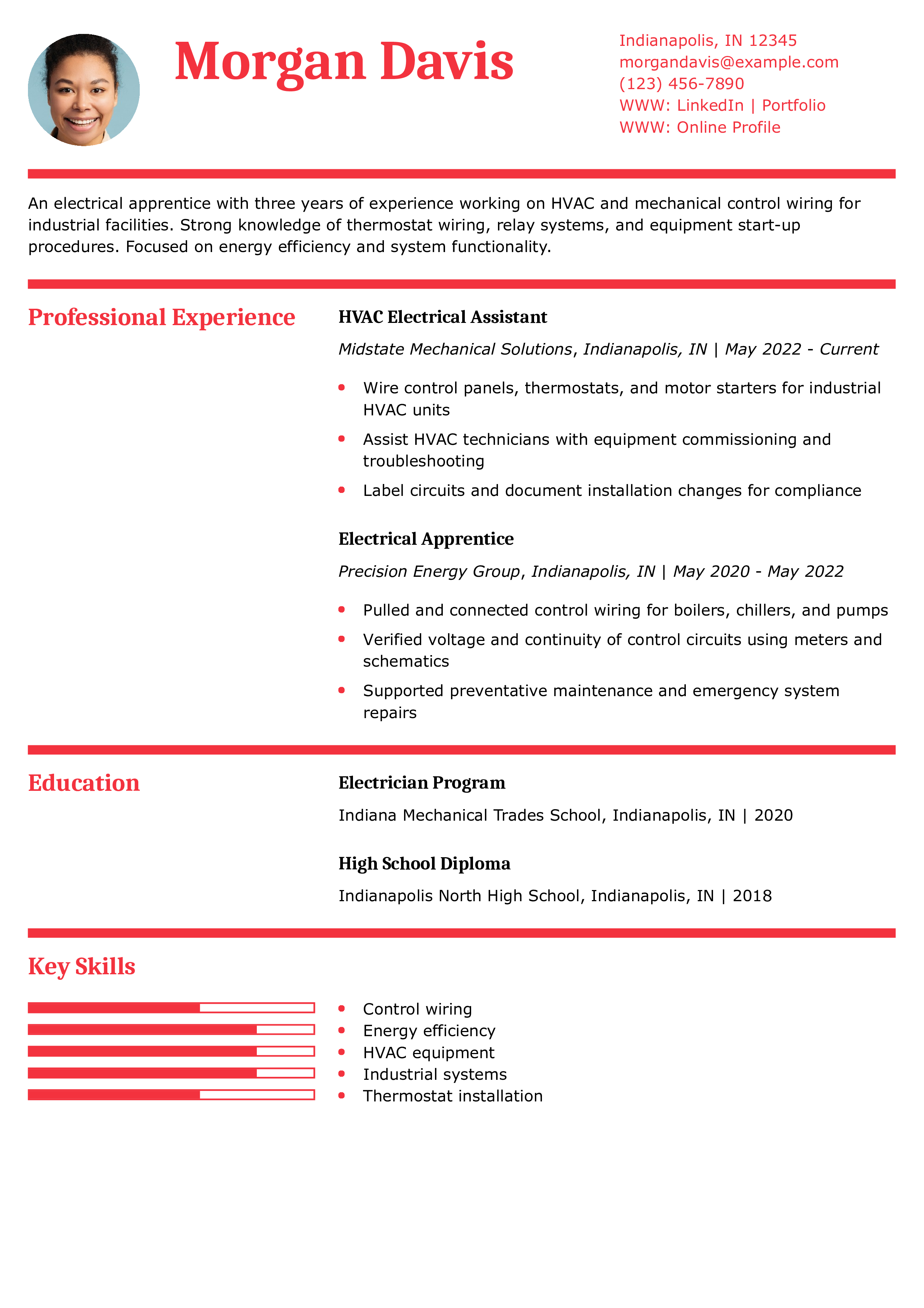 As an electrician assistant apprentice, opt for a reverse chronological format in most instances. This ensures that your most recent and relevant experience is featured toward the top of the document. It’s best to avoid functional resumes even at the entry level, as this type of approach is considered outdated by most hiring managers and recruiters due to a lack of detailed bullet points and accomplishments.