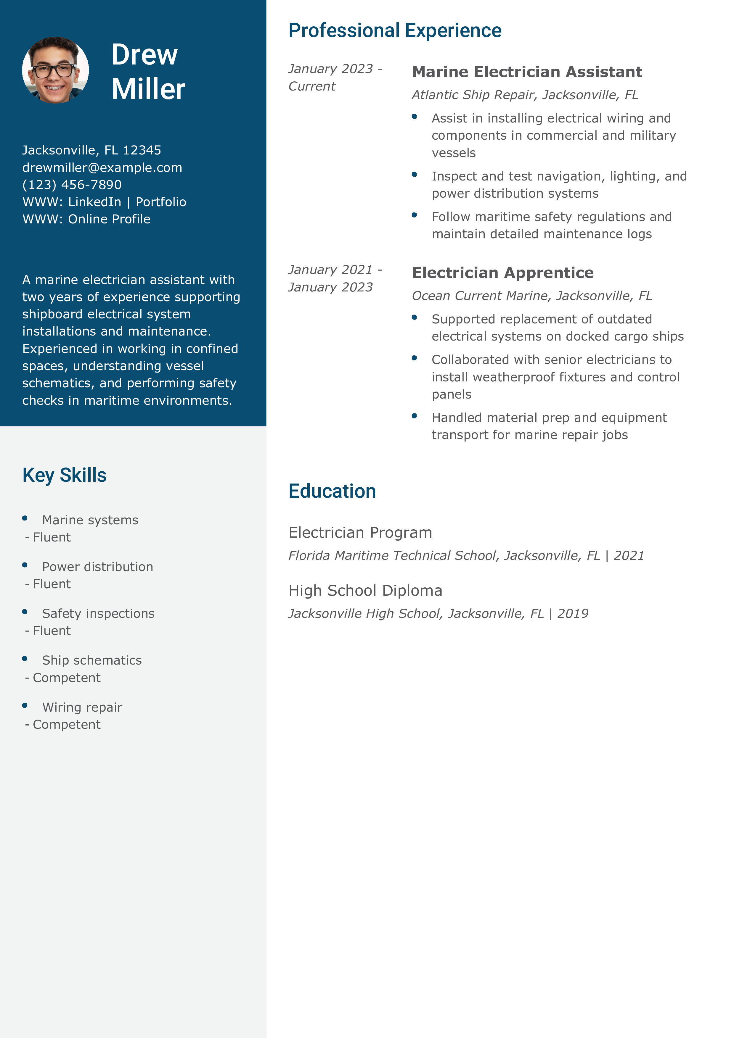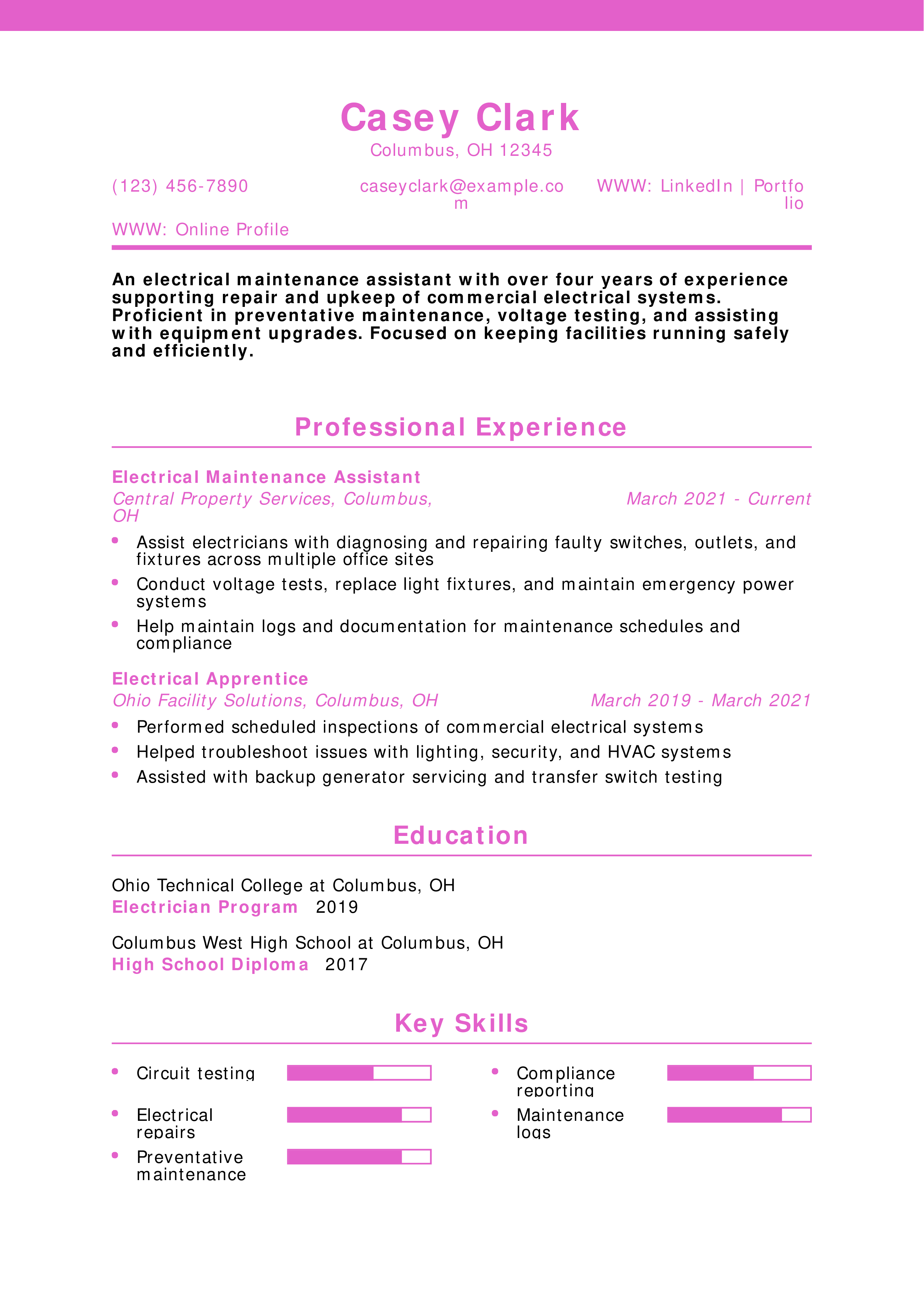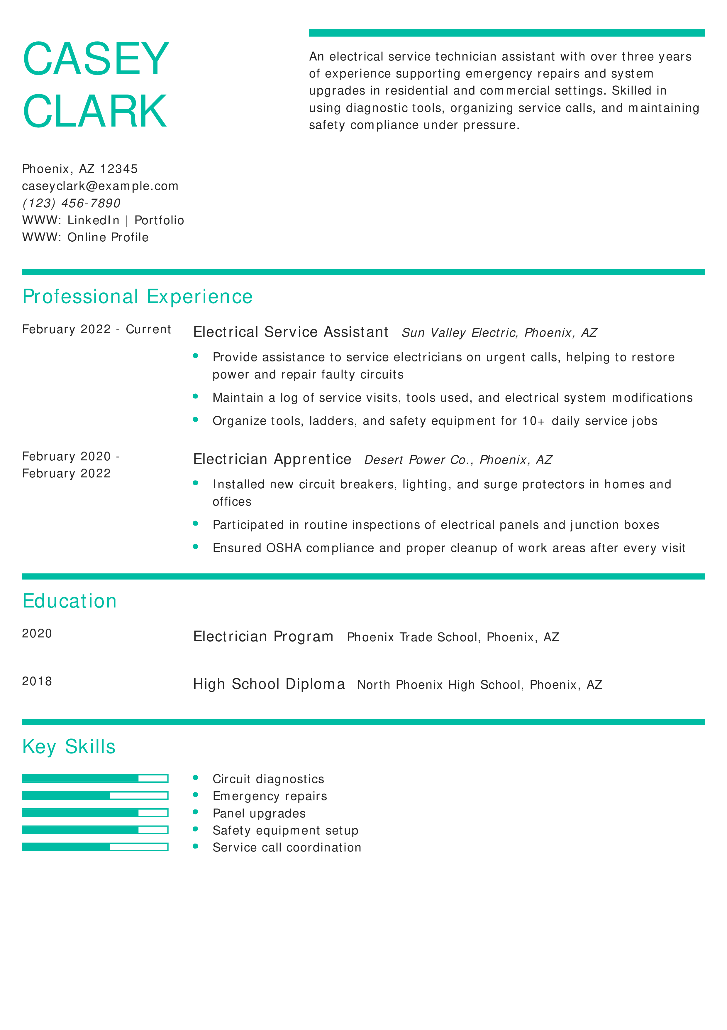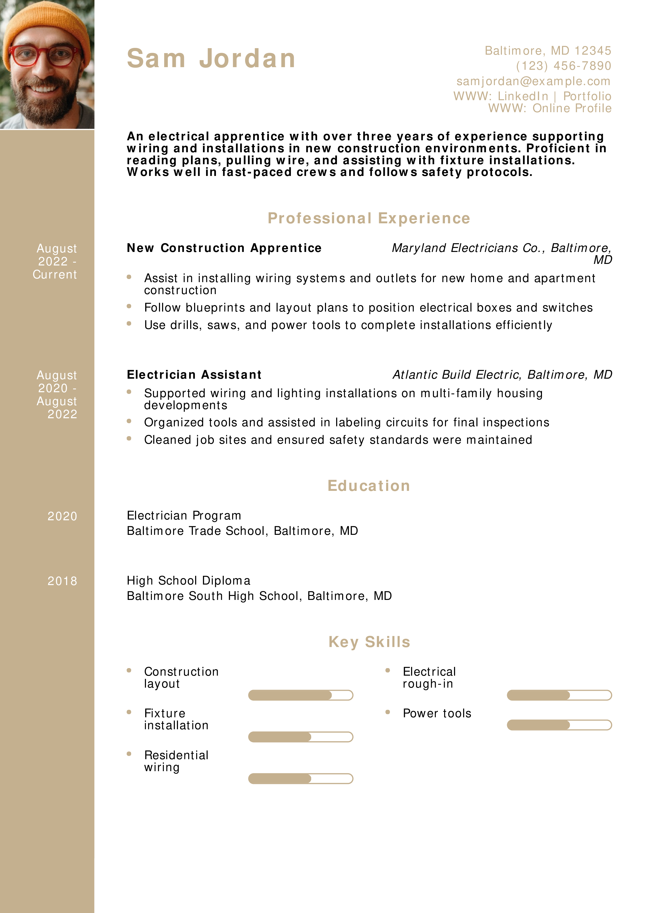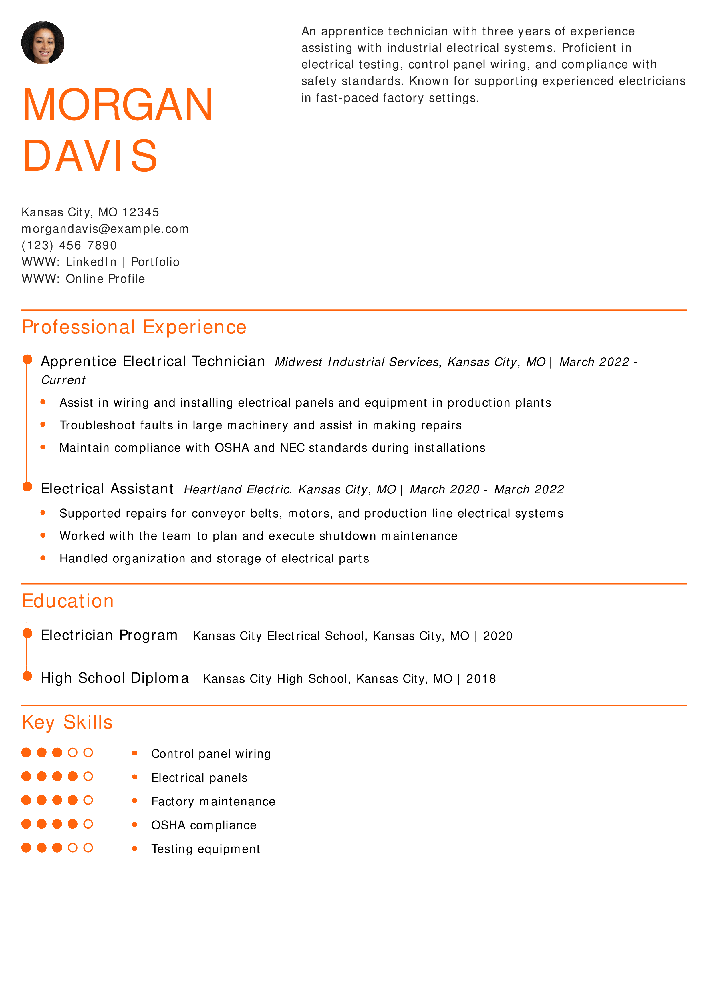 As an electrician assistant apprentice, opt for a reverse chronological format in most instances. This ensures that your most recent and relevant experience is featured toward the top of the document. It’s best to avoid functional resumes even at the entry level, as this type of approach is considered outdated by most hiring managers and recruiters due to a lack of detailed bullet points and accomplishments.