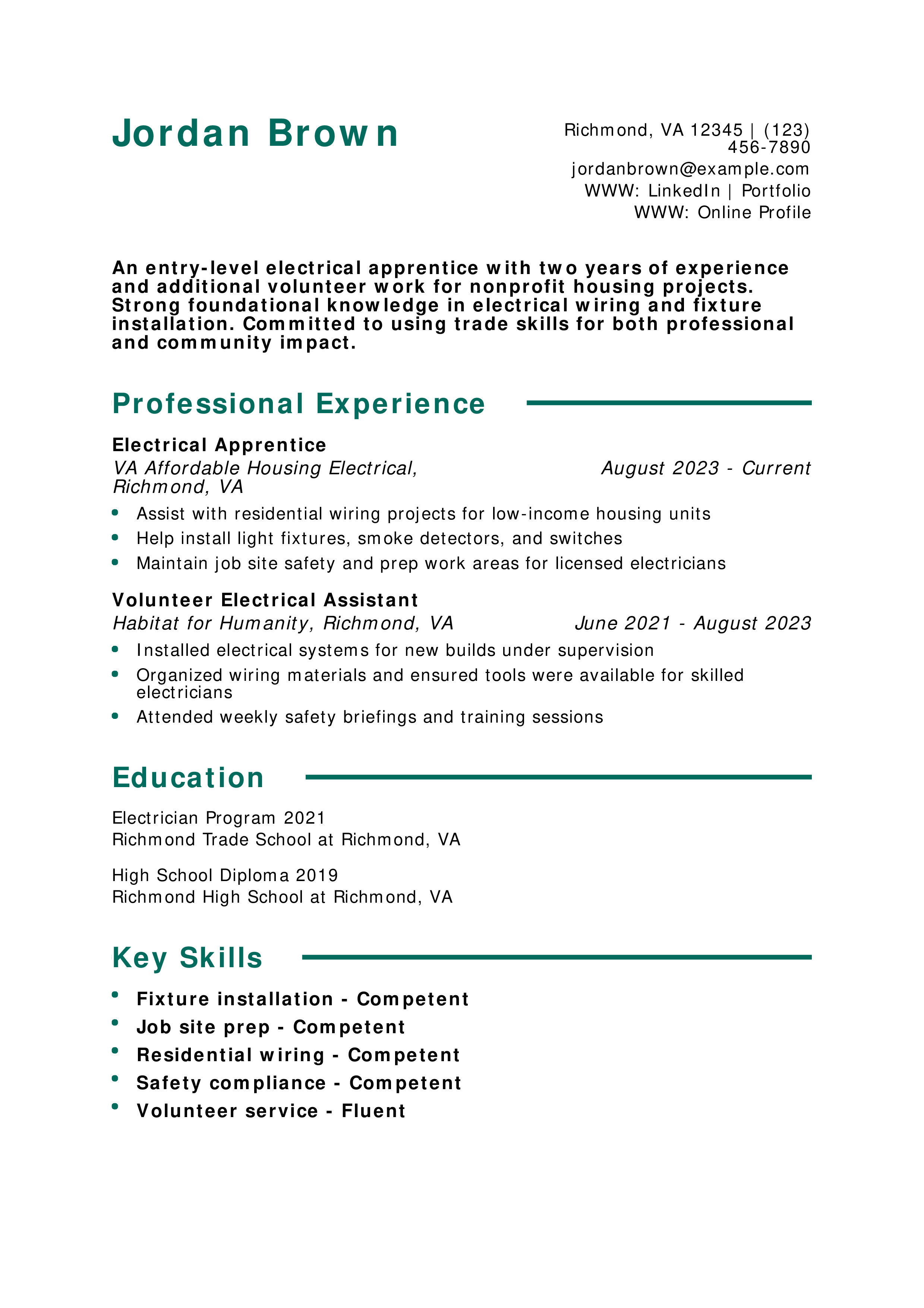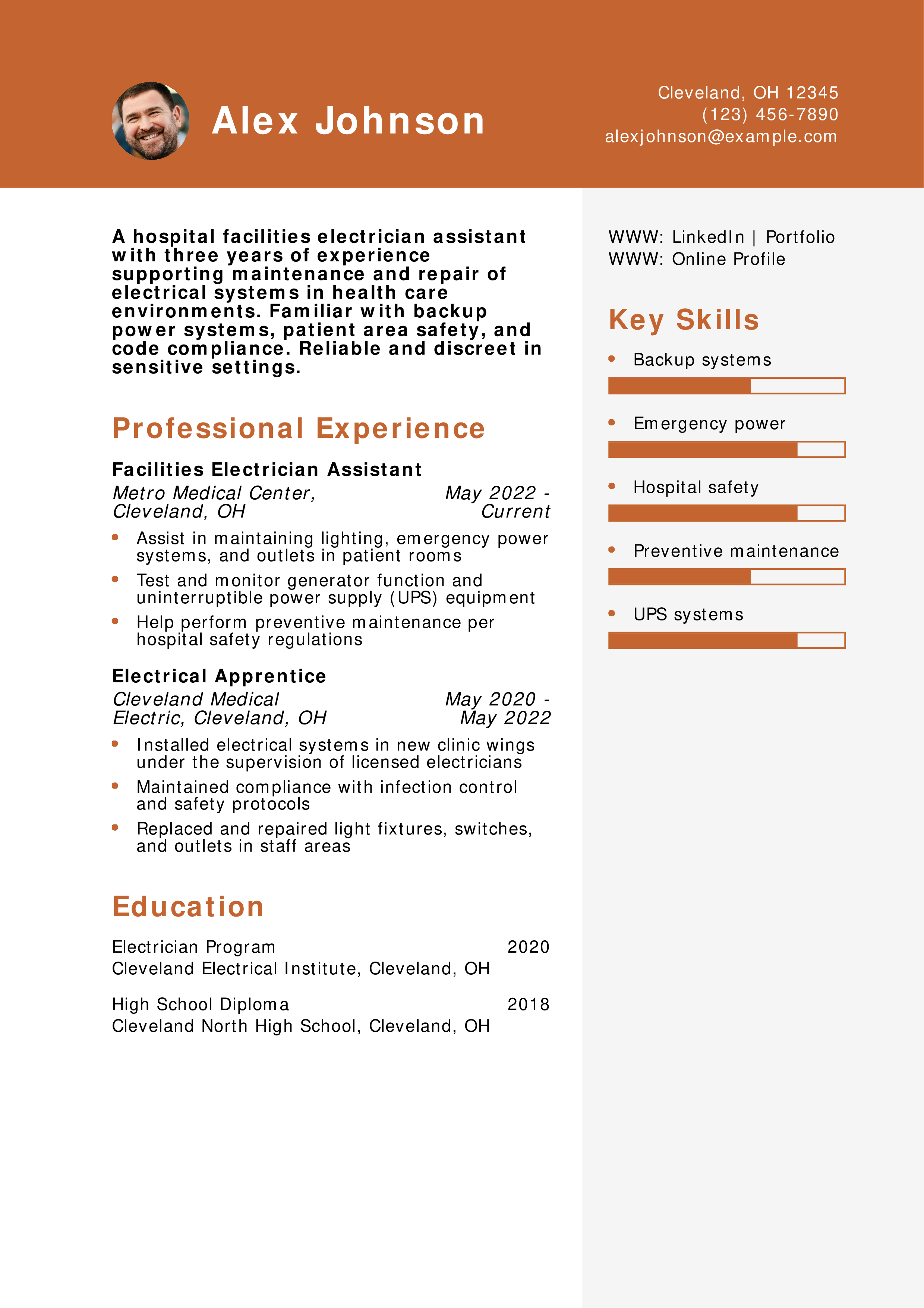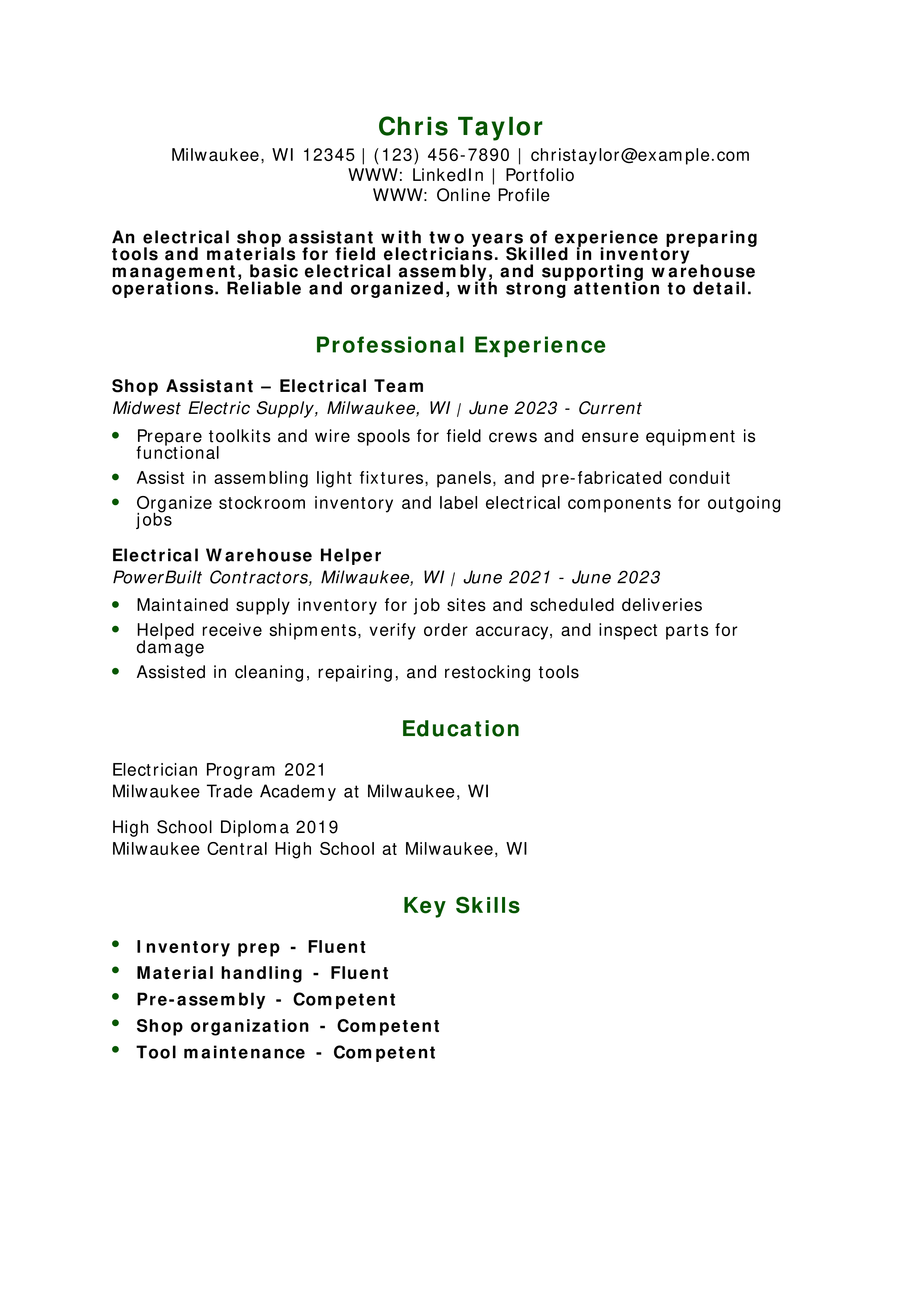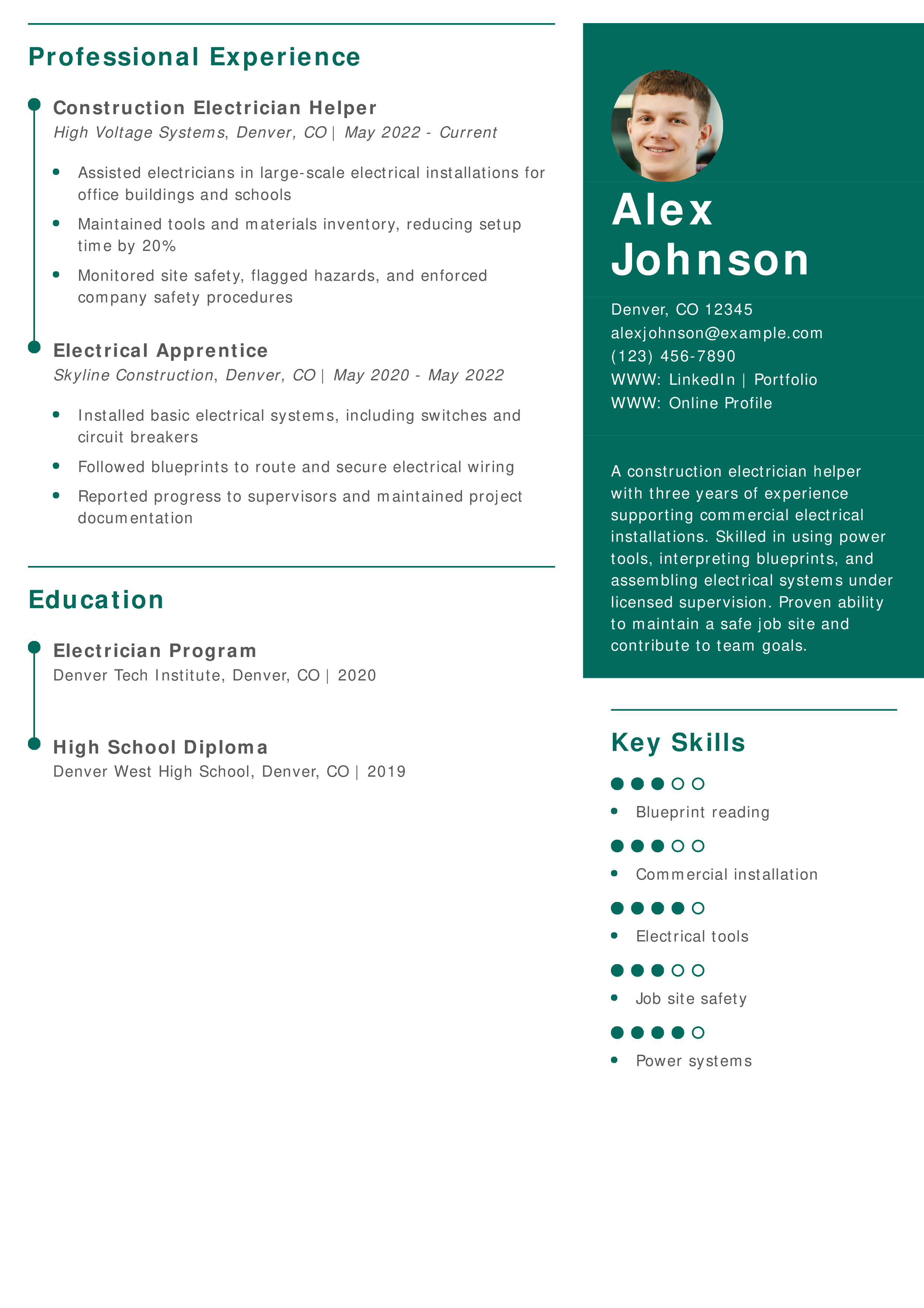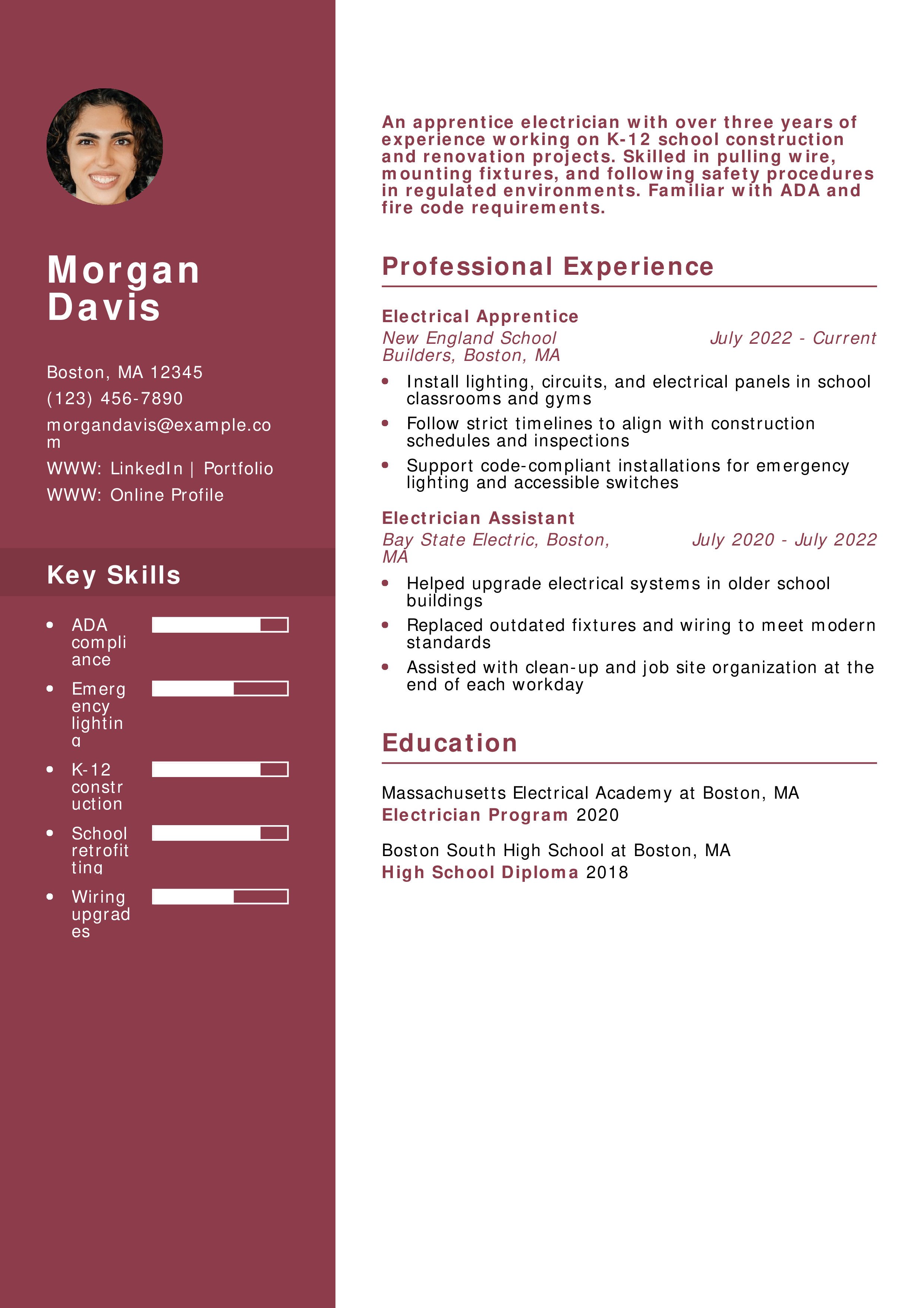 As an electrician assistant apprentice, opt for a reverse chronological format in most instances. This ensures that your most recent and relevant experience is featured toward the top of the document. It’s best to avoid functional resumes even at the entry level, as this type of approach is considered outdated by most hiring managers and recruiters due to a lack of detailed bullet points and accomplishments.