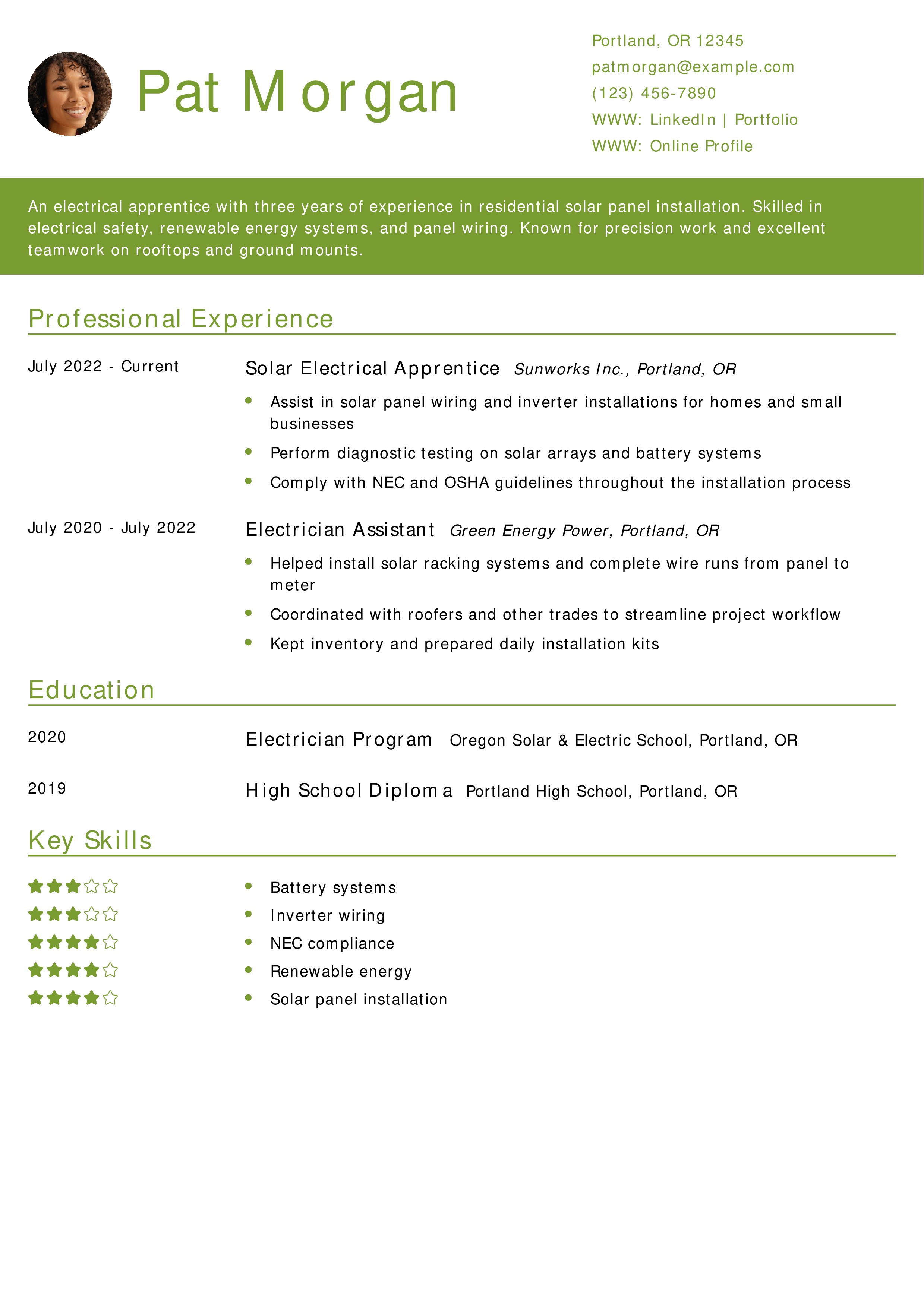 This resume is strong because it highlights renewable energy work, showcasing technical ability and specialized safety training. For advice on education formatting, check out How To List Your Education on a Resume.