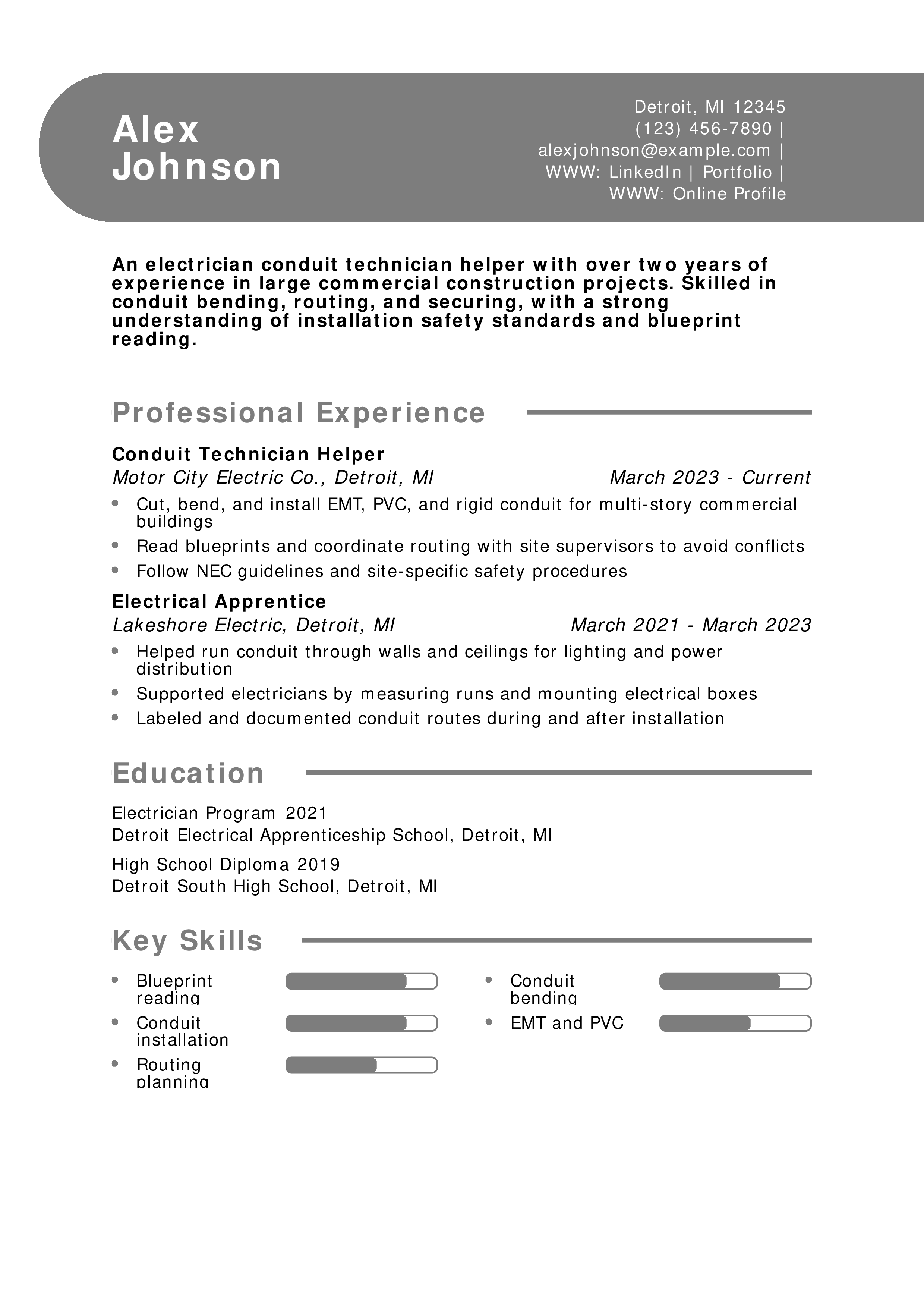 This resume is effective because it focuses on a specific skill set of conduit work highly valued on construction sites. Learn how to build a skills-focused resume with Resume Skills.