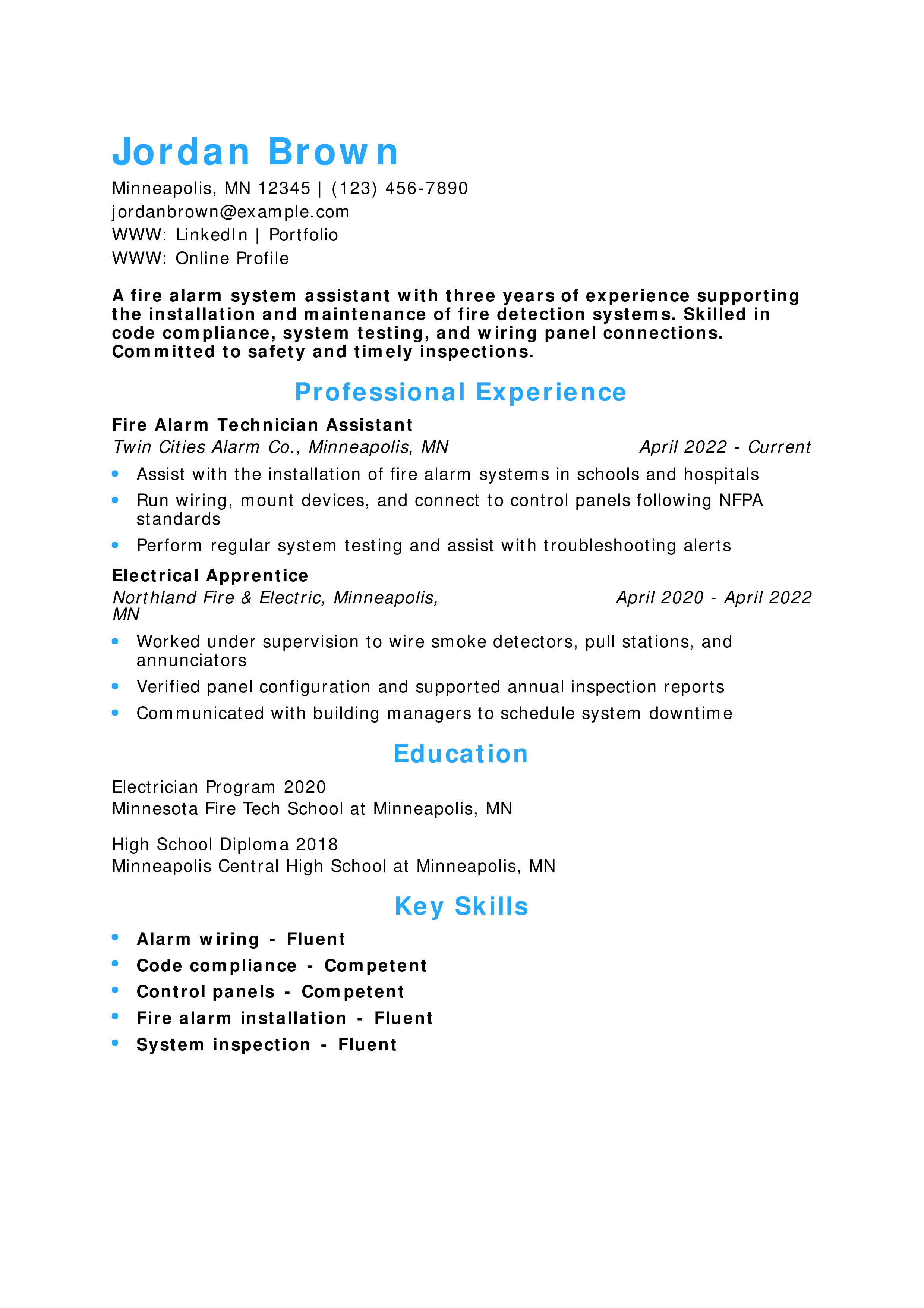This resume is effective because it emphasizes fire alarm systems, a highly regulated and specialized area of electrical work. For more help on listing experience, check out Resume Outline Examples.