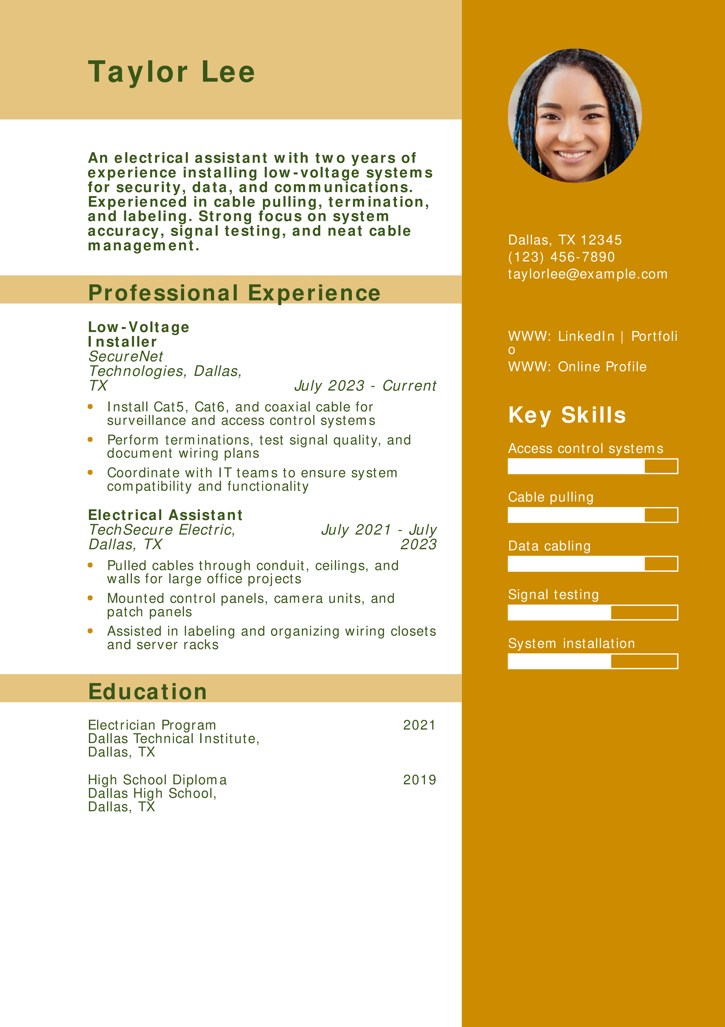 This resume stands out because it focuses on low-voltage and tech-based installations, a growing niche in the electrical field. Learn how to highlight certifications in this field with How To List Certifications on a Resume.