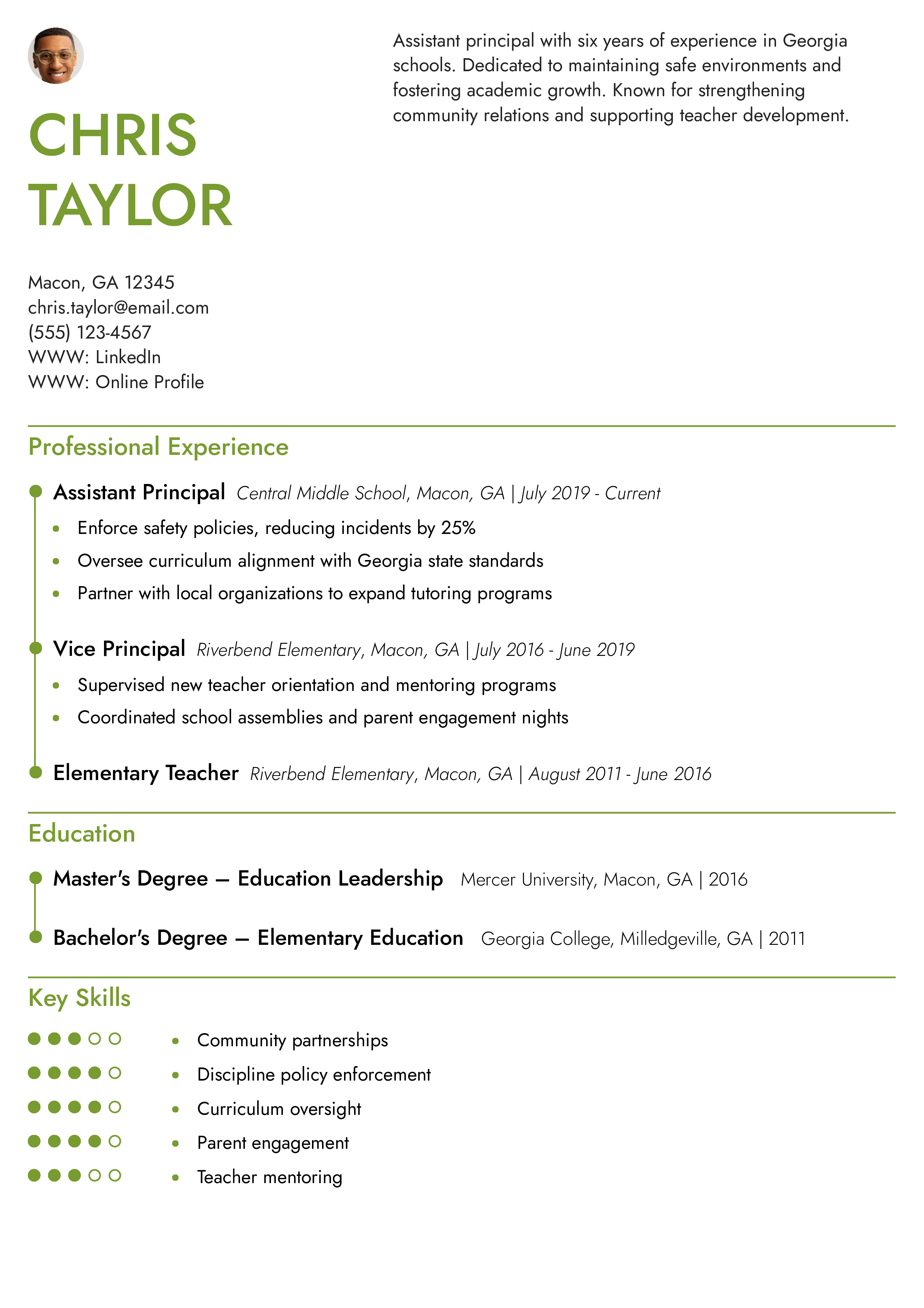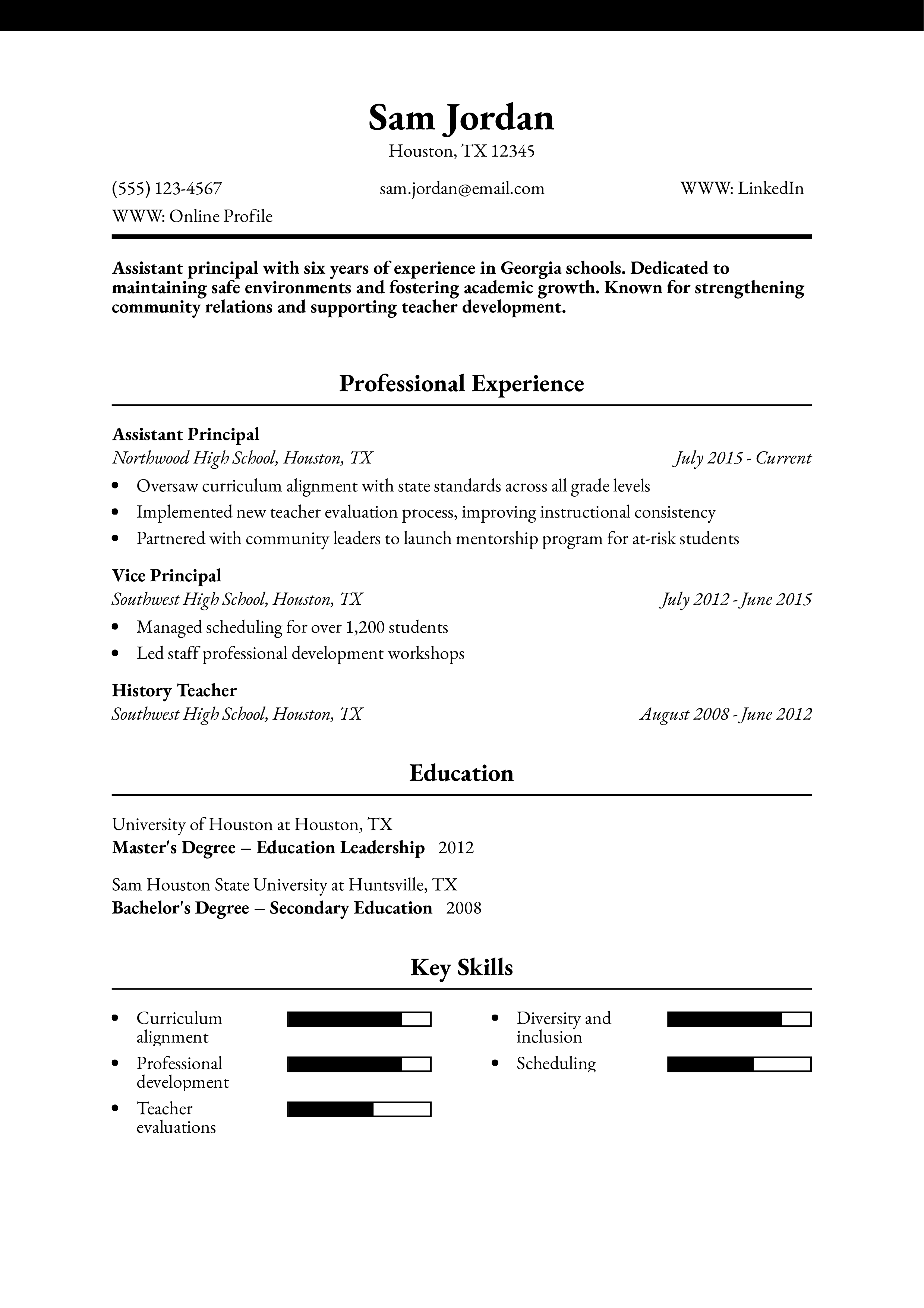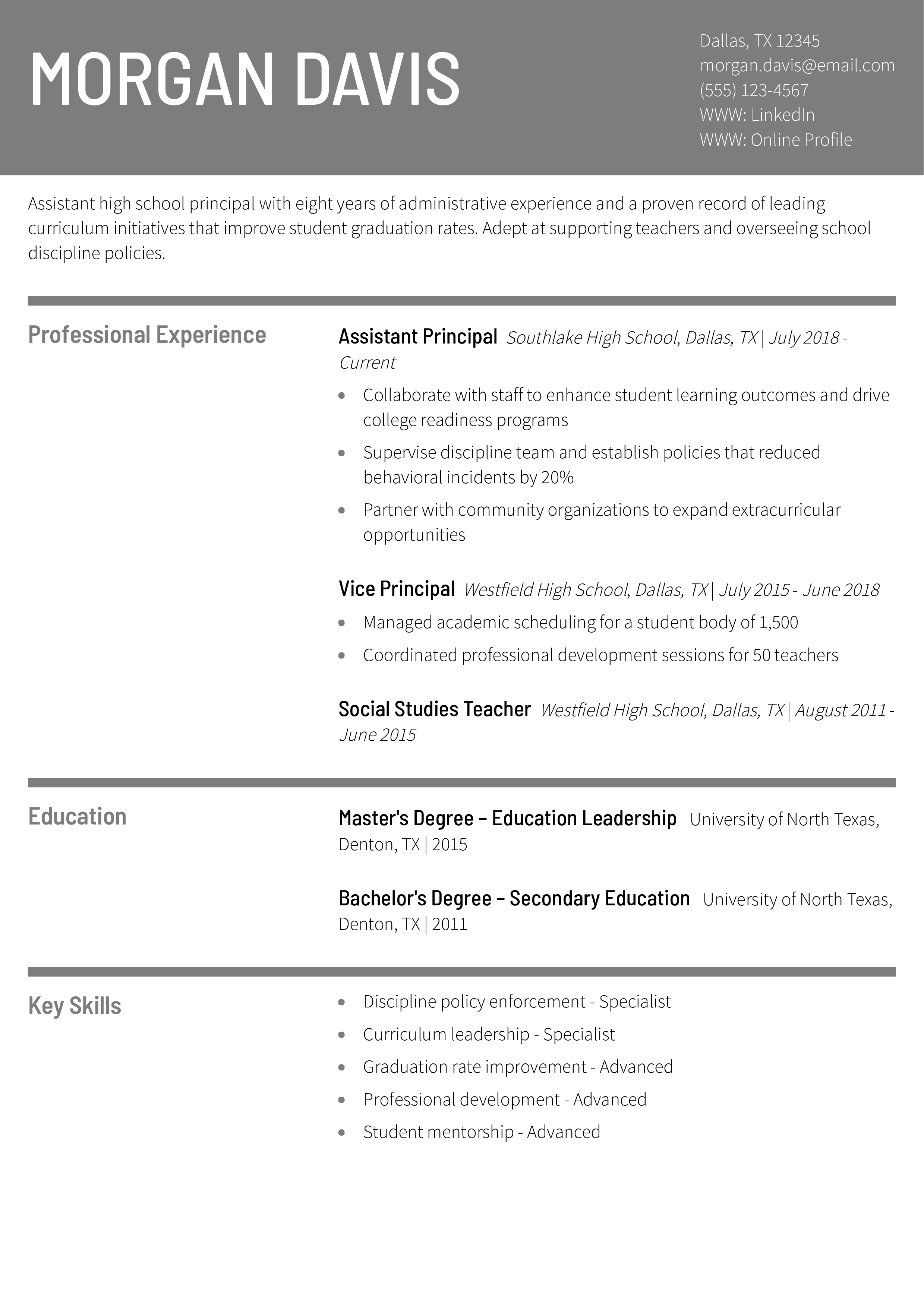 Reverse chronological is the ideal format for assistant principal resumes. This lets you showcase your most recent and relevant education experience while highlighting your career progression. A combination format can also be advantageous, especially if you’re transitioning from a teaching role to an assistant principal position. This approach enables you to feature relevant skills, certifications, or teaching committees above your professional experience.