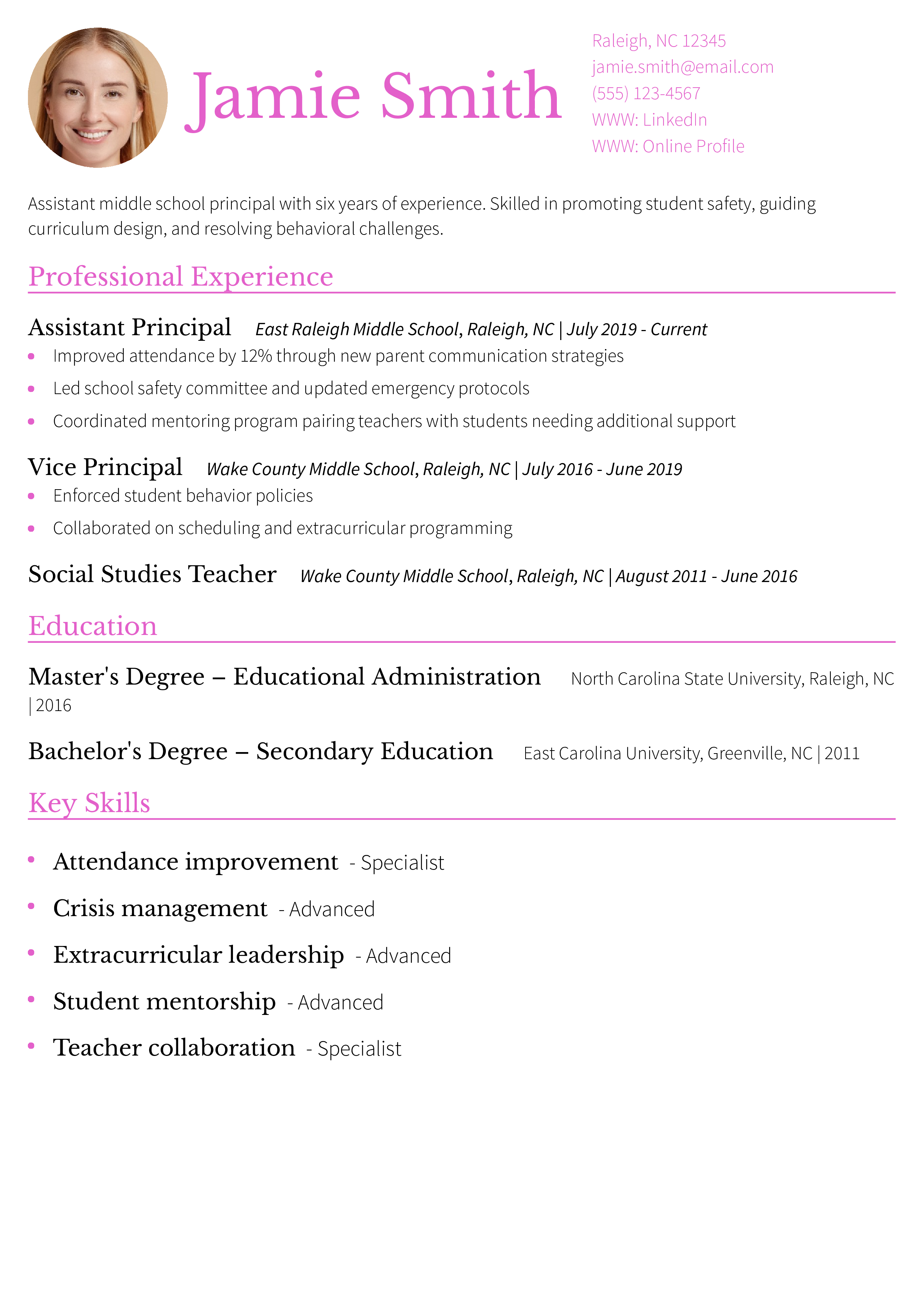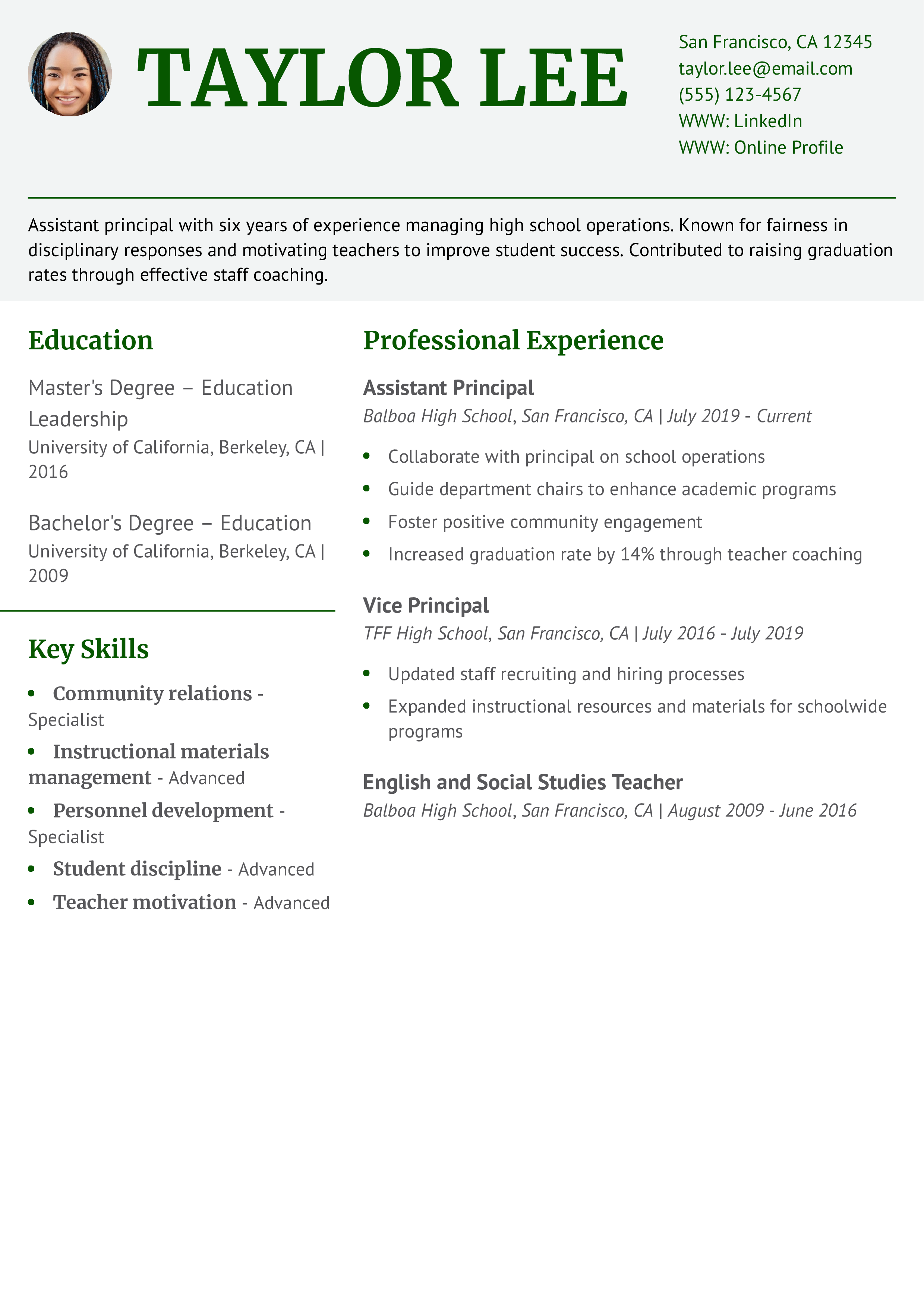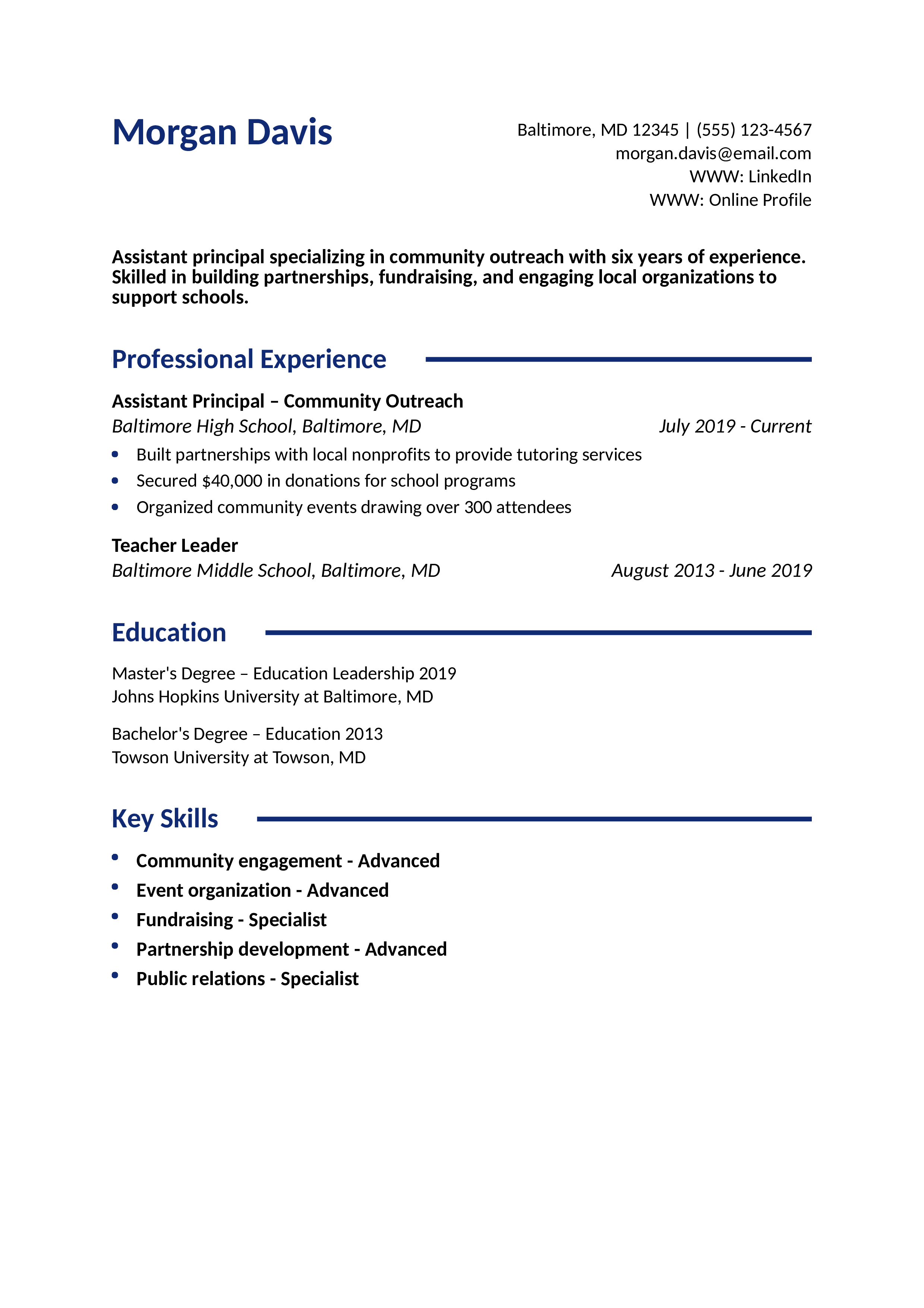 For example, if a school seeks an assistant principal passionate about diversity, equity, and inclusion (DEI), emphasize your background in establishing inclusive school communities and safe student learning environments. If an organization is seeking a candidate with a vast knowledge of teaching methodologies, you might feature your knowledge of differentiated instruction or student-centered learning.