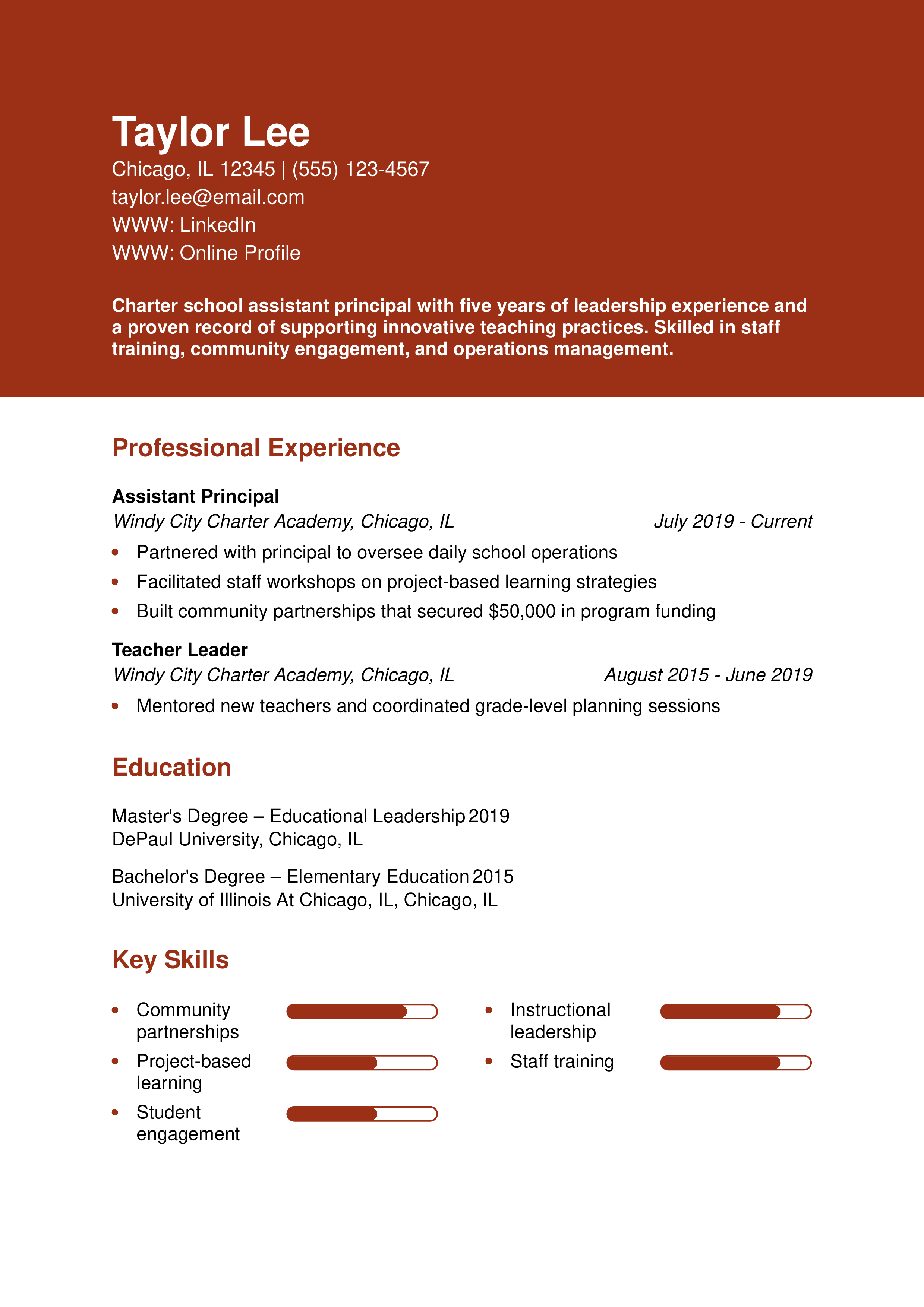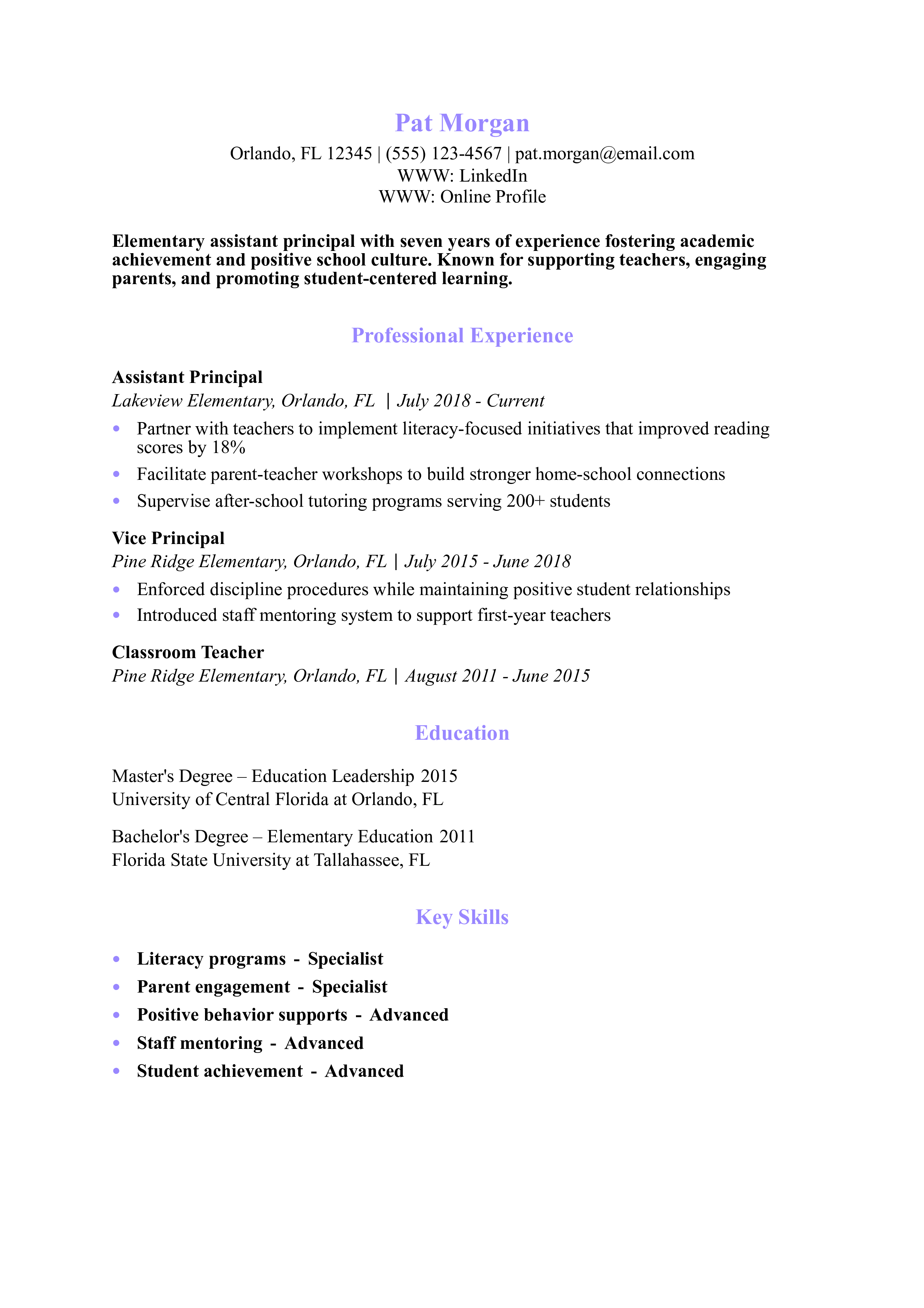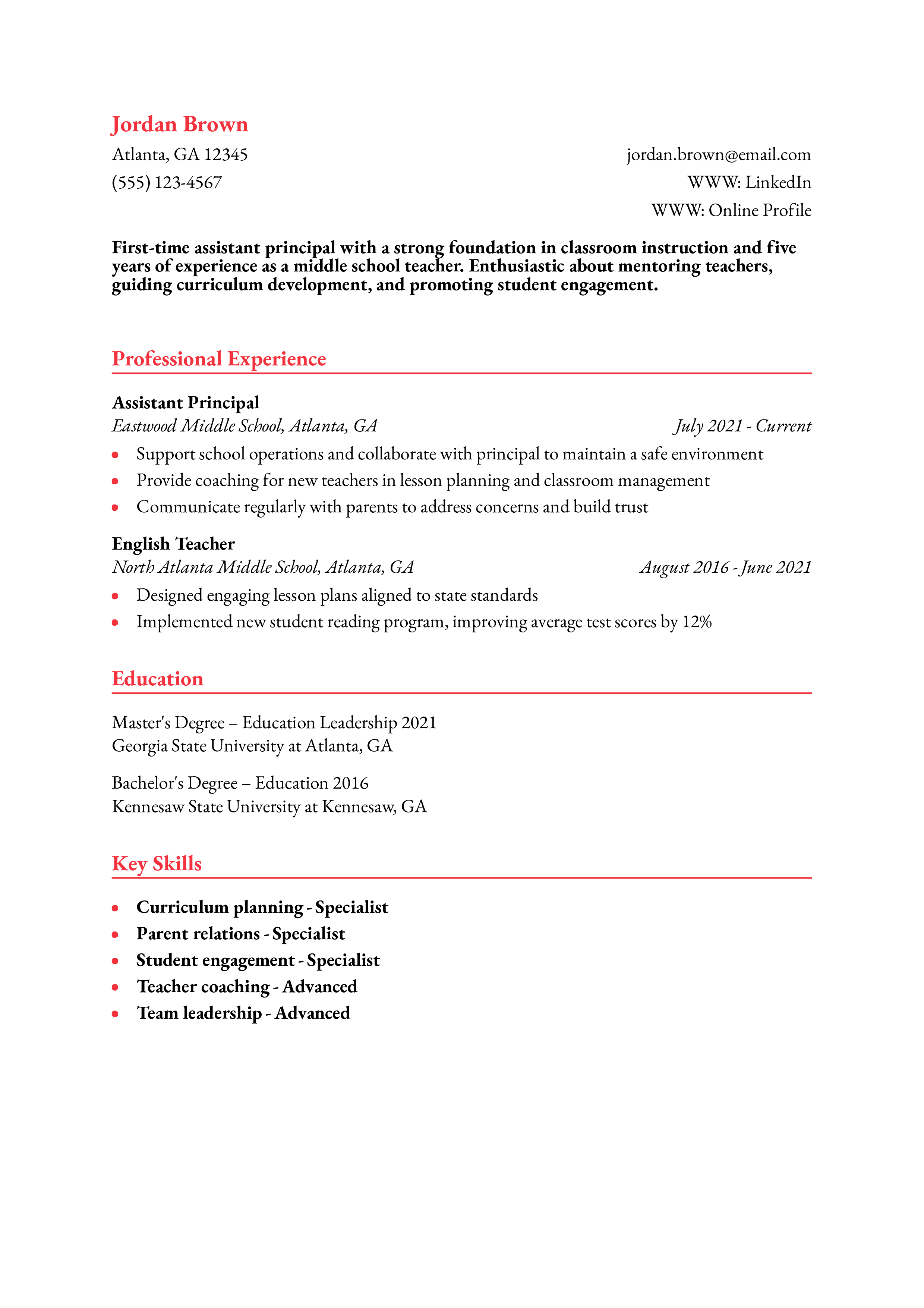 For example, if a school seeks an assistant principal passionate about diversity, equity, and inclusion (DEI), emphasize your background in establishing inclusive school communities and safe student learning environments. If an organization is seeking a candidate with a vast knowledge of teaching methodologies, you might feature your knowledge of differentiated instruction or student-centered learning.