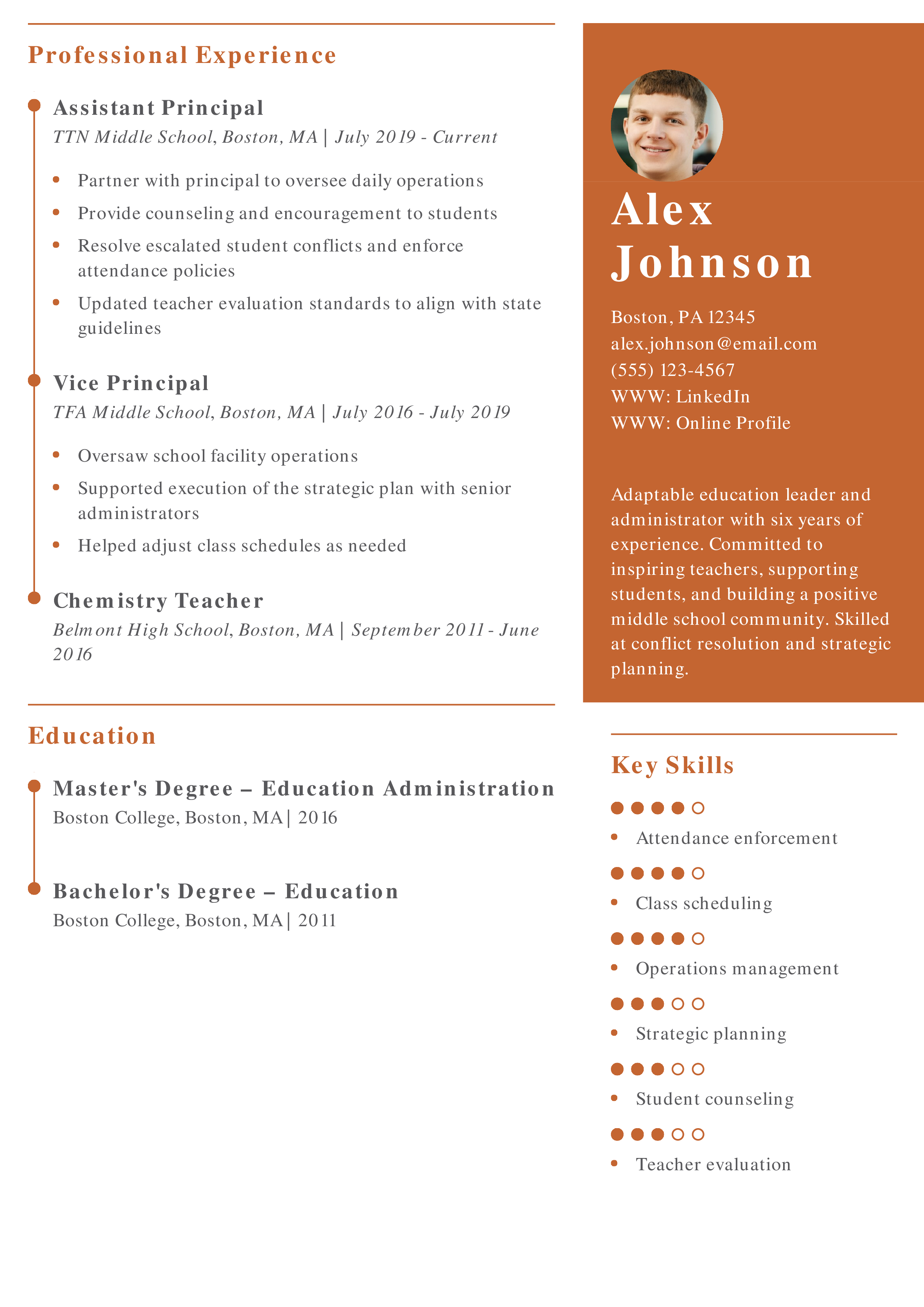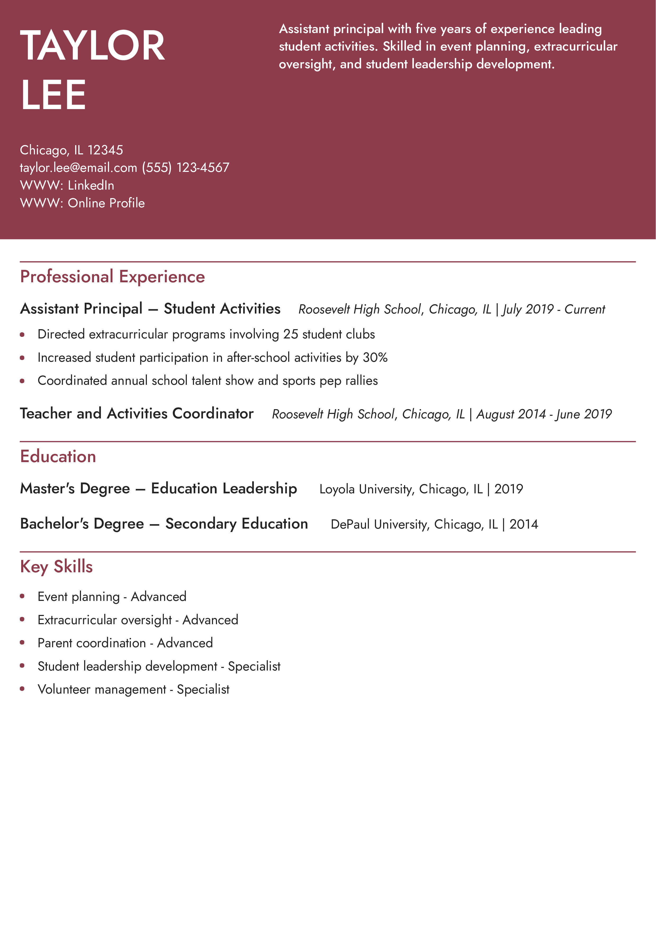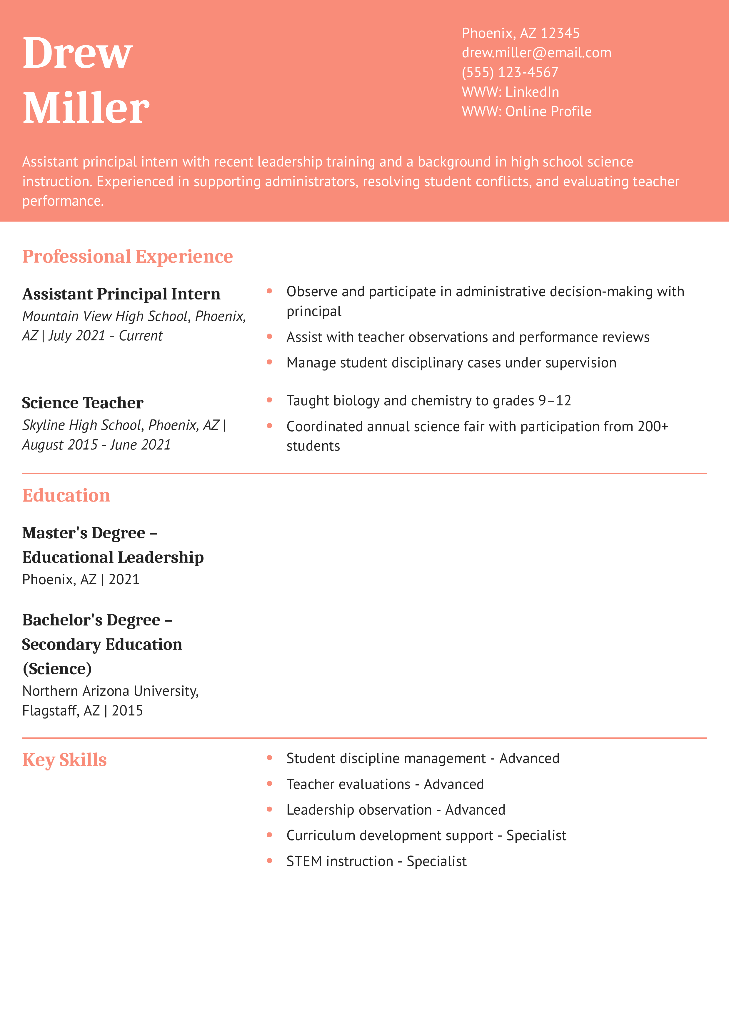 This resume is strong because it blends administrative internship experience with a long teaching track record. It positions the candidate well for a transition into leadership. For insights on showcasing education effectively, see how to list your education on a resume.