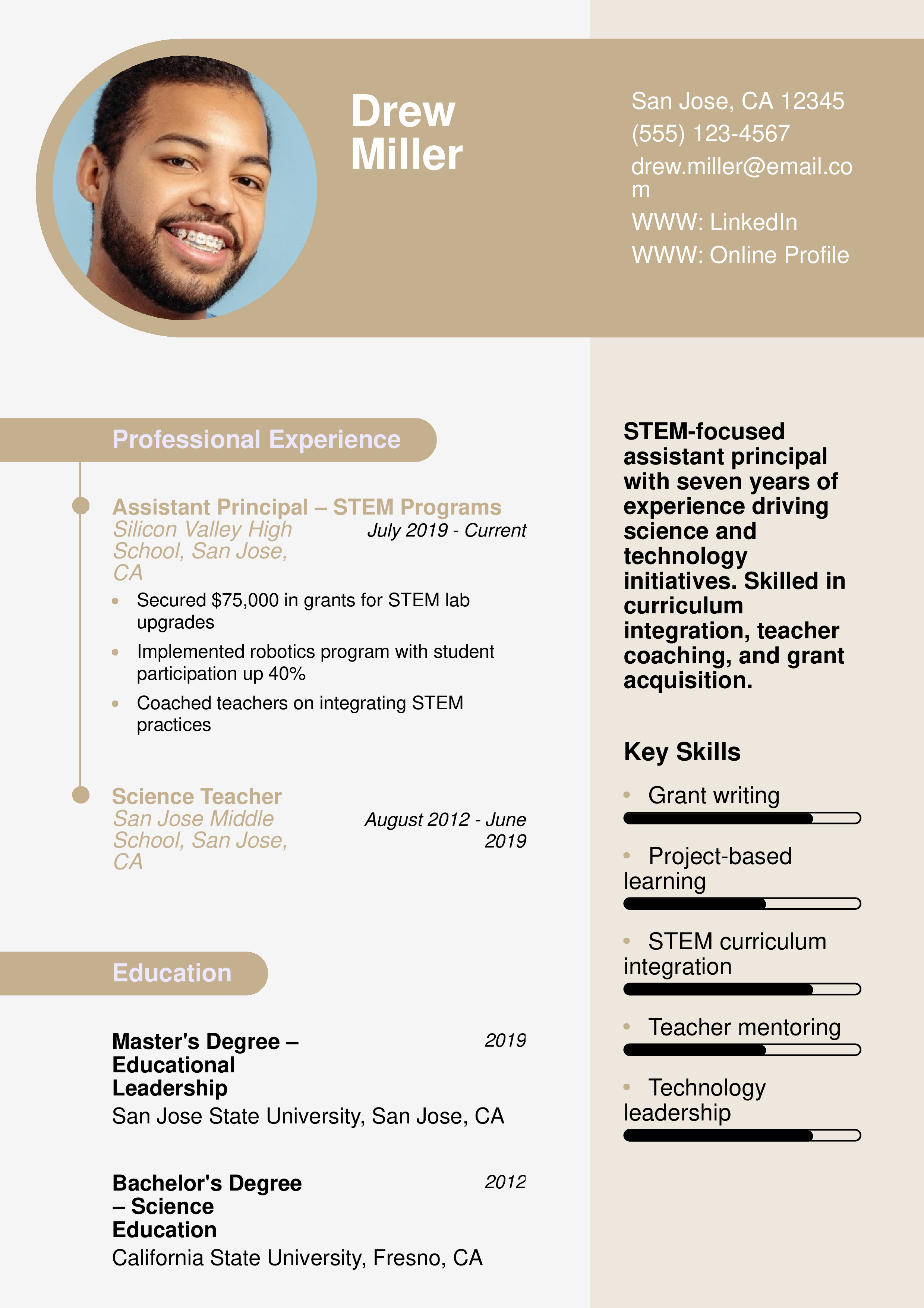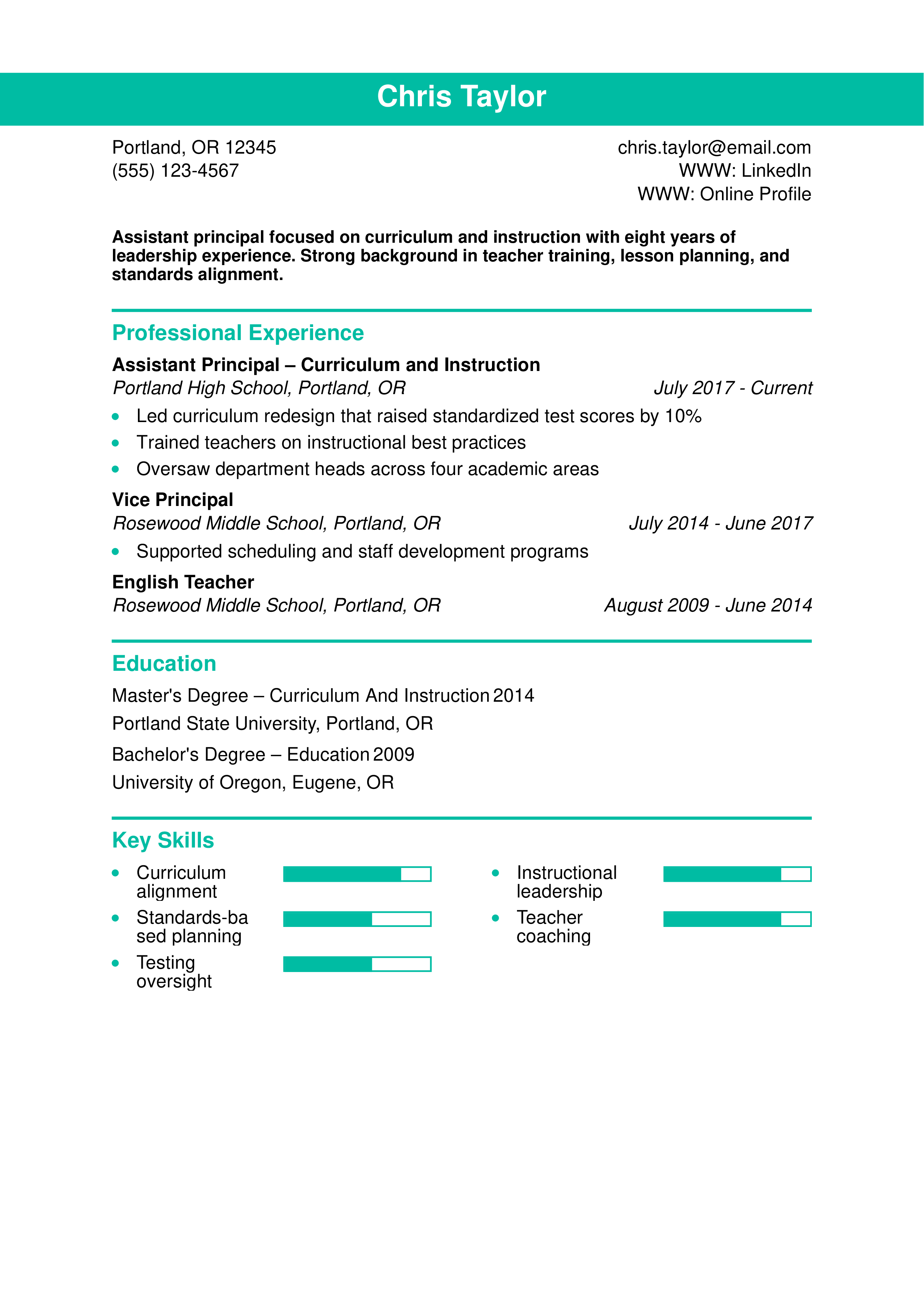 This resume works well because it highlights measurable improvements in test scores while demonstrating curriculum leadership. To refine how to present career progression like this, review CV vs. resume.